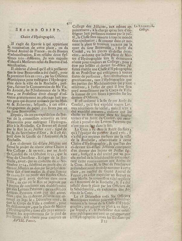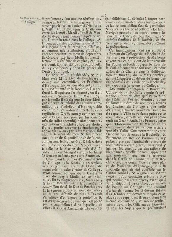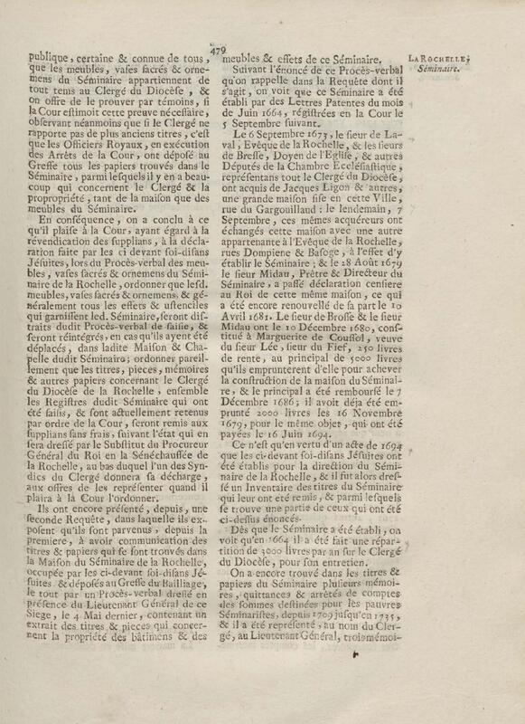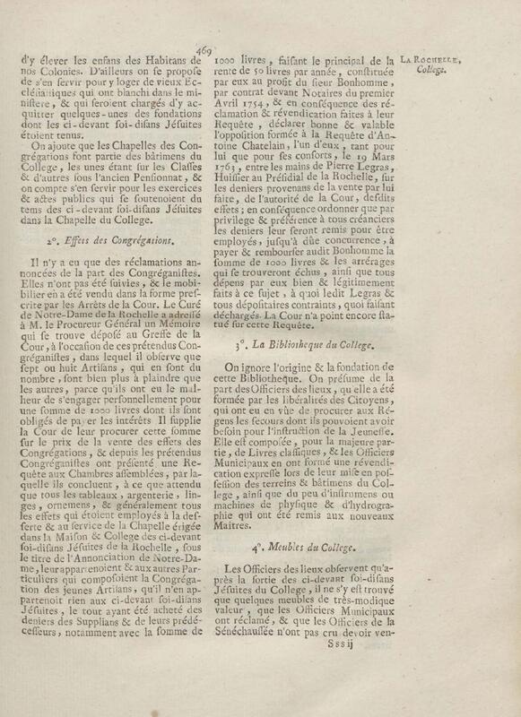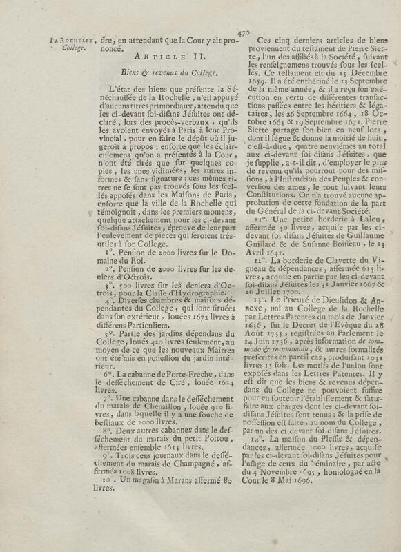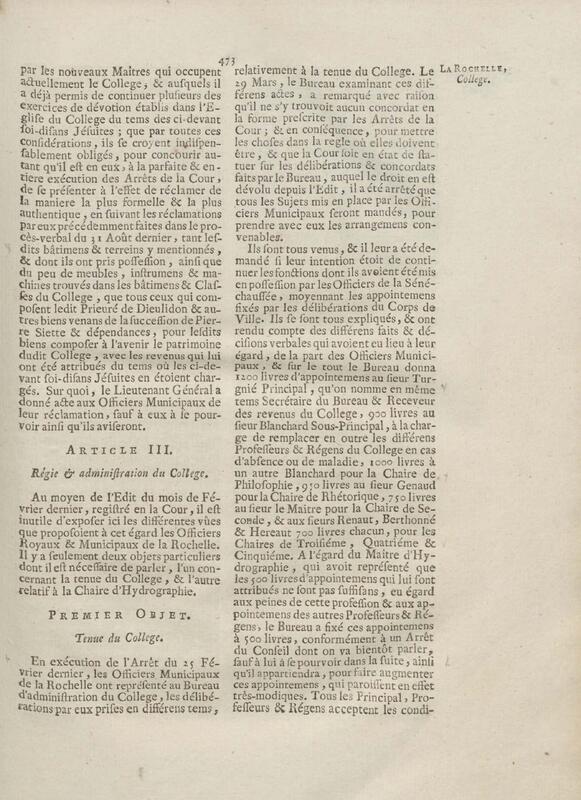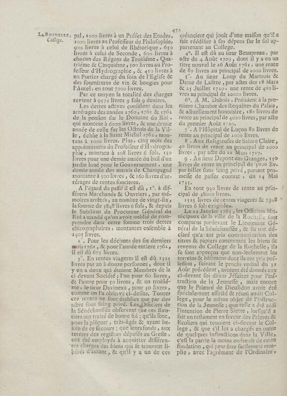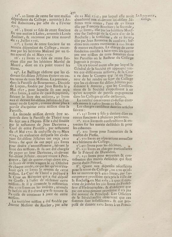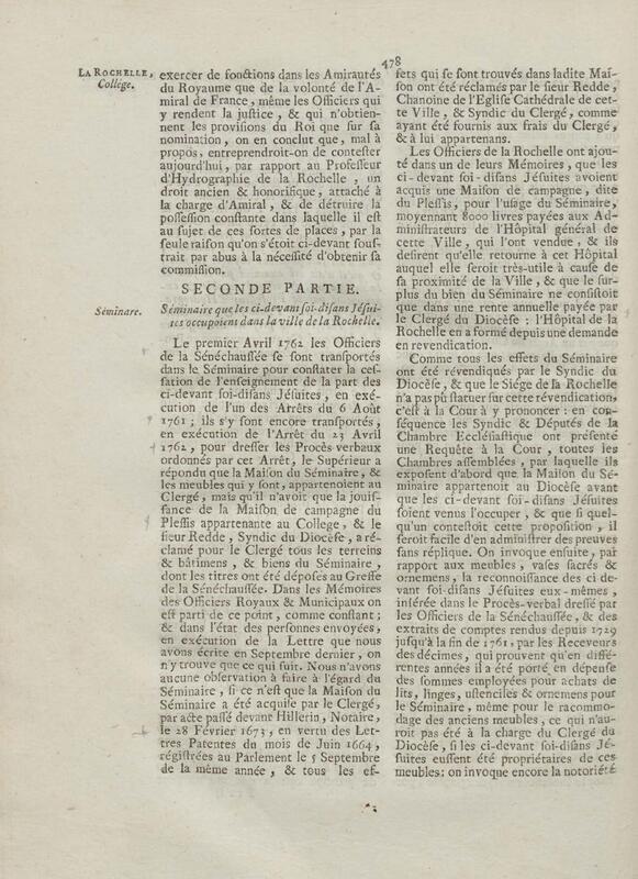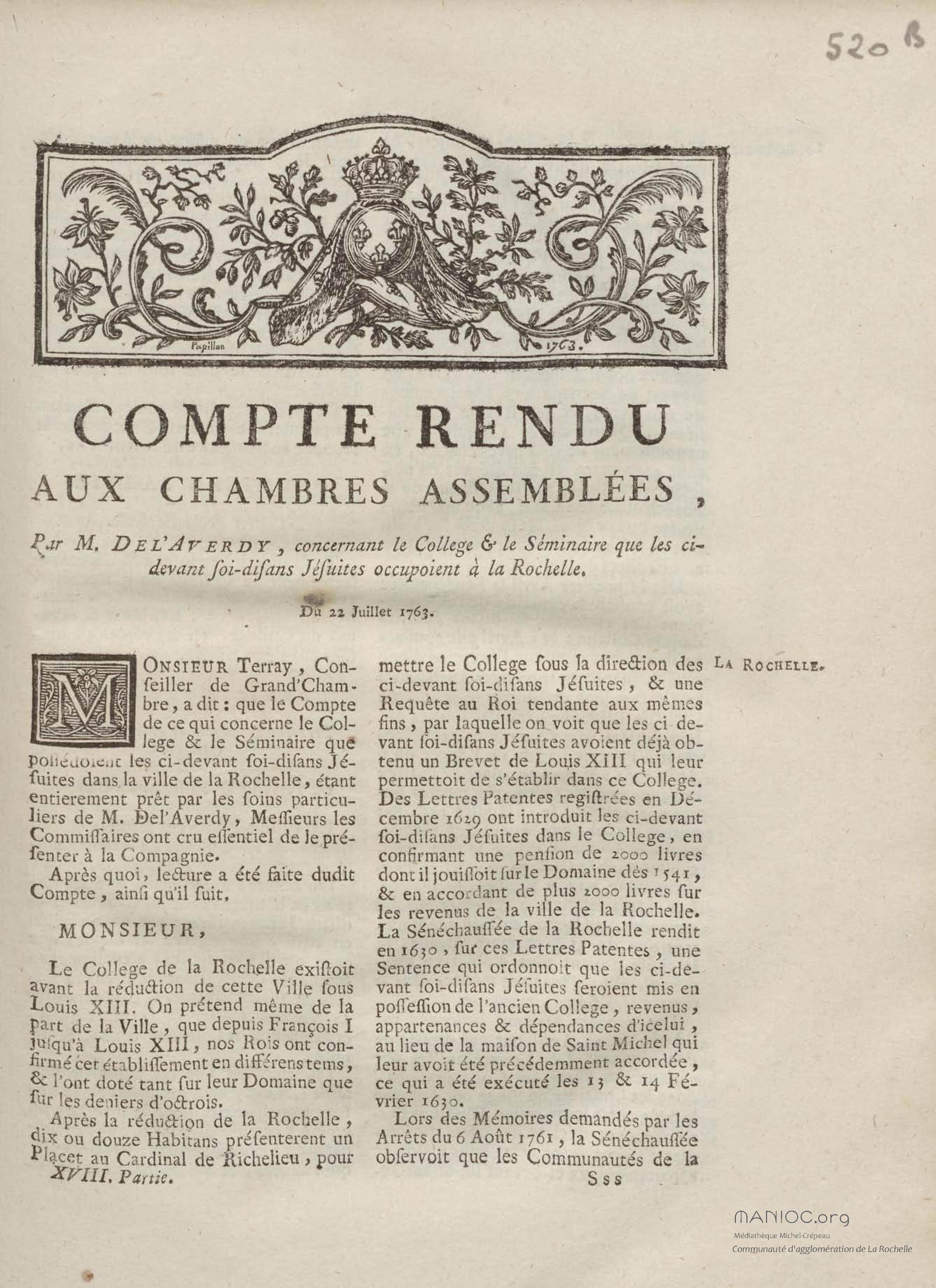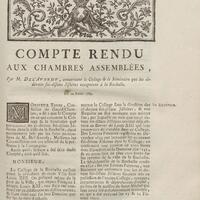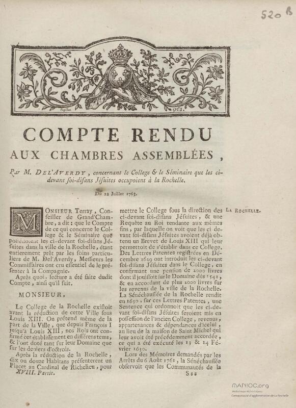 - Compte rendu aux chambres assemblées, par M. Del'Averdy, concernant le College & le Séminaire que les ci-devant soi-disant Jésuites occupoient à la Rochelle
