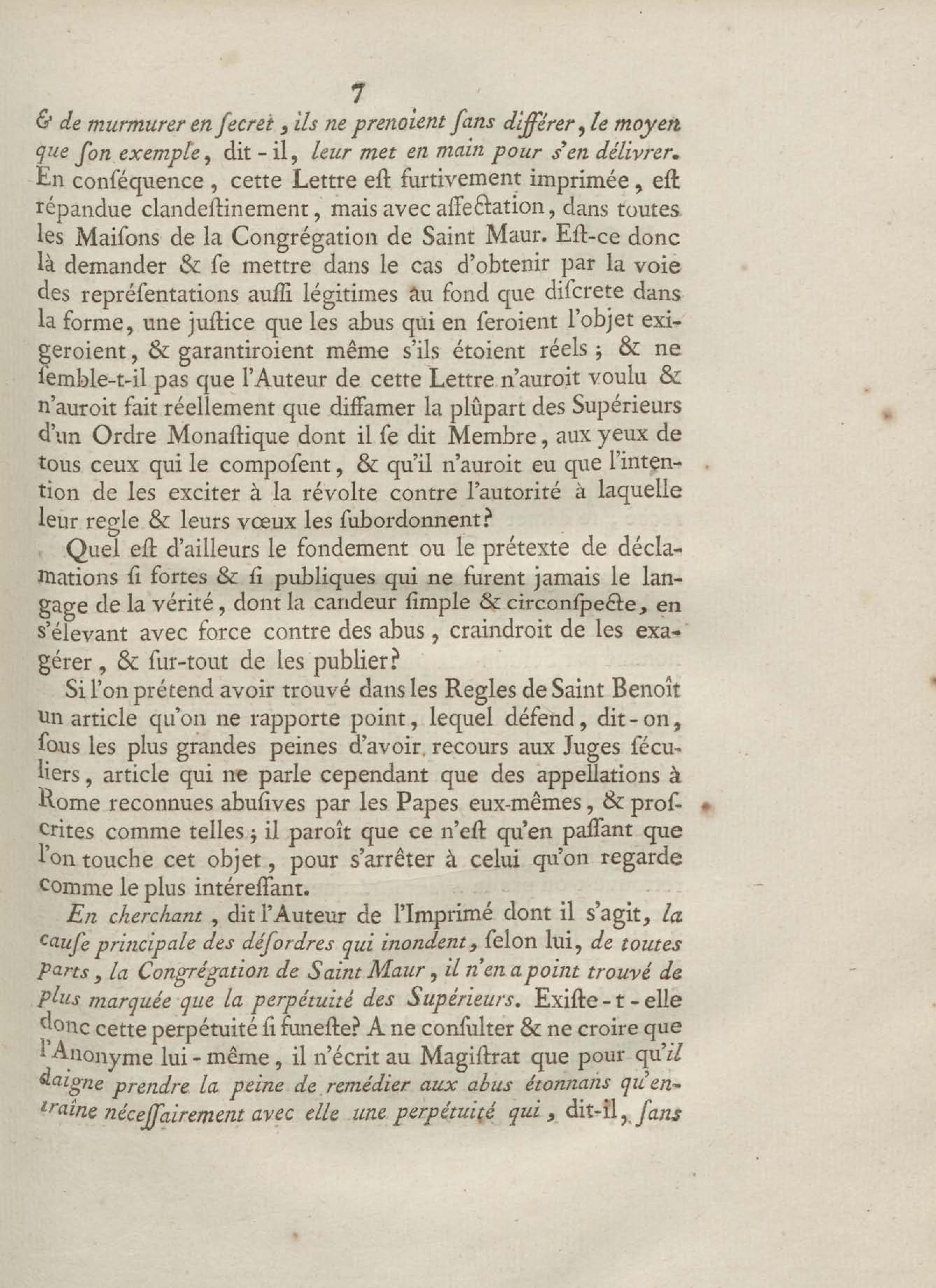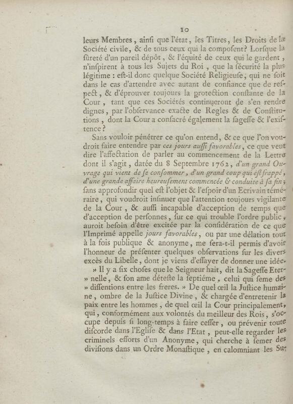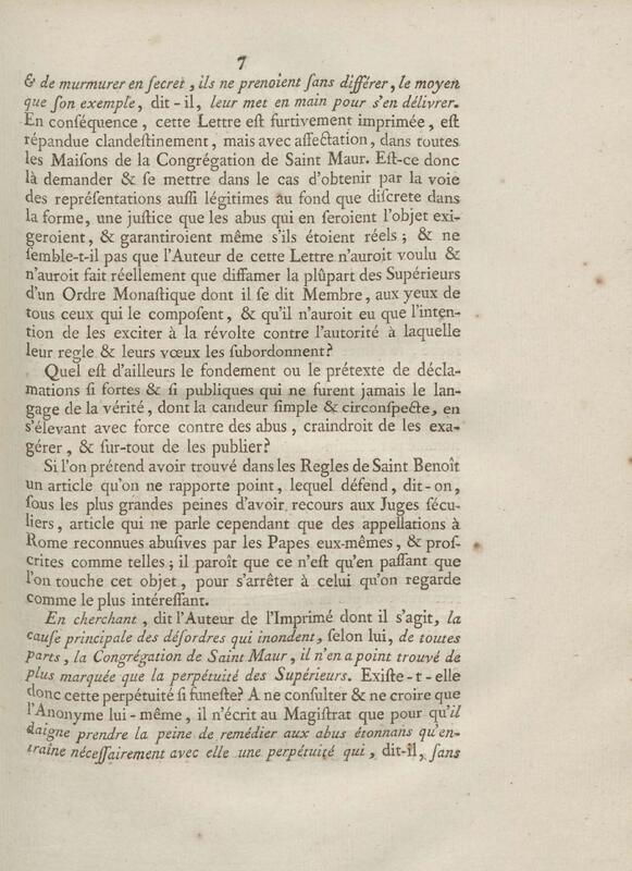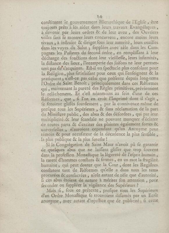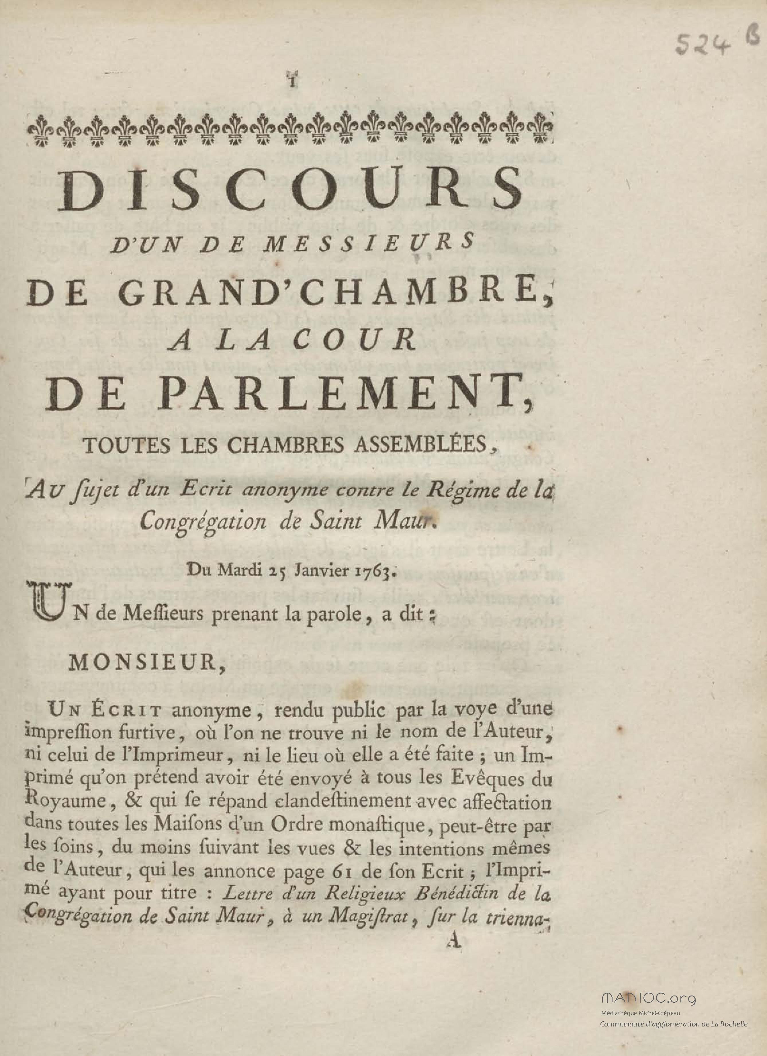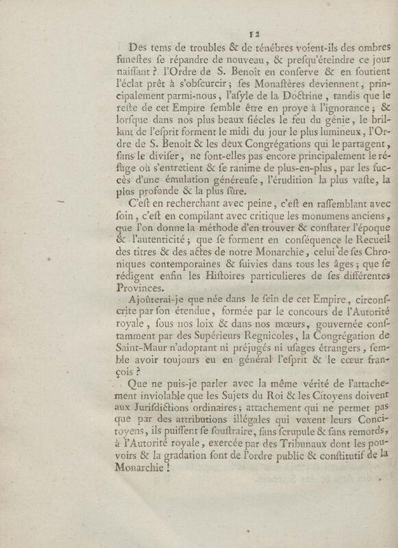 - Discours d'un de messieurs de grand'chambre, à la cour de parlement, toutes les chambres assemblées, au sujet d'un Ecrit anonyme contre le Régime de la Congrégation de Saint Maur