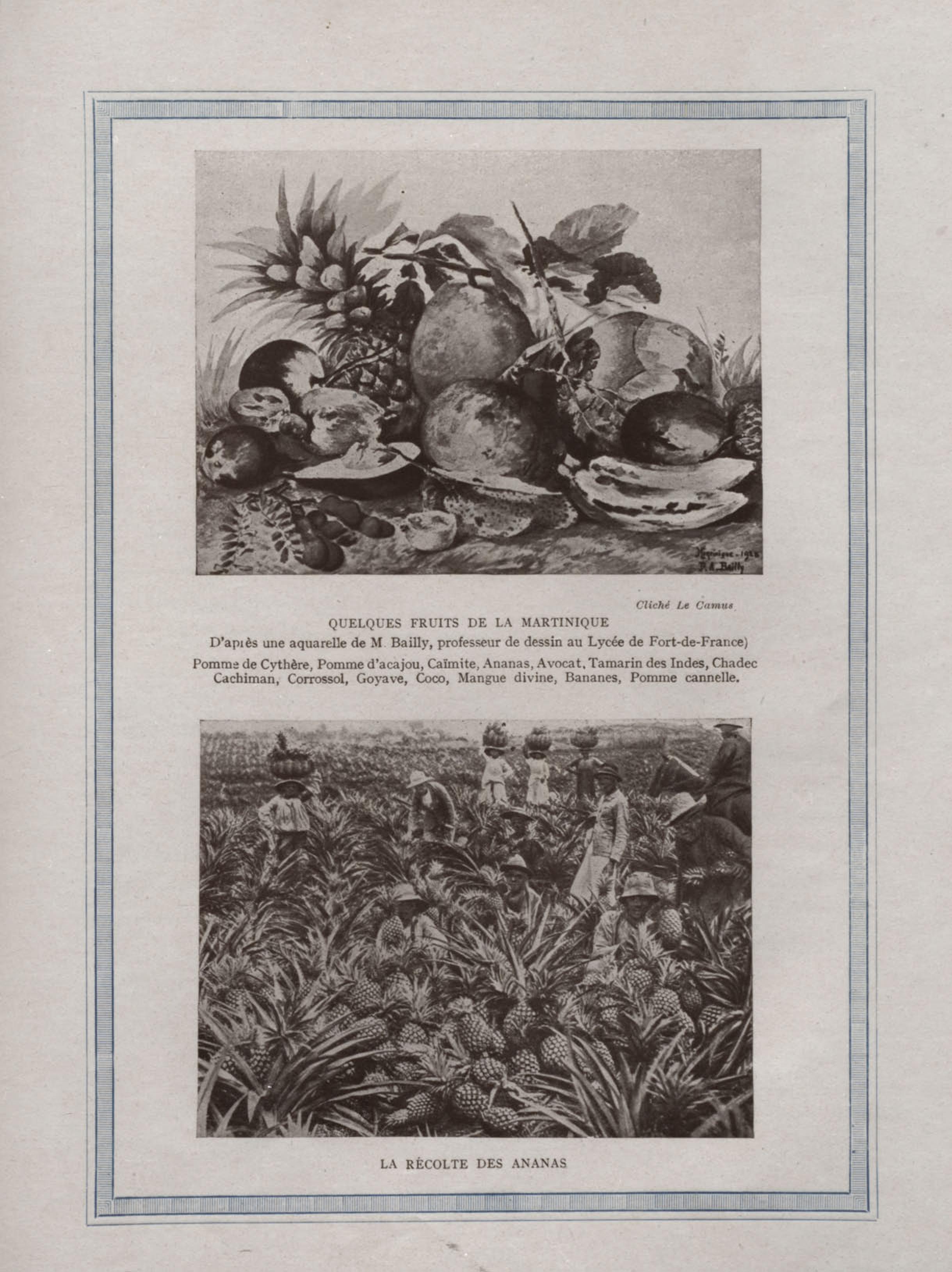 Quelques fruits de la Martinique : pomme de cythère, pomme d'acajou, caïmite, ananas, avocat, tamarin des Indes, chadec, cachiman, corrossol, goyave, coco, mangue divine, bananes, pomme cannelle . D'après une aquarelle de M. Bailly, professeur de dessin au Lycée de Fort-de-France