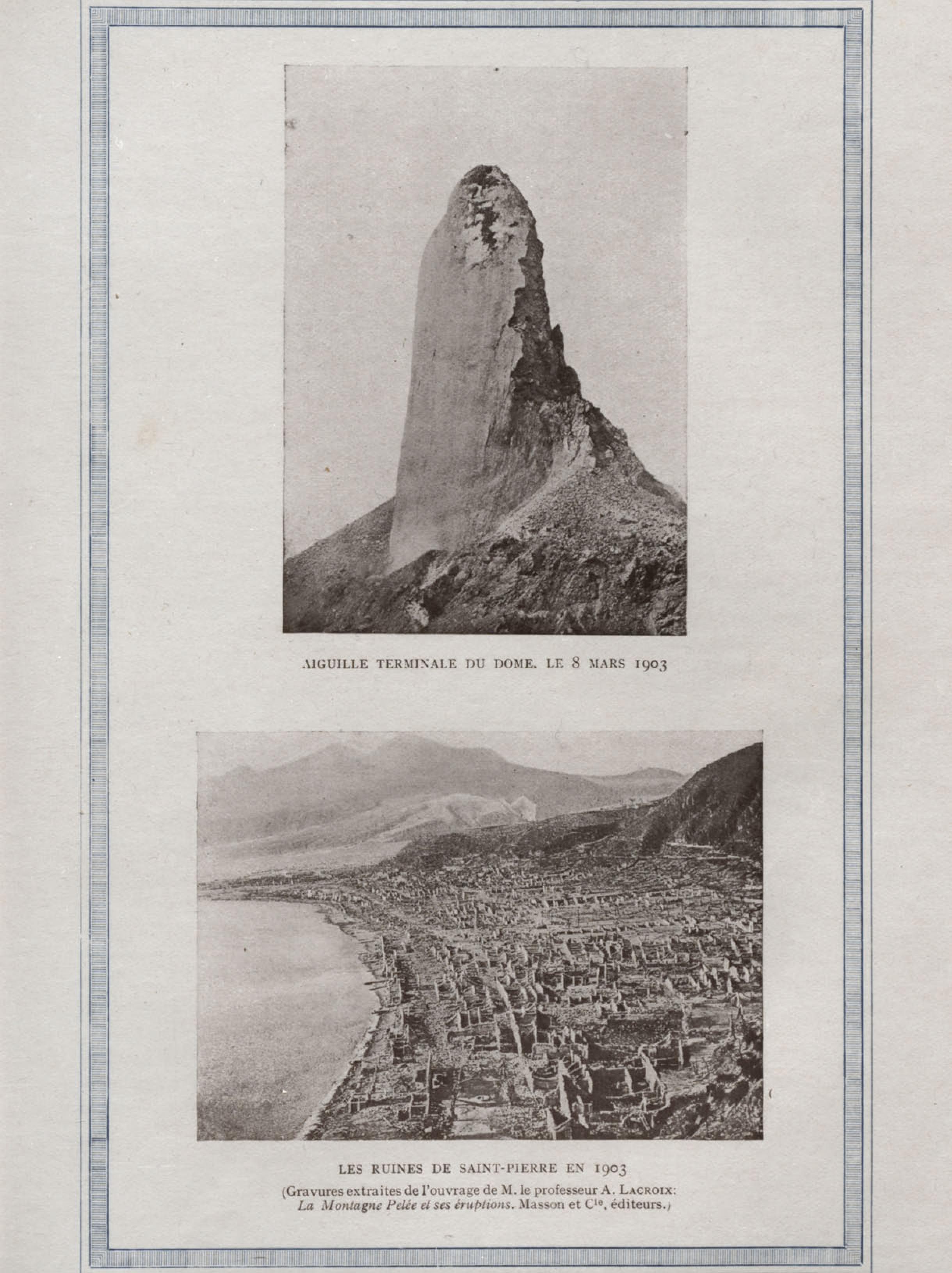 Aiguille terminale du dôme. Le 8 mars 1903 . Gravure extraite de l'ouvrage de M. Lacroix : La Montagne Pelée et ses éruptions Image fixe