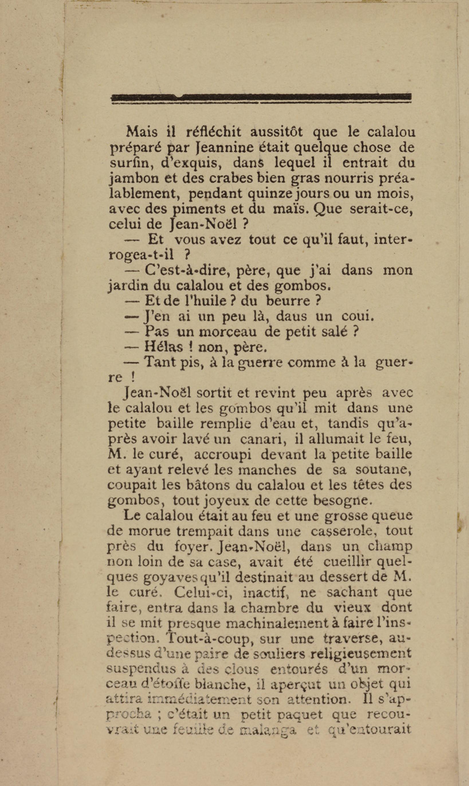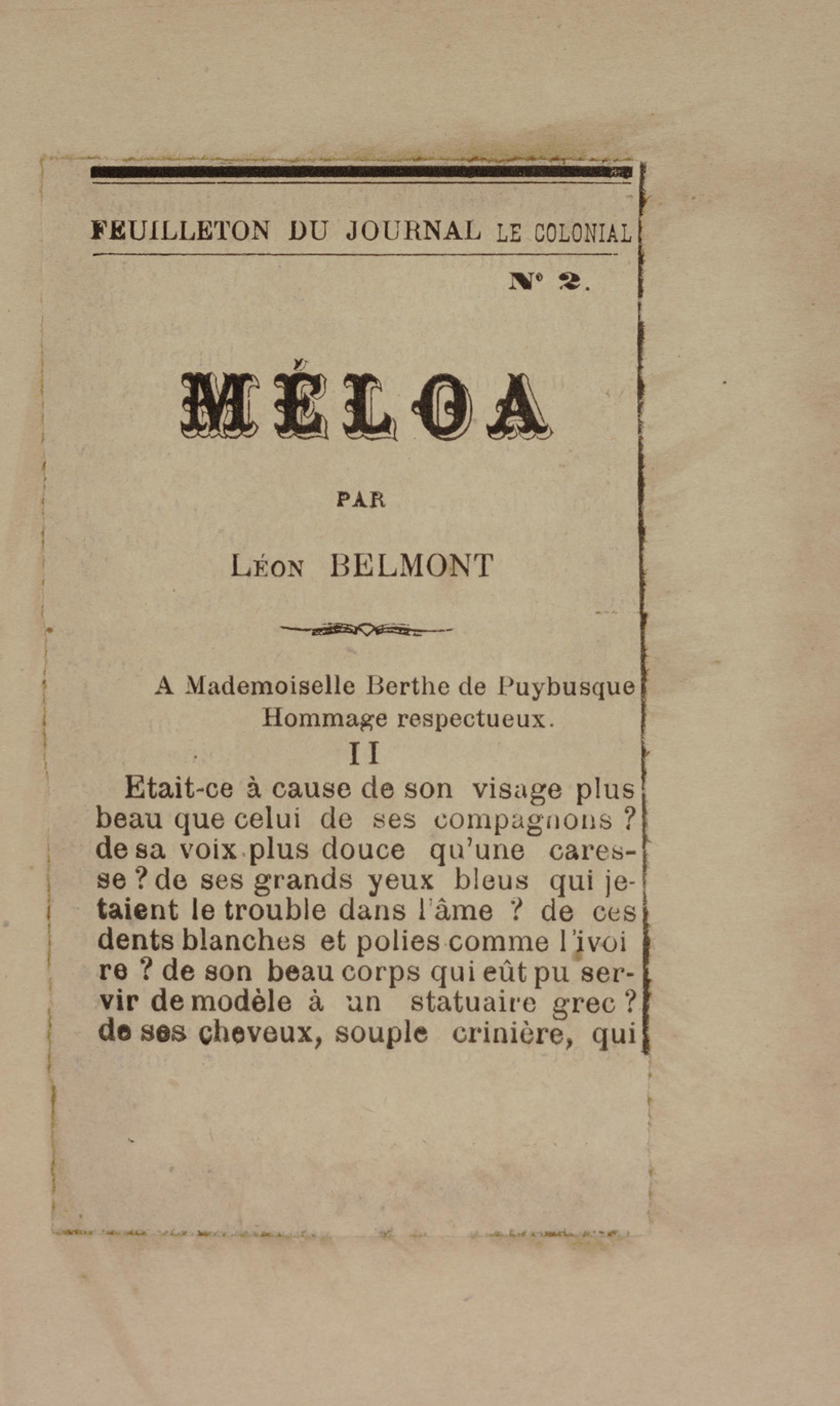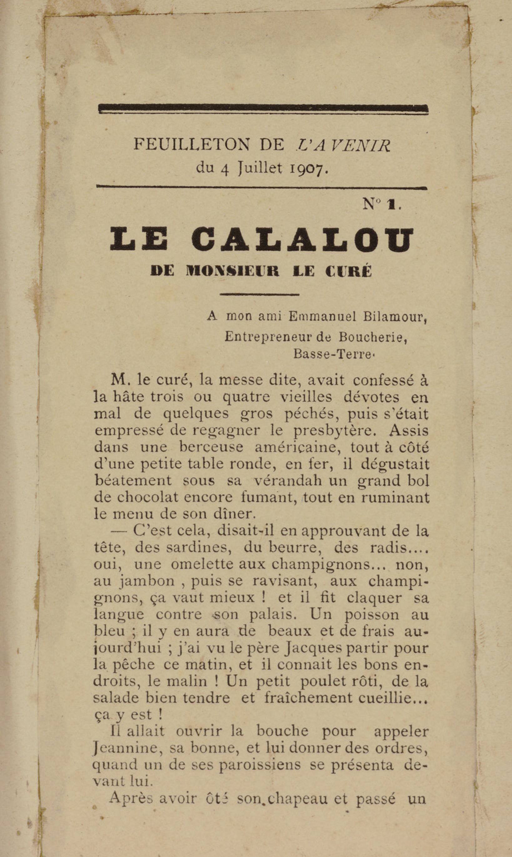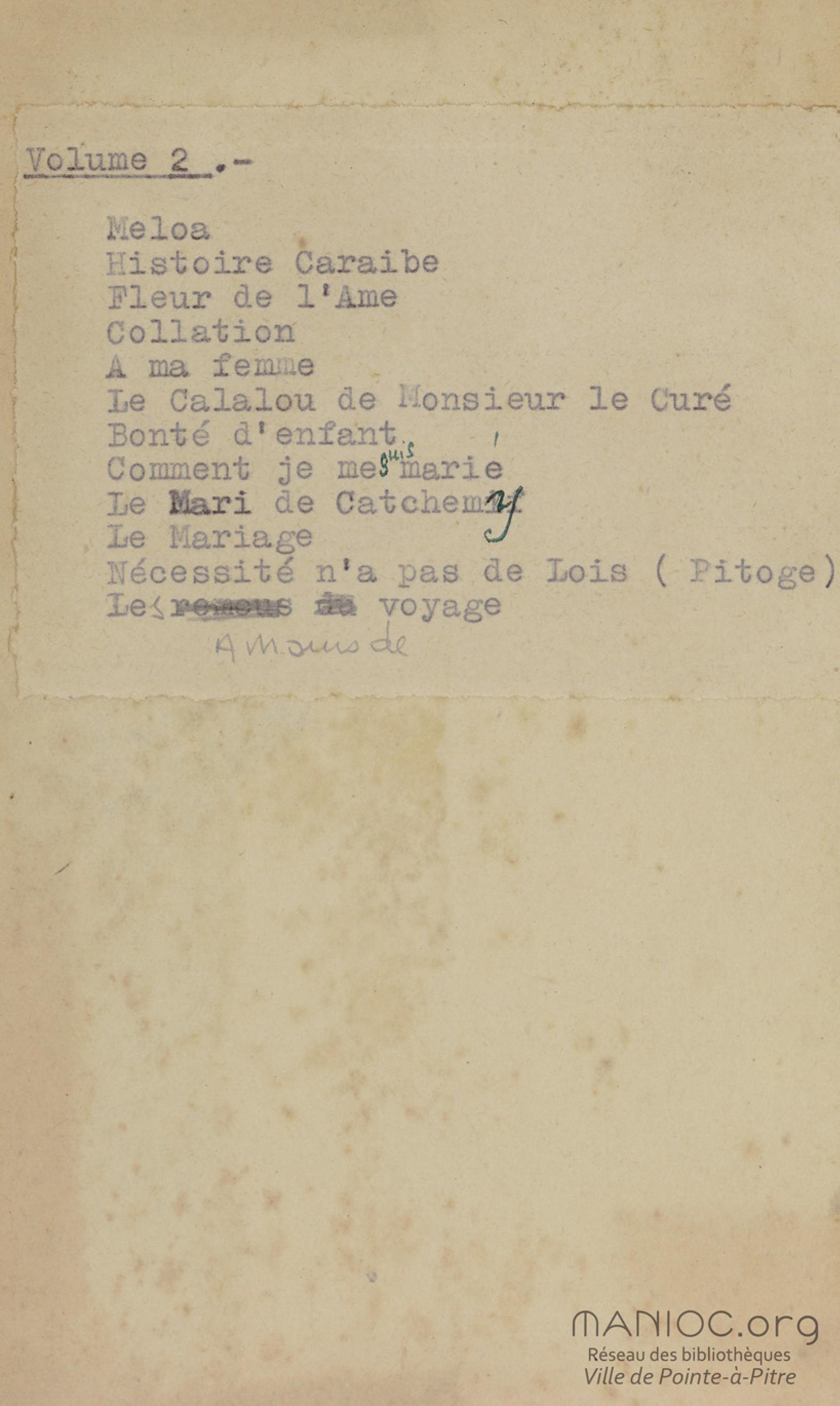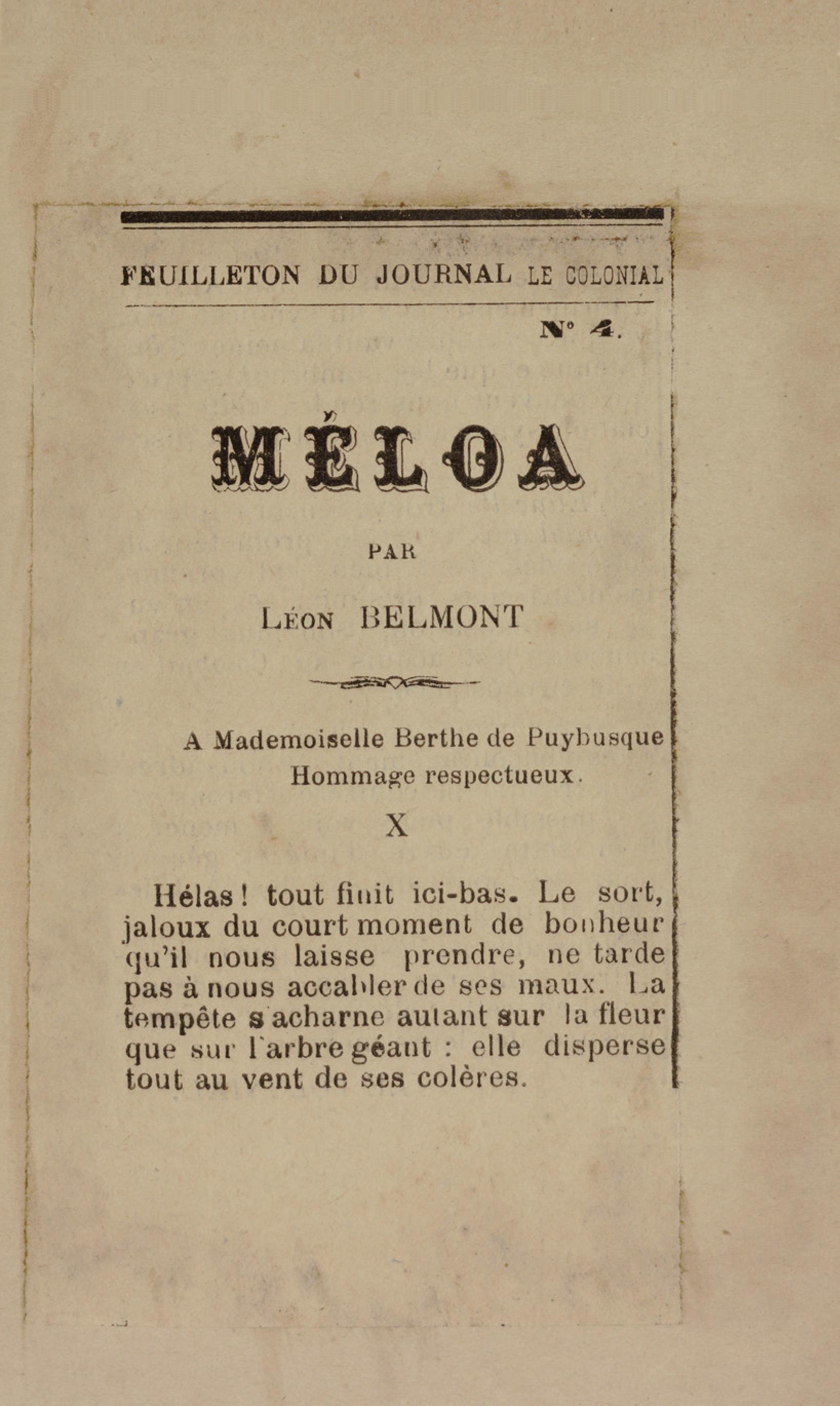 - Contient plusieurs nouvelles et romans-feuilletons publiés par épisodes dans la presse locale, notamment dans les journaux L'Avenir, Le Colonial et L'Union : Méloa. Histoire Caraïbe. Fleur de l’âme. Collation. A ma femme. Le calalou de monsieur le curé. Bonté d'enfant. Comment je me suis marié. Le mari de Latchimy. Le mariage de Jean-Paul Prineau. Nécessité n'a pas de loi. Les amours de voyage.