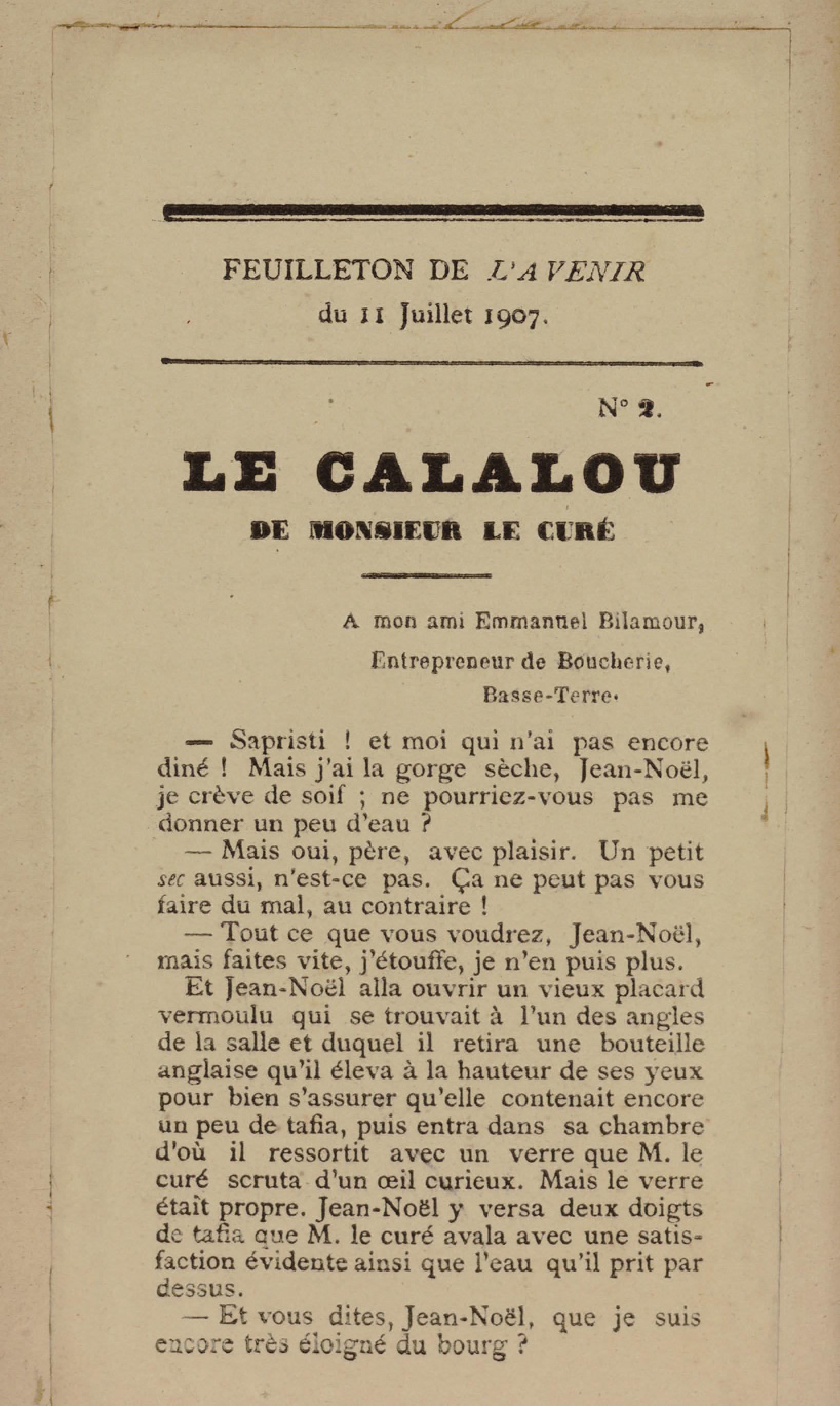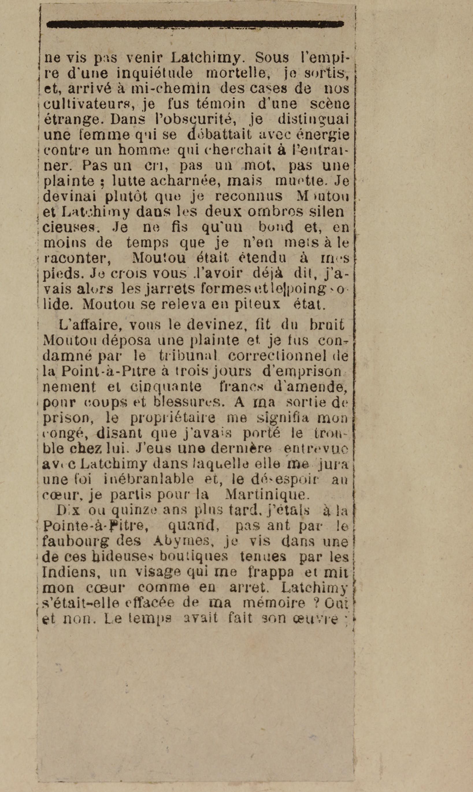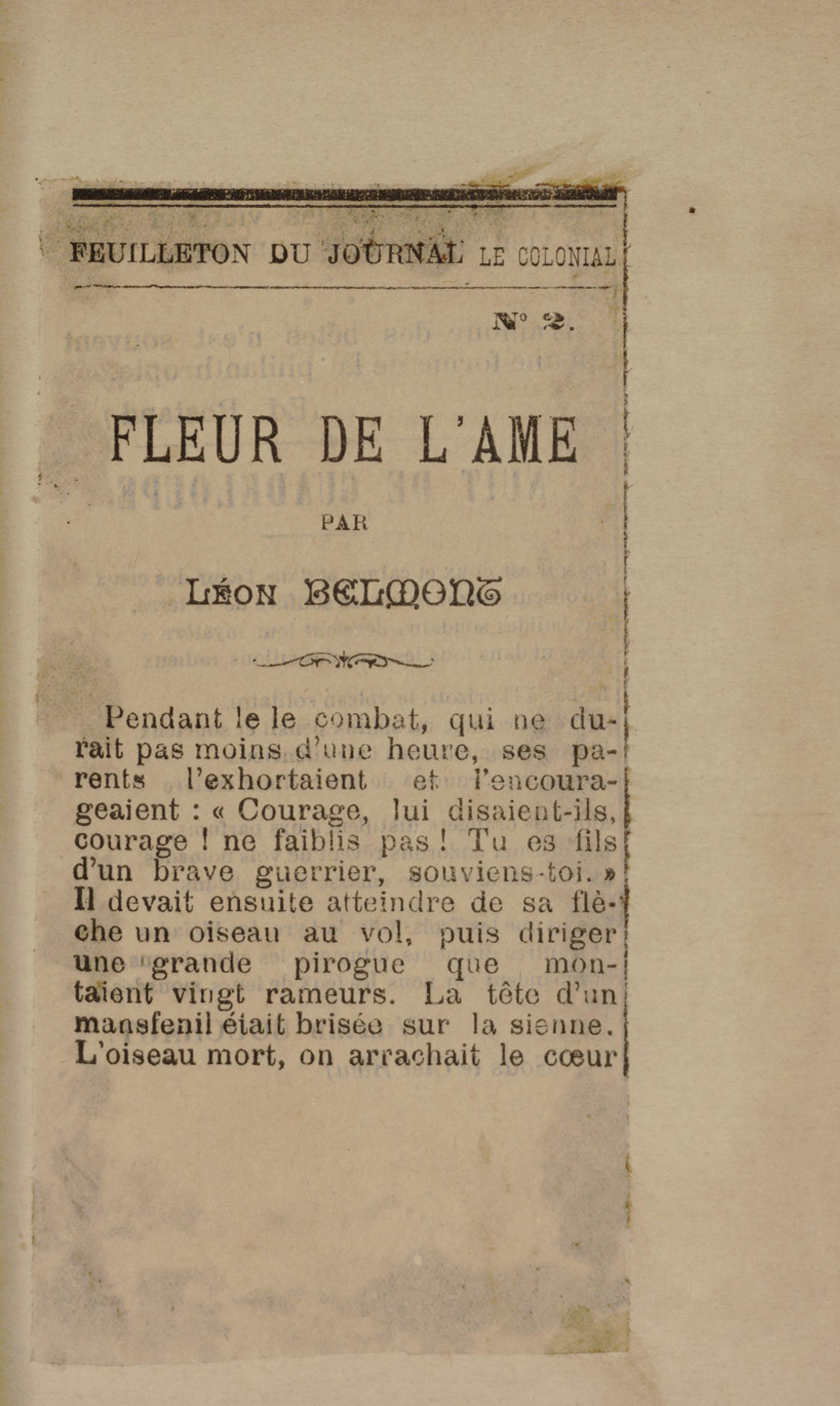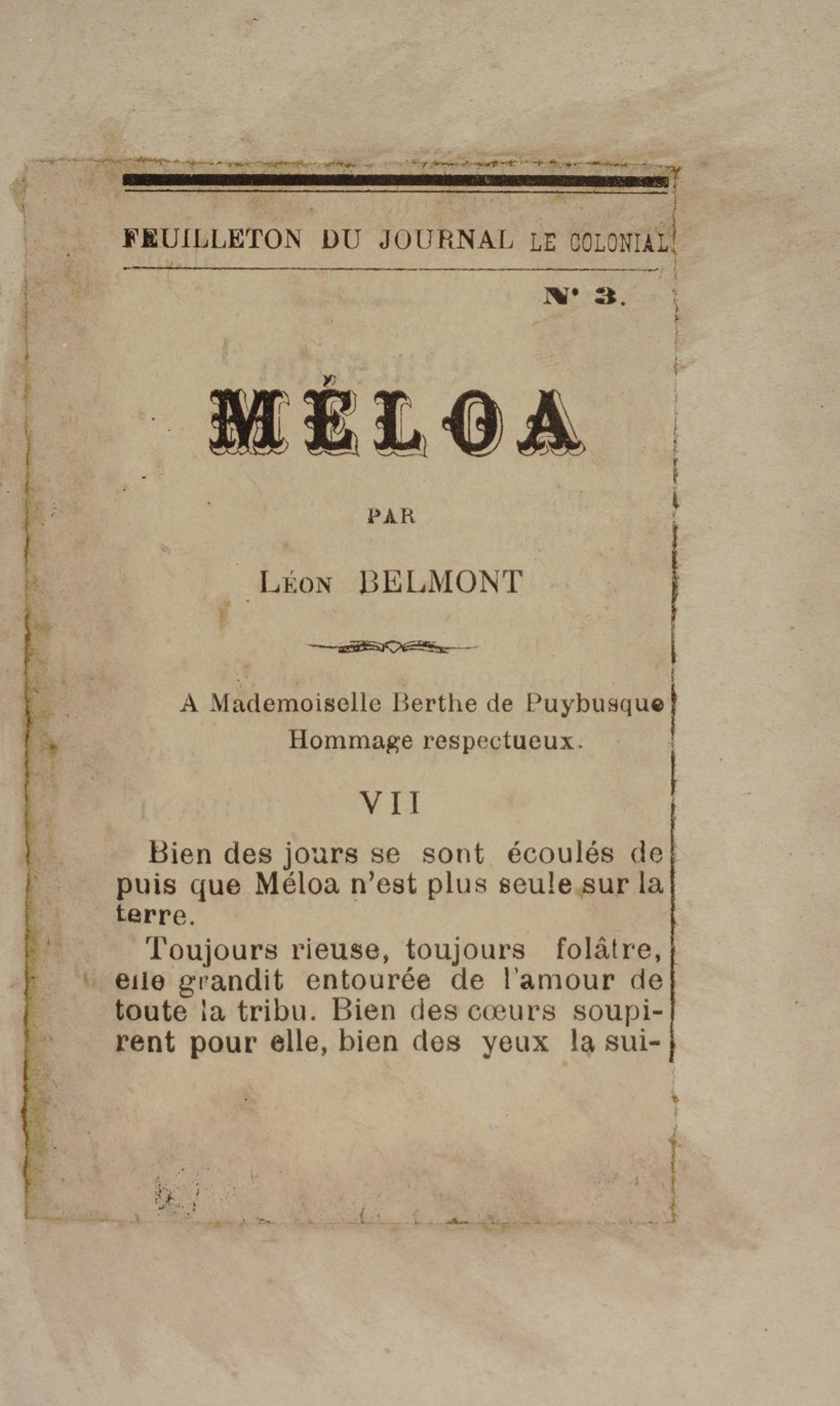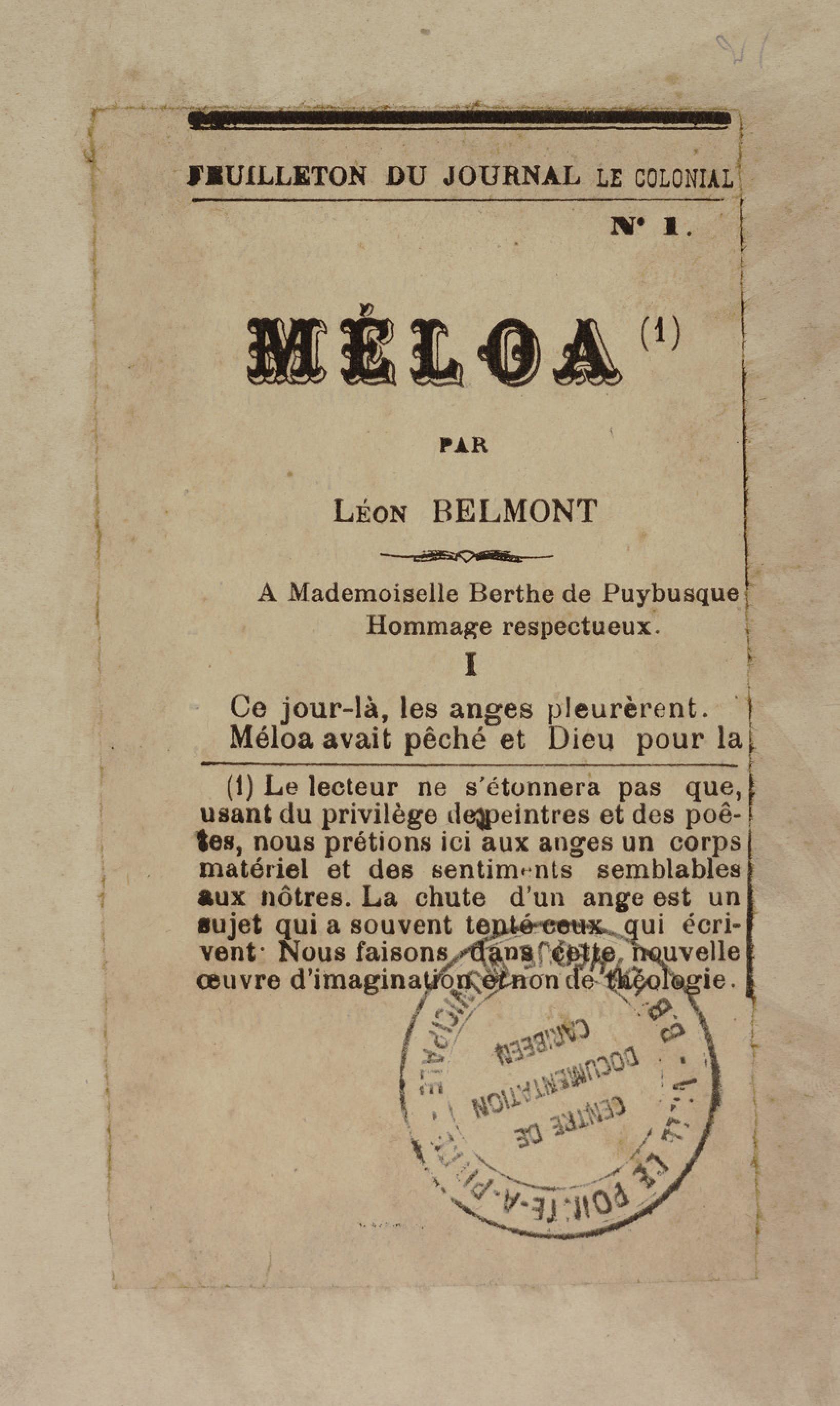 - Contient plusieurs nouvelles et romans-feuilletons publiés par épisodes dans la presse locale, notamment dans les journaux L'Avenir, Le Colonial et L'Union : Méloa. Histoire Caraïbe. Fleur de l’âme. Collation. A ma femme. Le calalou de monsieur le curé. Bonté d'enfant. Comment je me suis marié. Le mari de Latchimy. Le mariage de Jean-Paul Prineau. Nécessité n'a pas de loi. Les amours de voyage.
