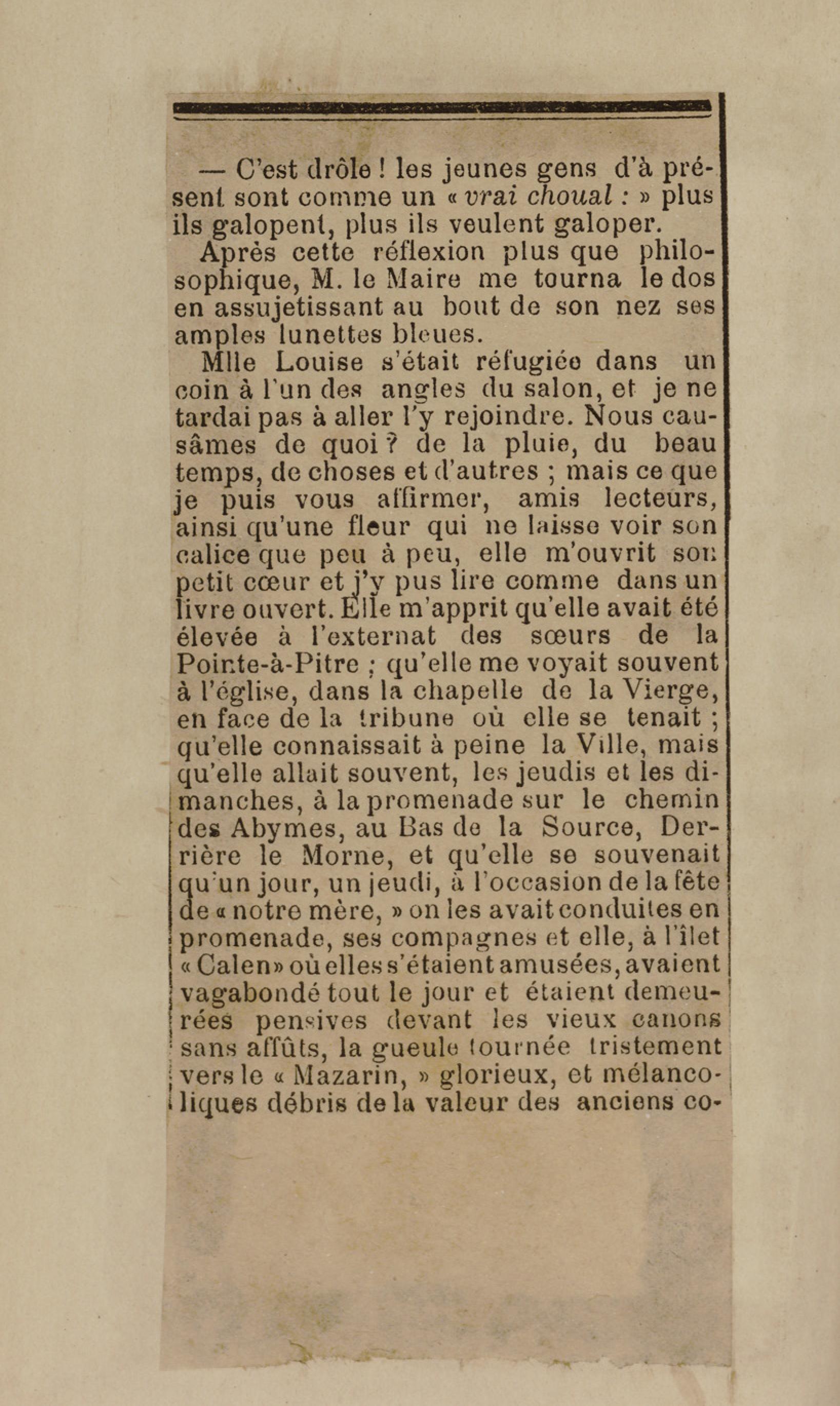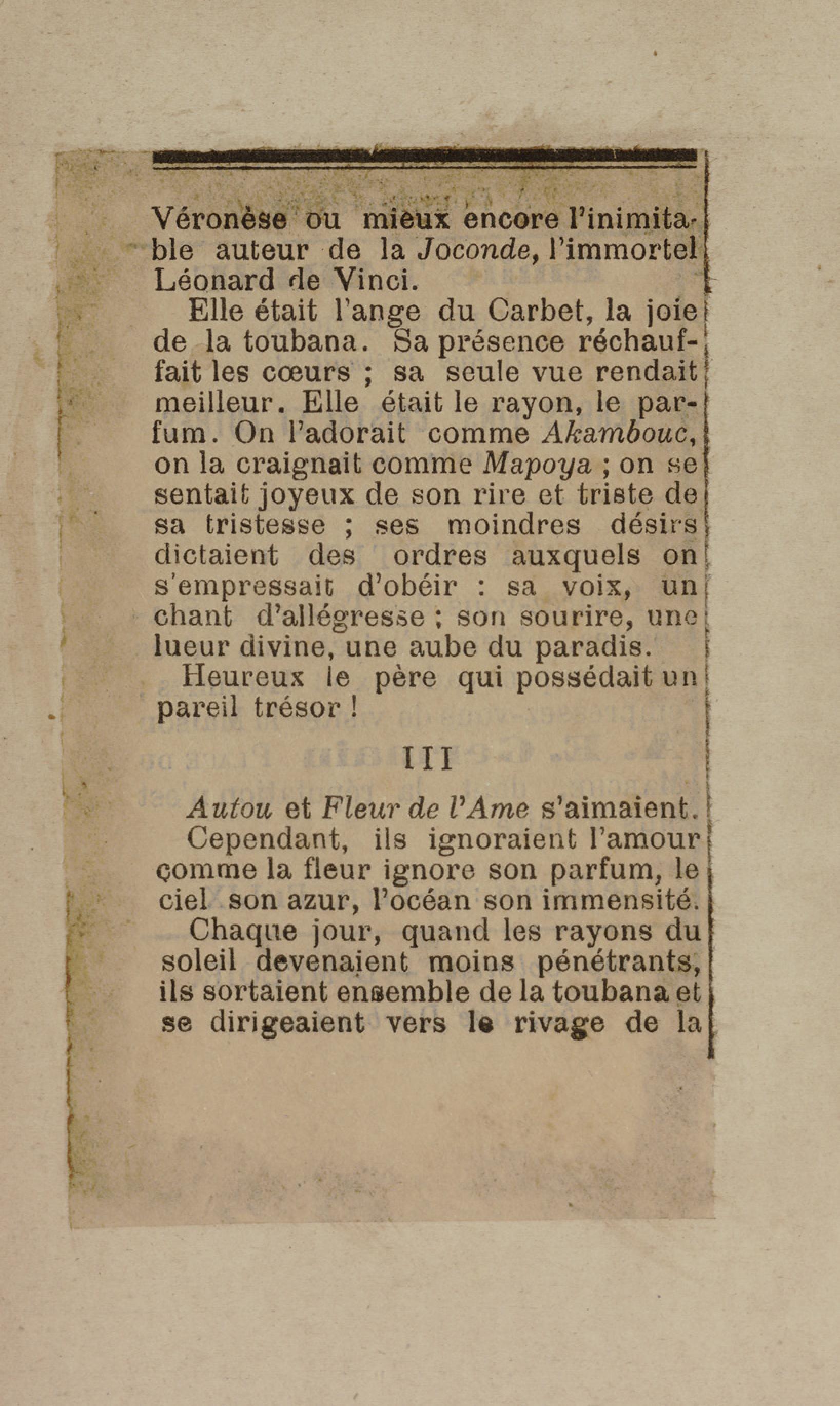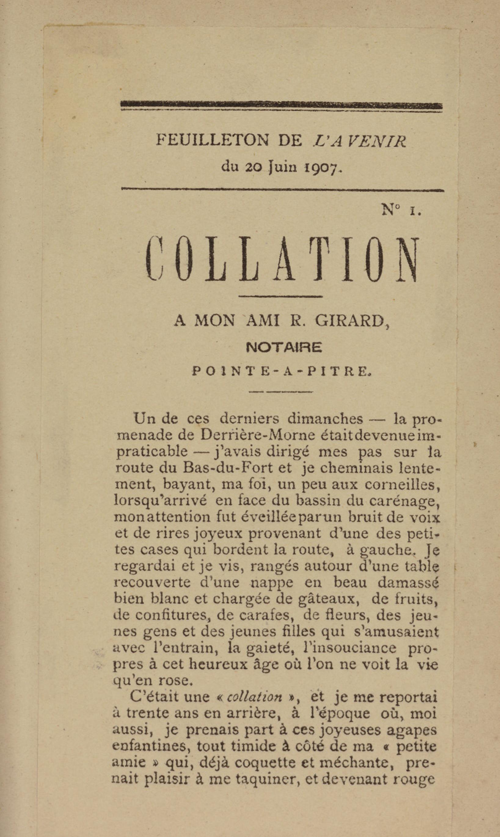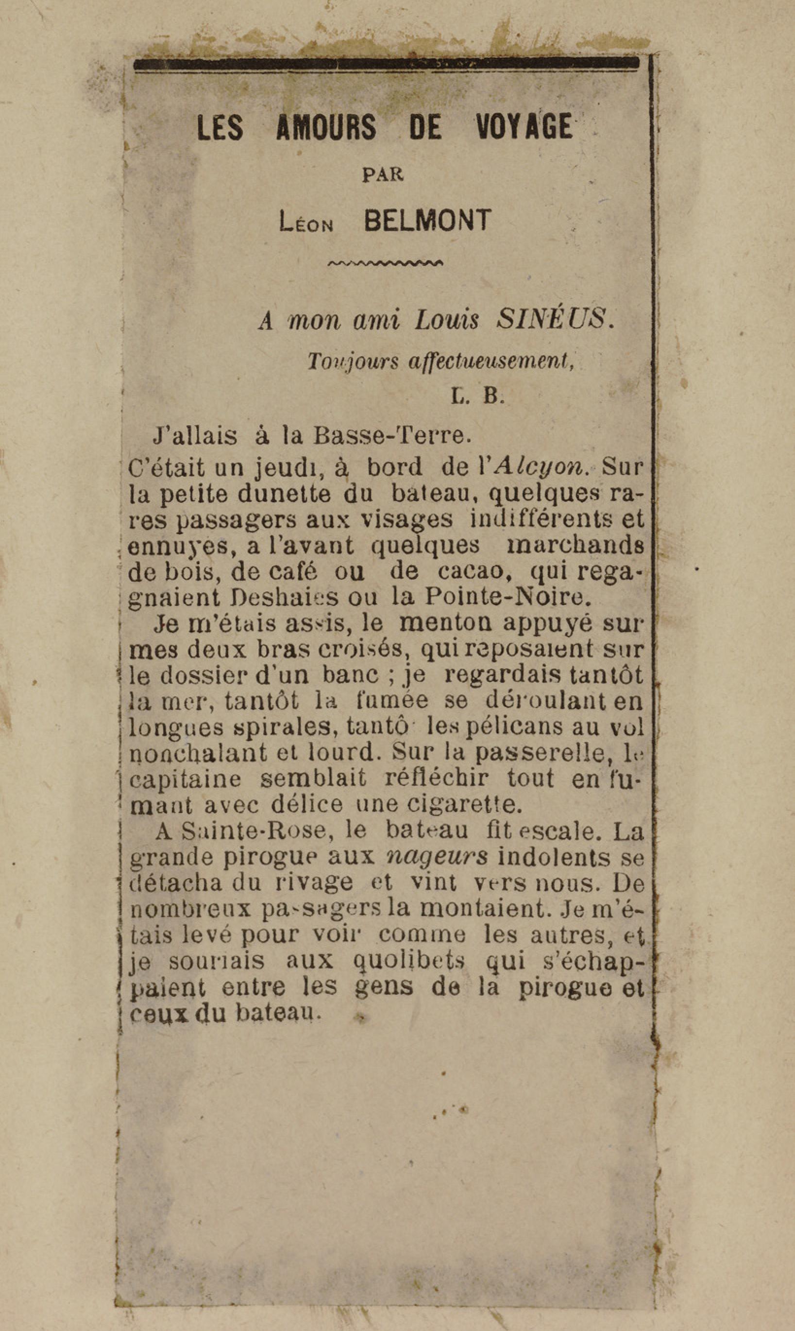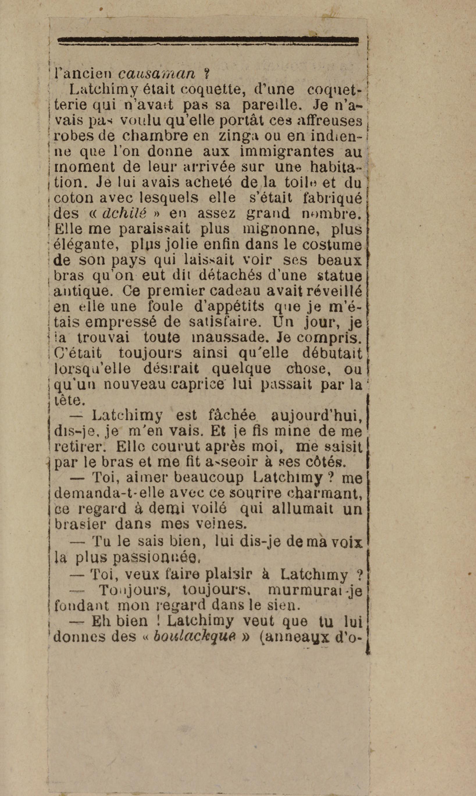 - Contient plusieurs nouvelles et romans-feuilletons publiés par épisodes dans la presse locale, notamment dans les journaux L'Avenir, Le Colonial et L'Union : Méloa. Histoire Caraïbe. Fleur de l’âme. Collation. A ma femme. Le calalou de monsieur le curé. Bonté d'enfant. Comment je me suis marié. Le mari de Latchimy. Le mariage de Jean-Paul Prineau. Nécessité n'a pas de loi. Les amours de voyage.