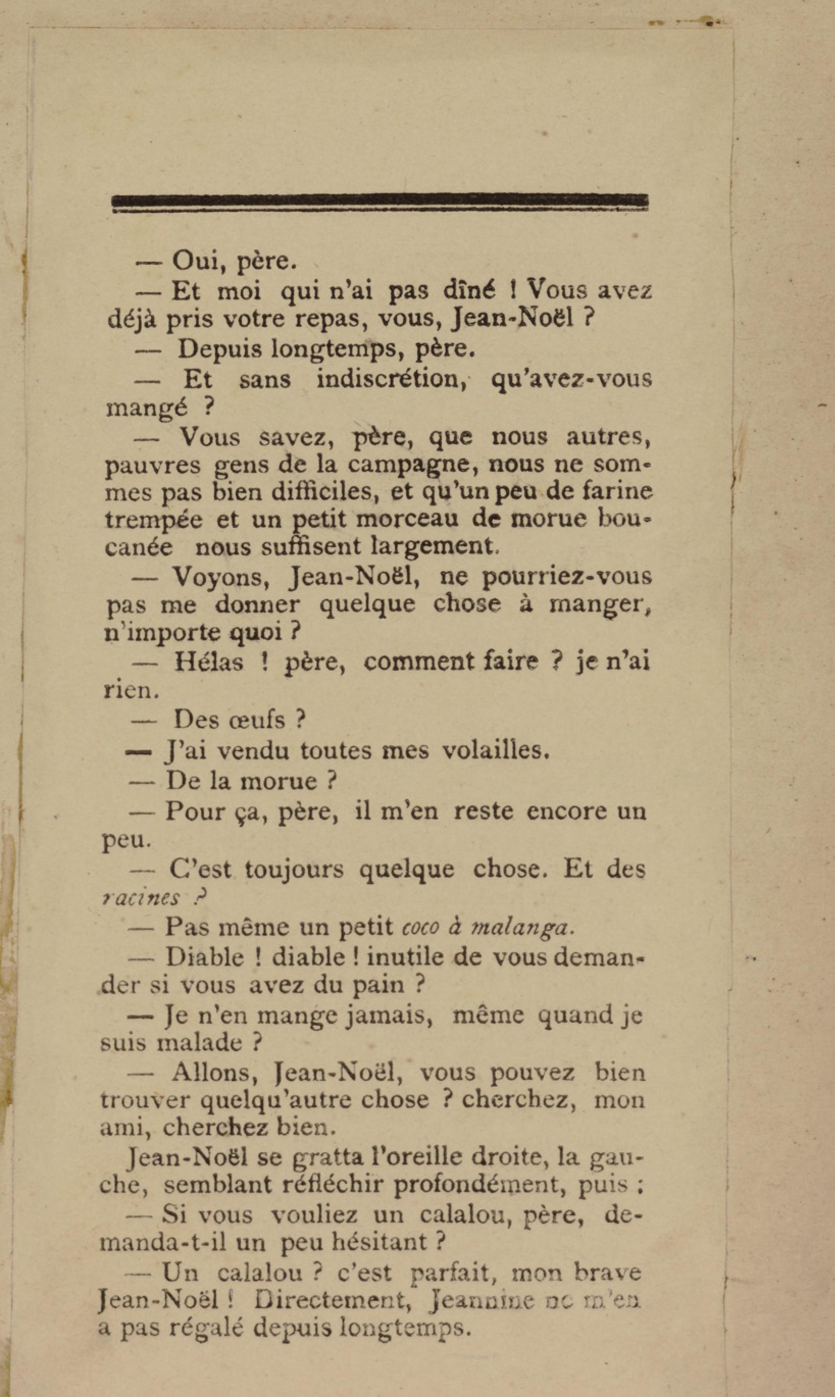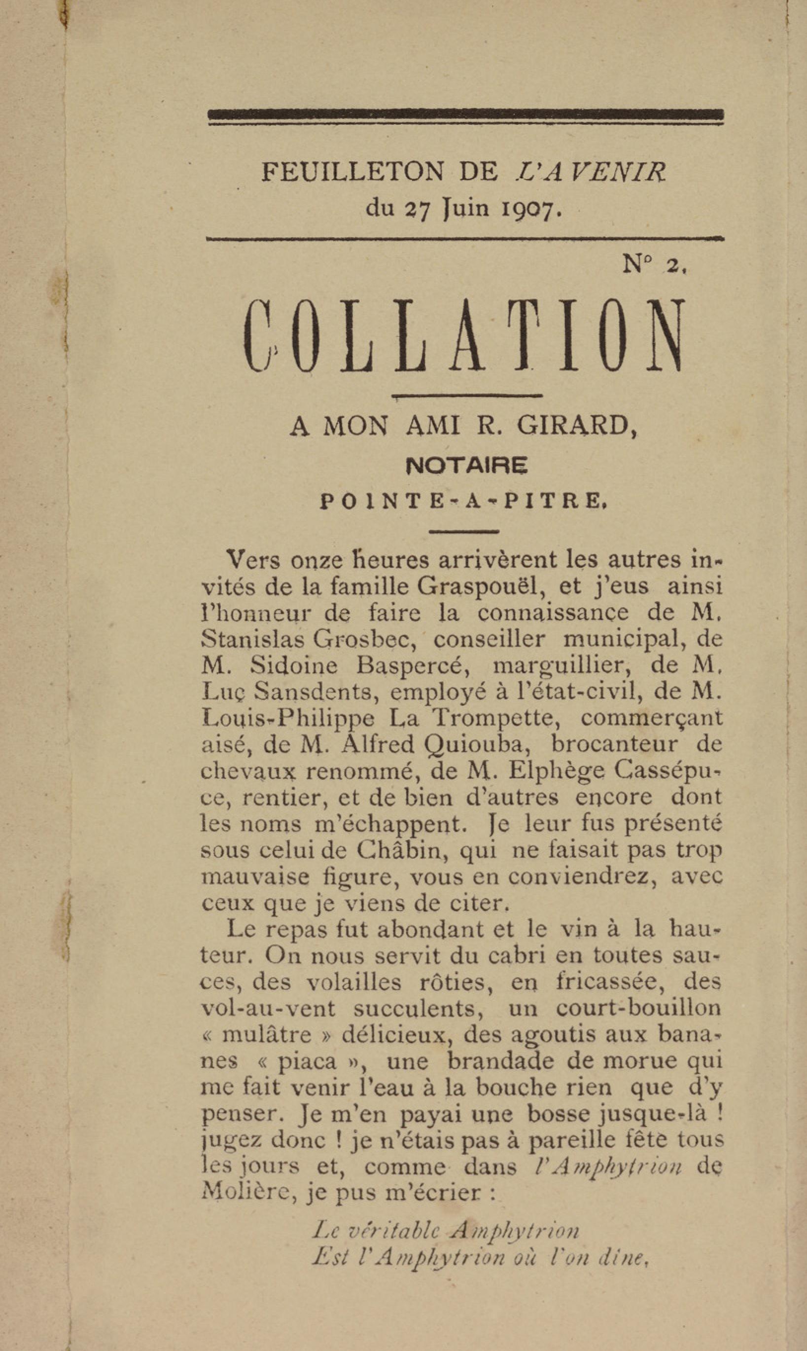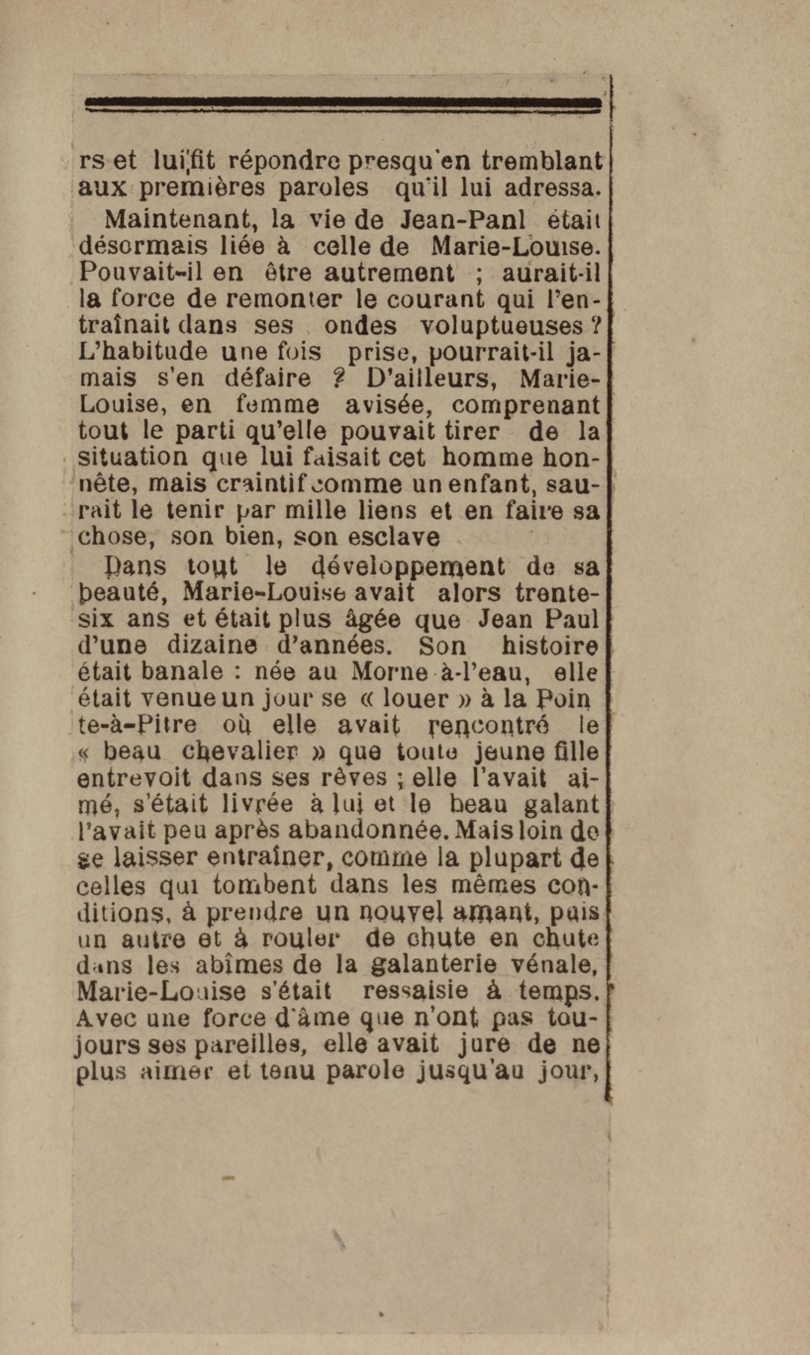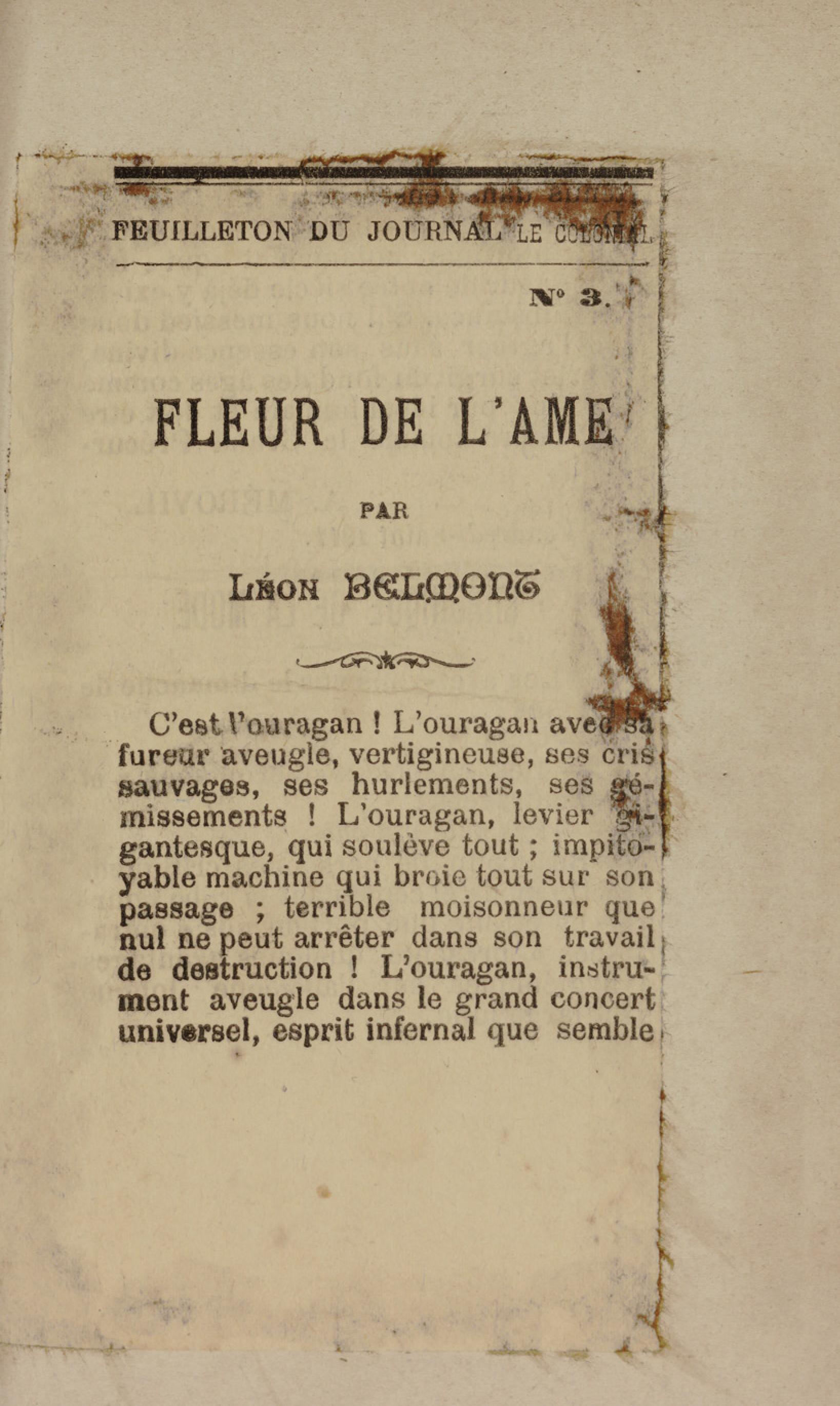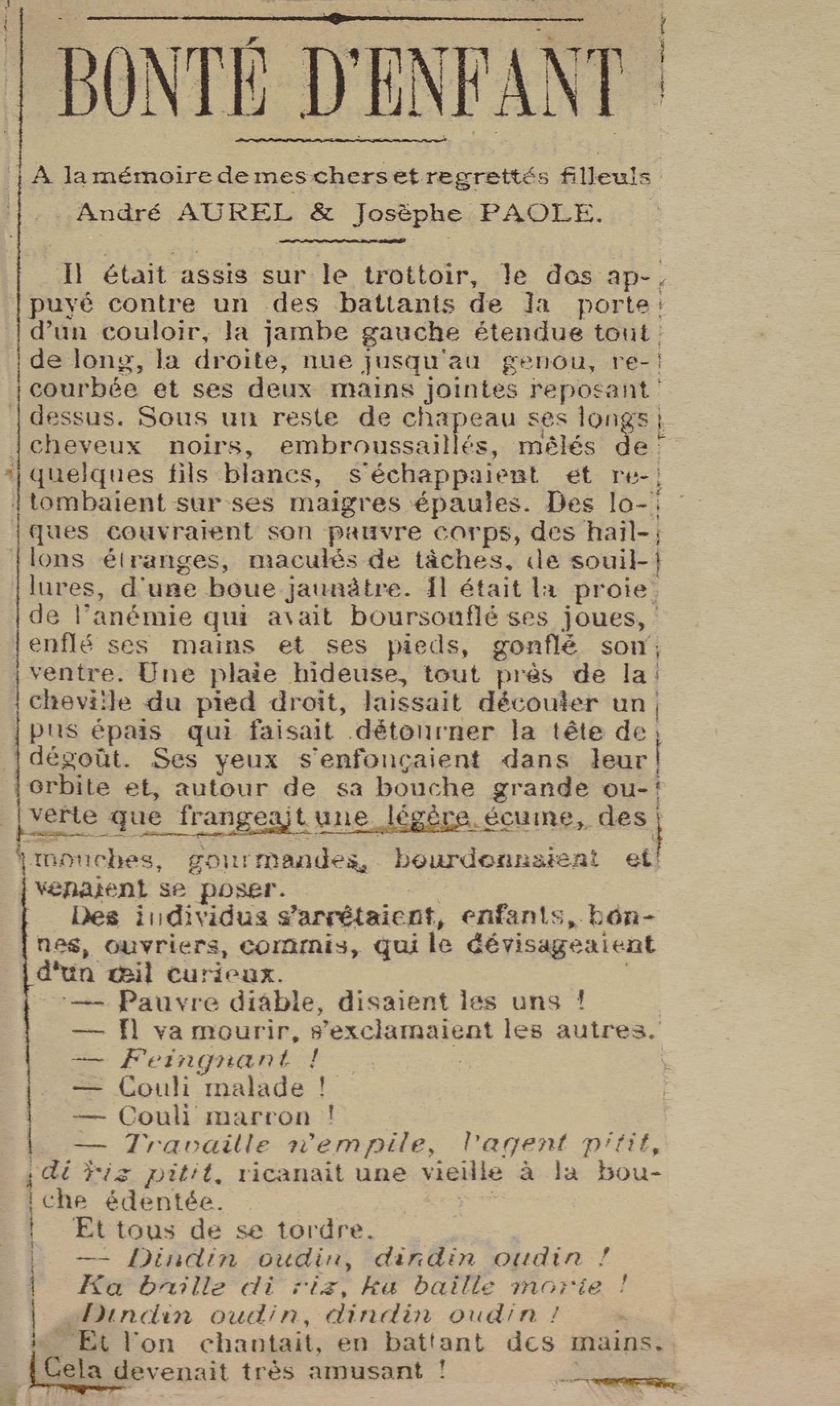 - Contient plusieurs nouvelles et romans-feuilletons publiés par épisodes dans la presse locale, notamment dans les journaux L'Avenir, Le Colonial et L'Union : Méloa. Histoire Caraïbe. Fleur de l’âme. Collation. A ma femme. Le calalou de monsieur le curé. Bonté d'enfant. Comment je me suis marié. Le mari de Latchimy. Le mariage de Jean-Paul Prineau. Nécessité n'a pas de loi. Les amours de voyage.