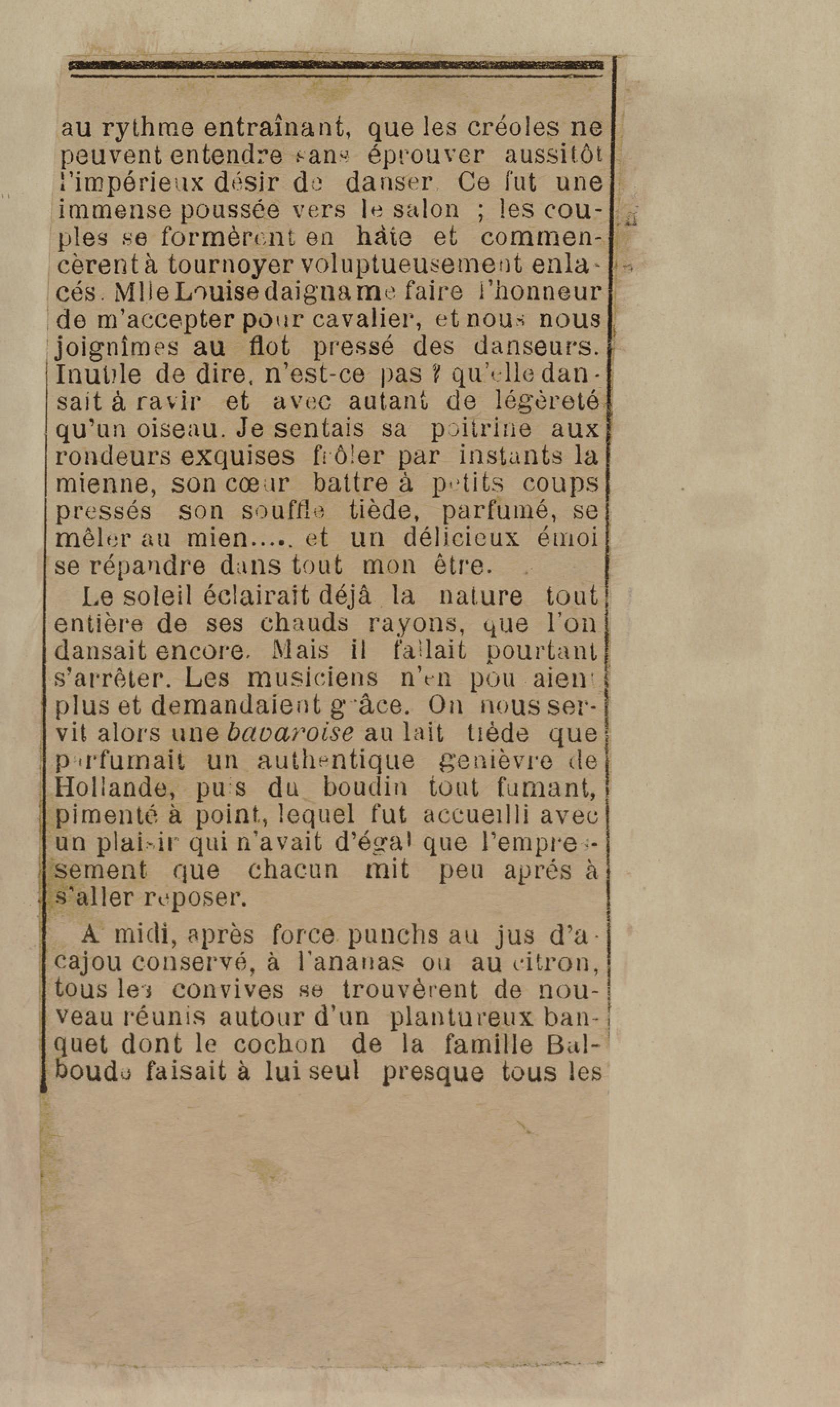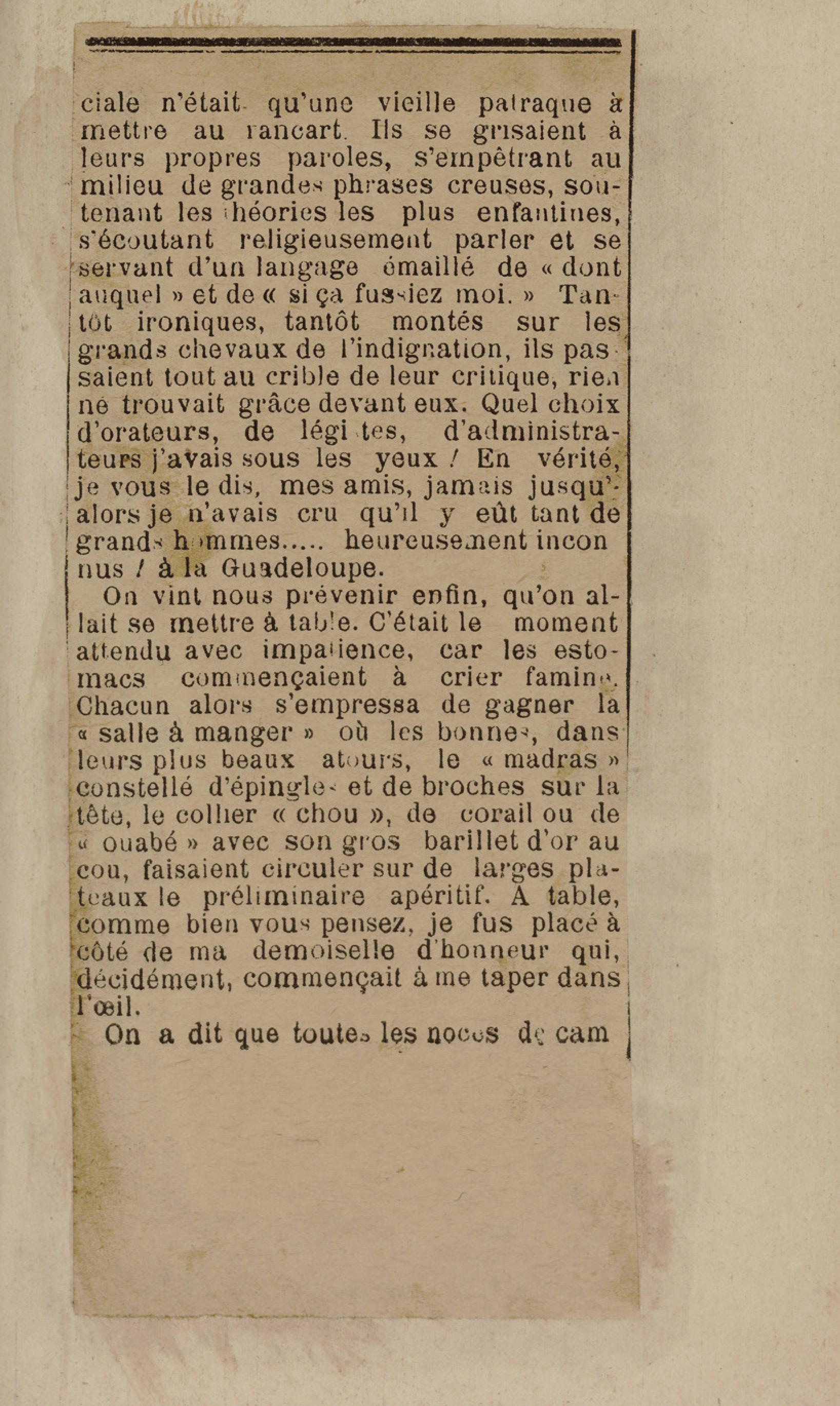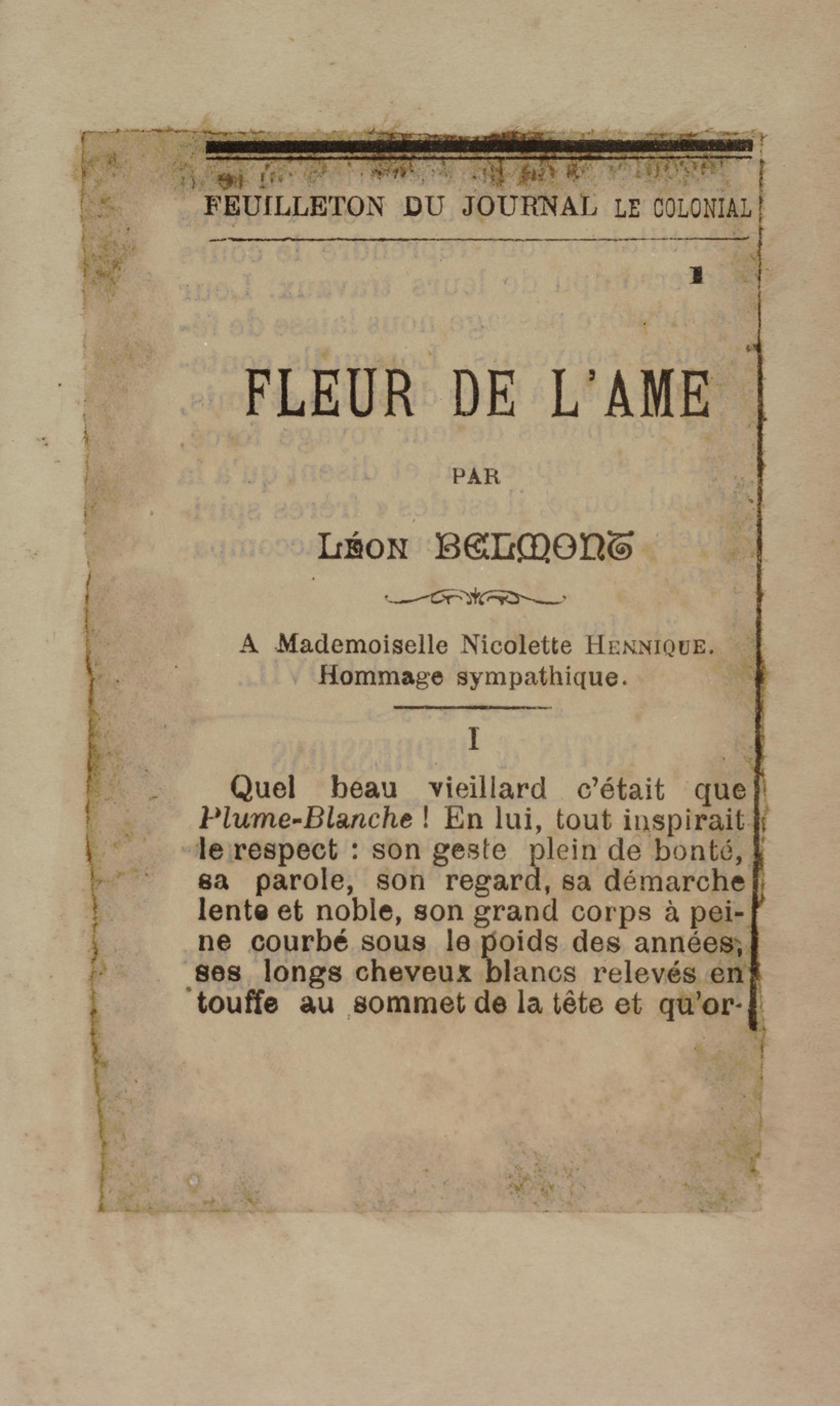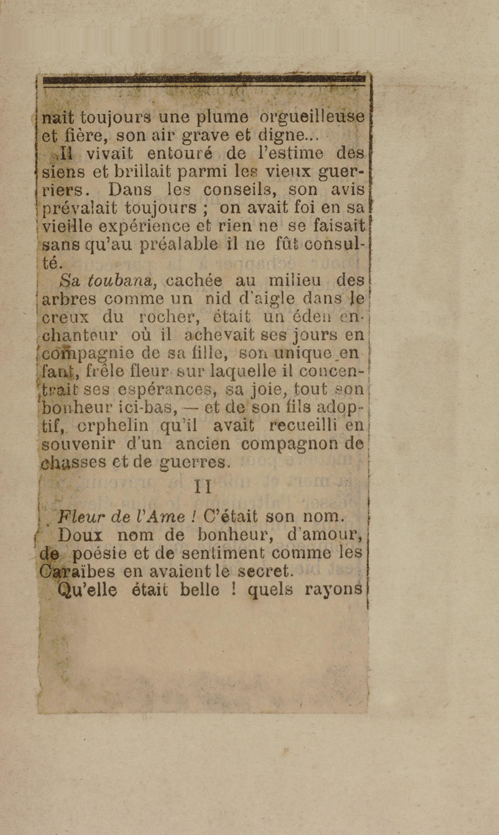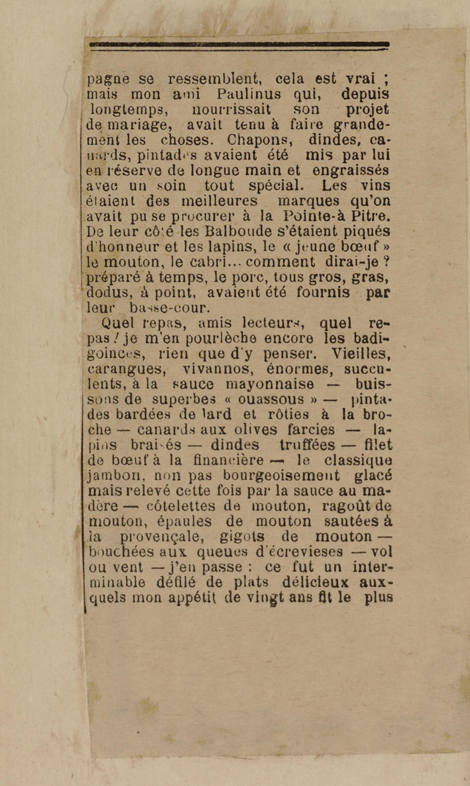 - Contient plusieurs nouvelles et romans-feuilletons publiés par épisodes dans la presse locale, notamment dans les journaux L'Avenir, Le Colonial et L'Union : Méloa. Histoire Caraïbe. Fleur de l’âme. Collation. A ma femme. Le calalou de monsieur le curé. Bonté d'enfant. Comment je me suis marié. Le mari de Latchimy. Le mariage de Jean-Paul Prineau. Nécessité n'a pas de loi. Les amours de voyage.