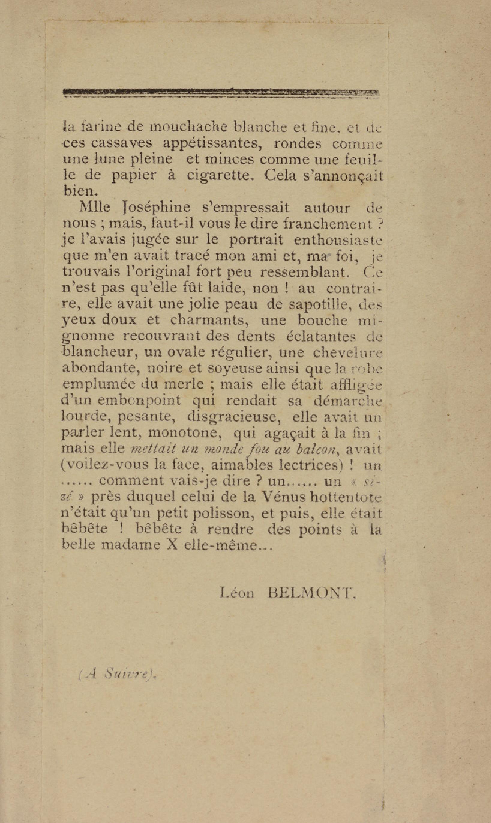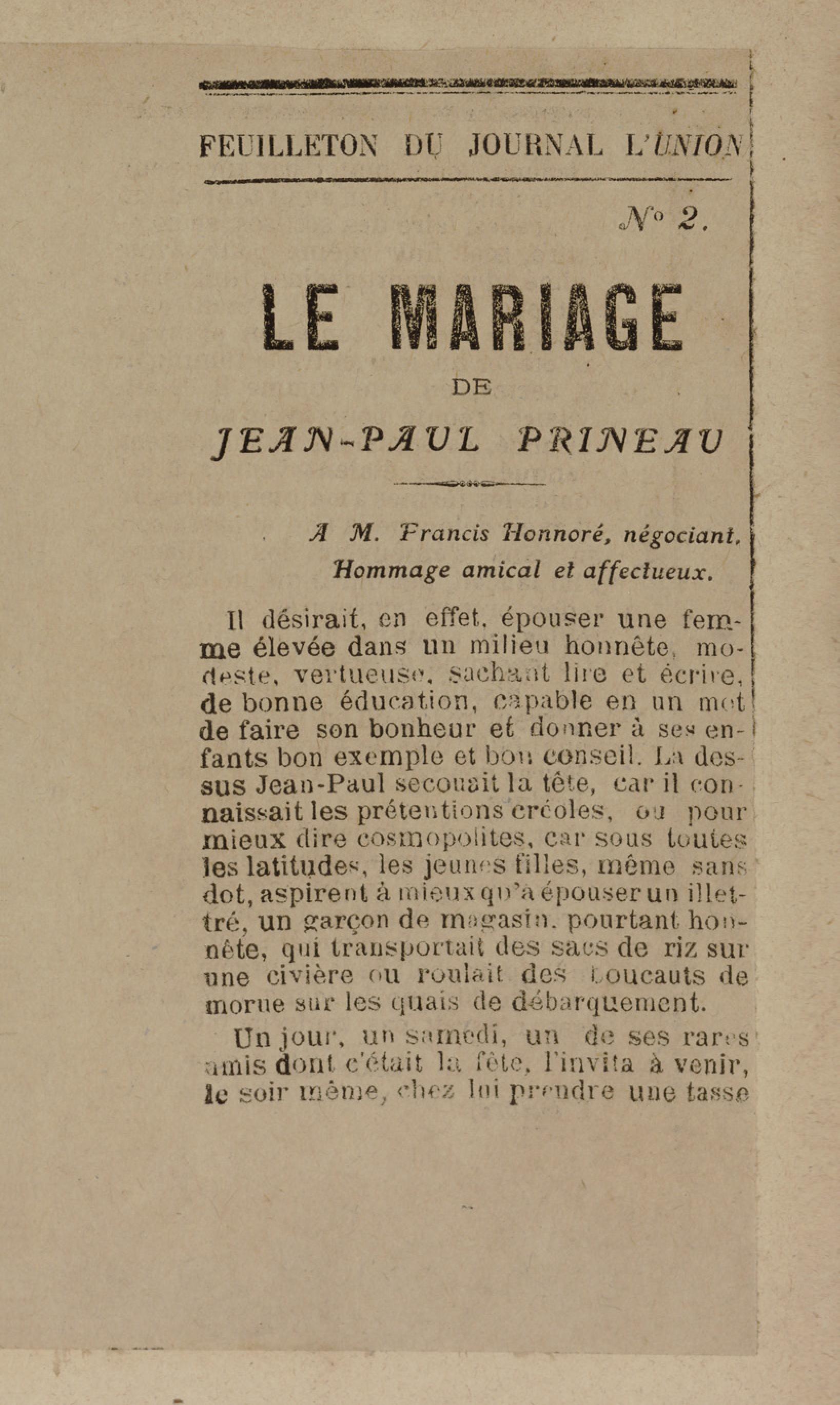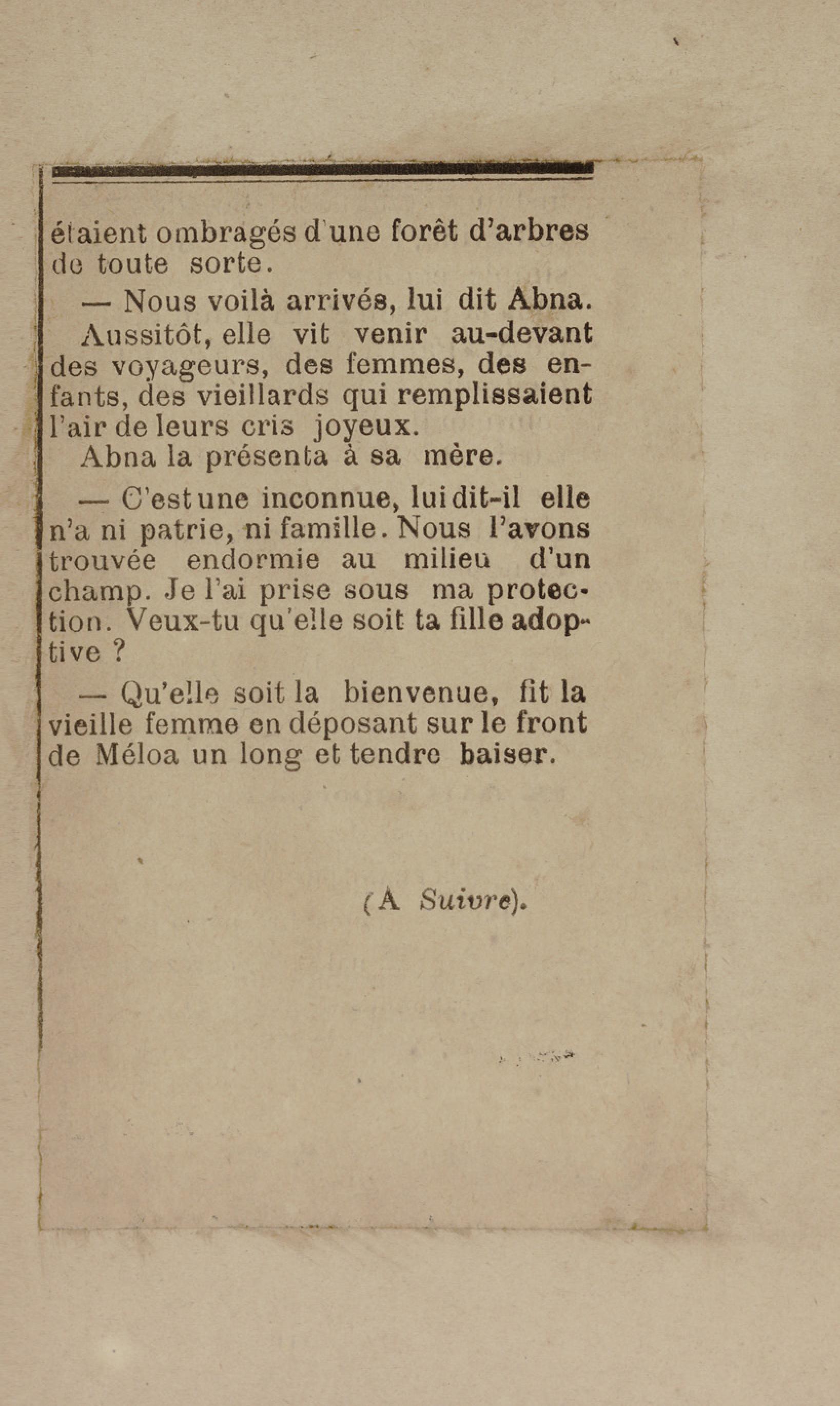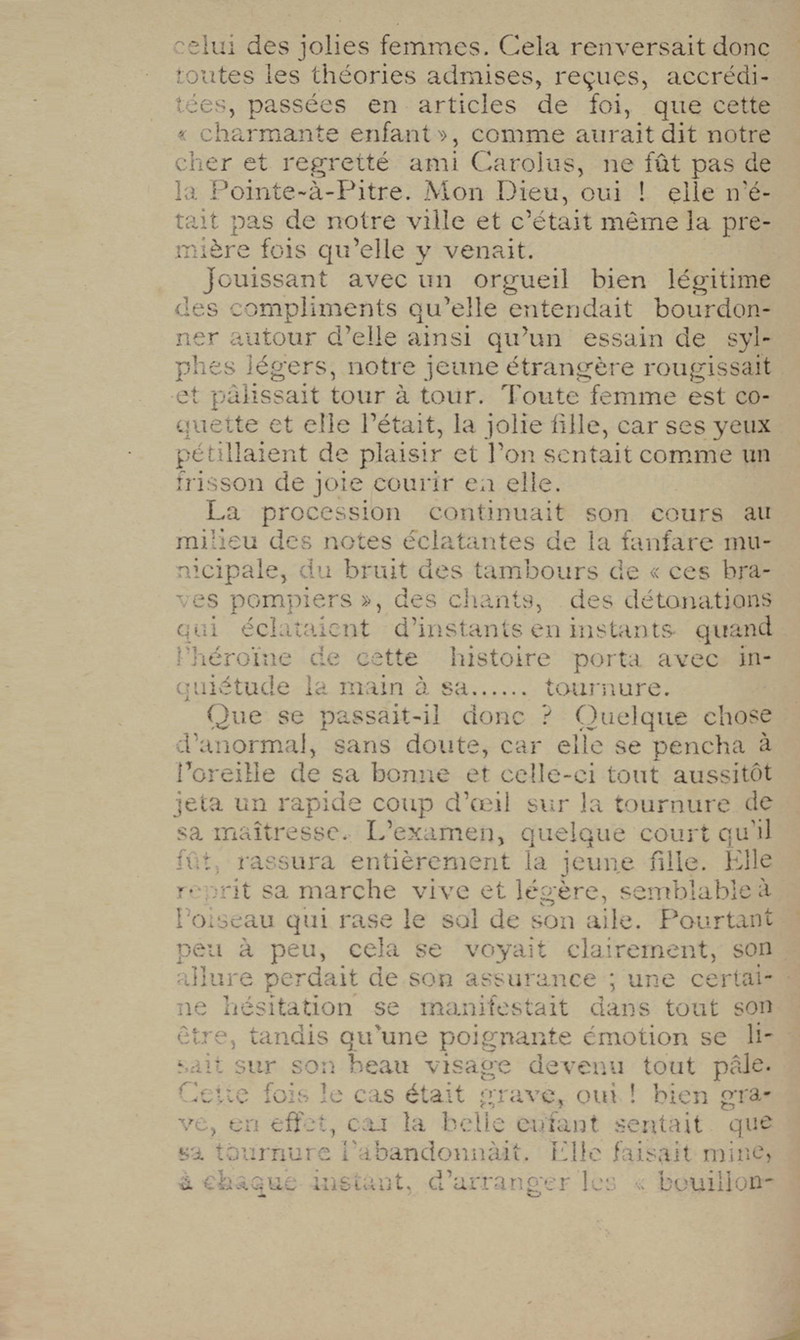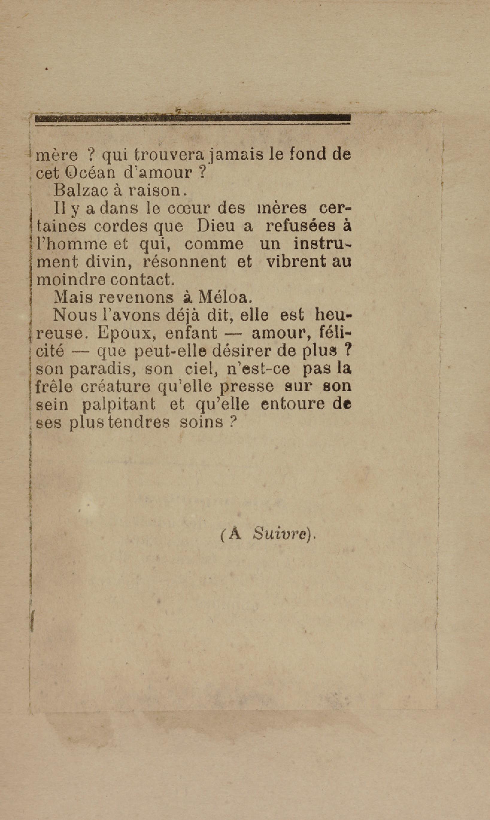 - Contient plusieurs nouvelles et romans-feuilletons publiés par épisodes dans la presse locale, notamment dans les journaux L'Avenir, Le Colonial et L'Union : Méloa. Histoire Caraïbe. Fleur de l’âme. Collation. A ma femme. Le calalou de monsieur le curé. Bonté d'enfant. Comment je me suis marié. Le mari de Latchimy. Le mariage de Jean-Paul Prineau. Nécessité n'a pas de loi. Les amours de voyage.