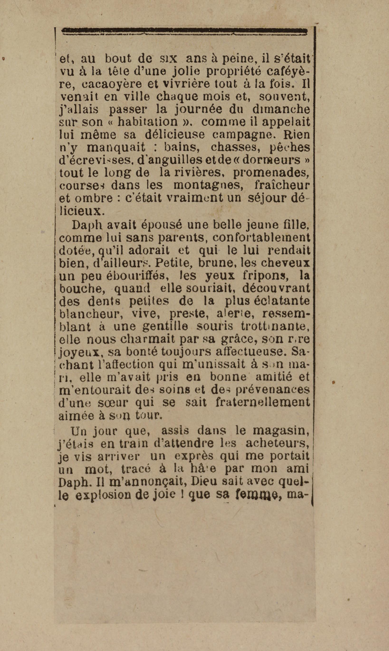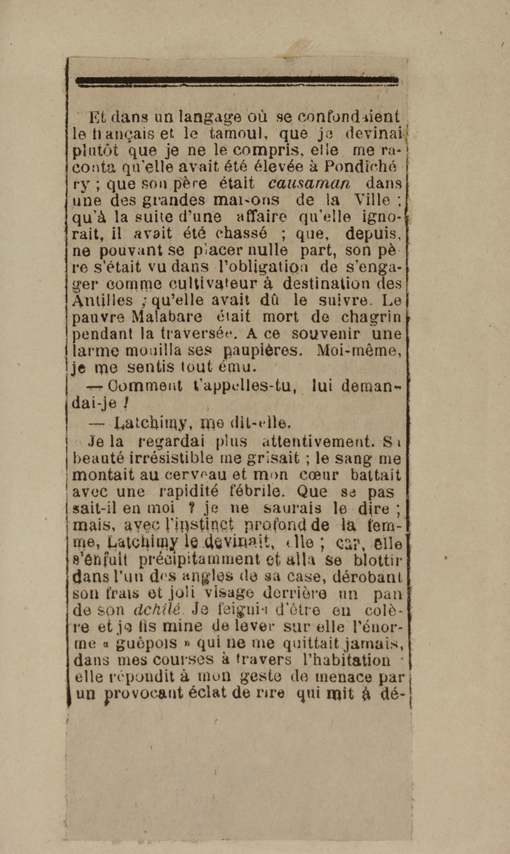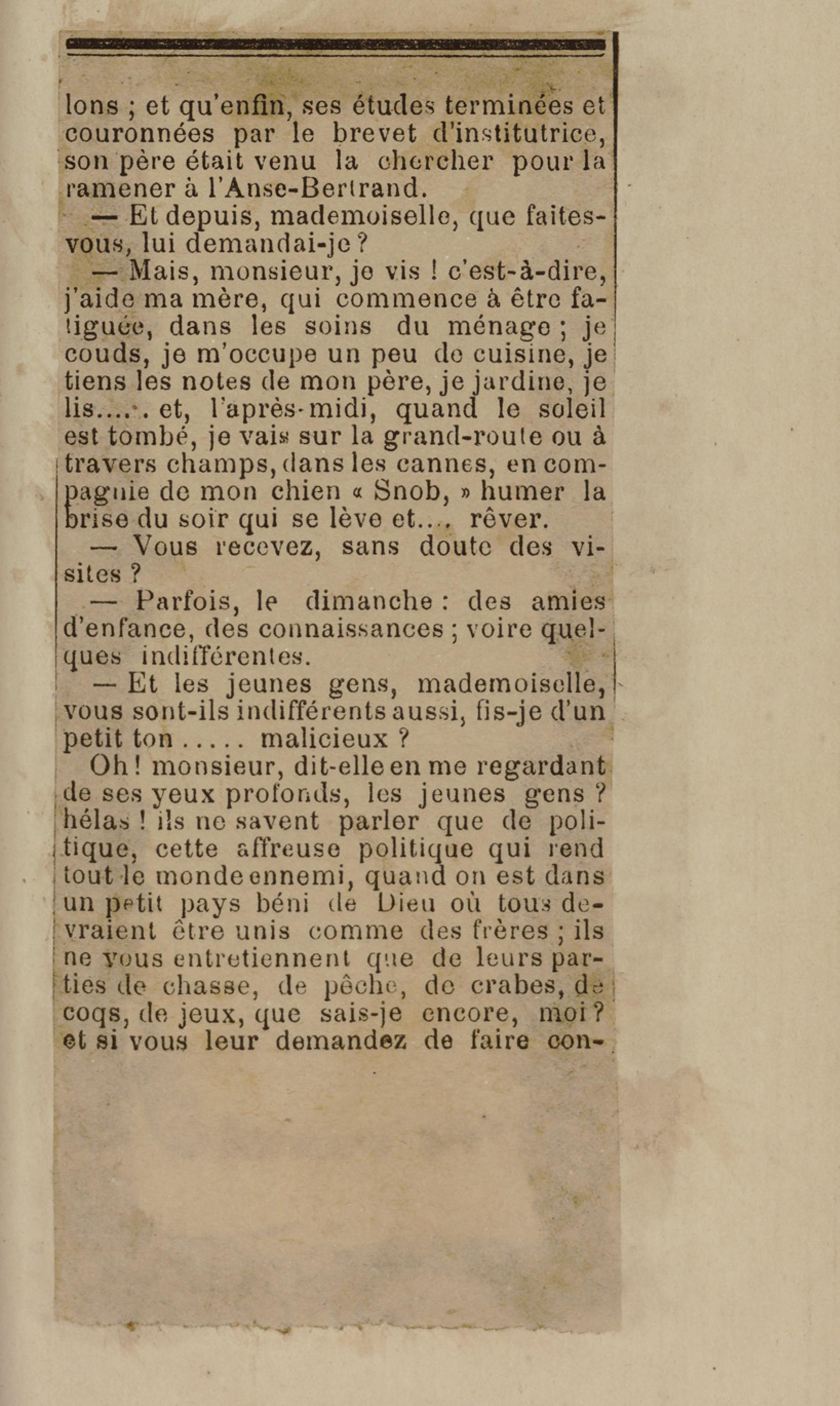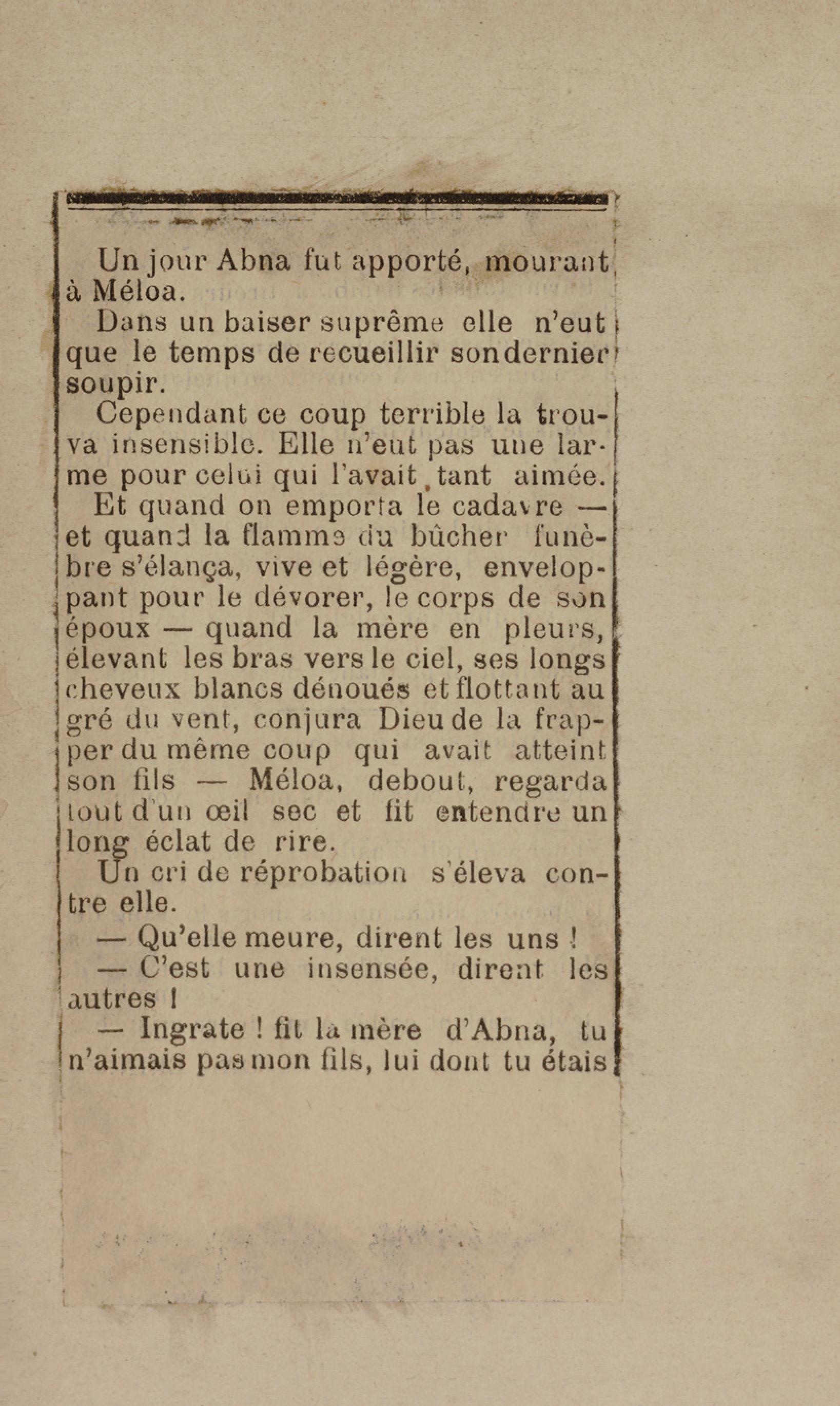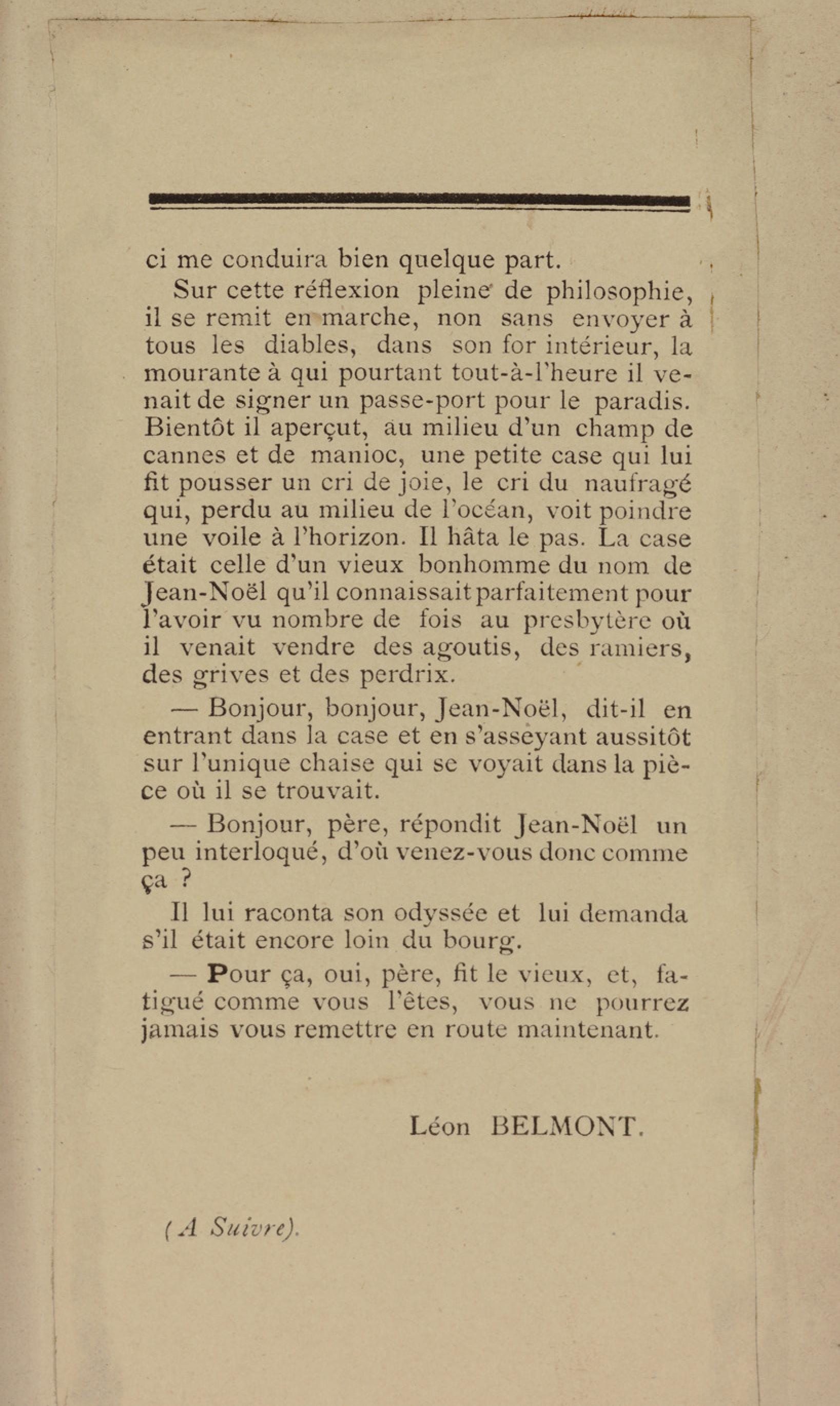 - Contient plusieurs nouvelles et romans-feuilletons publiés par épisodes dans la presse locale, notamment dans les journaux L'Avenir, Le Colonial et L'Union : Méloa. Histoire Caraïbe. Fleur de l’âme. Collation. A ma femme. Le calalou de monsieur le curé. Bonté d'enfant. Comment je me suis marié. Le mari de Latchimy. Le mariage de Jean-Paul Prineau. Nécessité n'a pas de loi. Les amours de voyage.