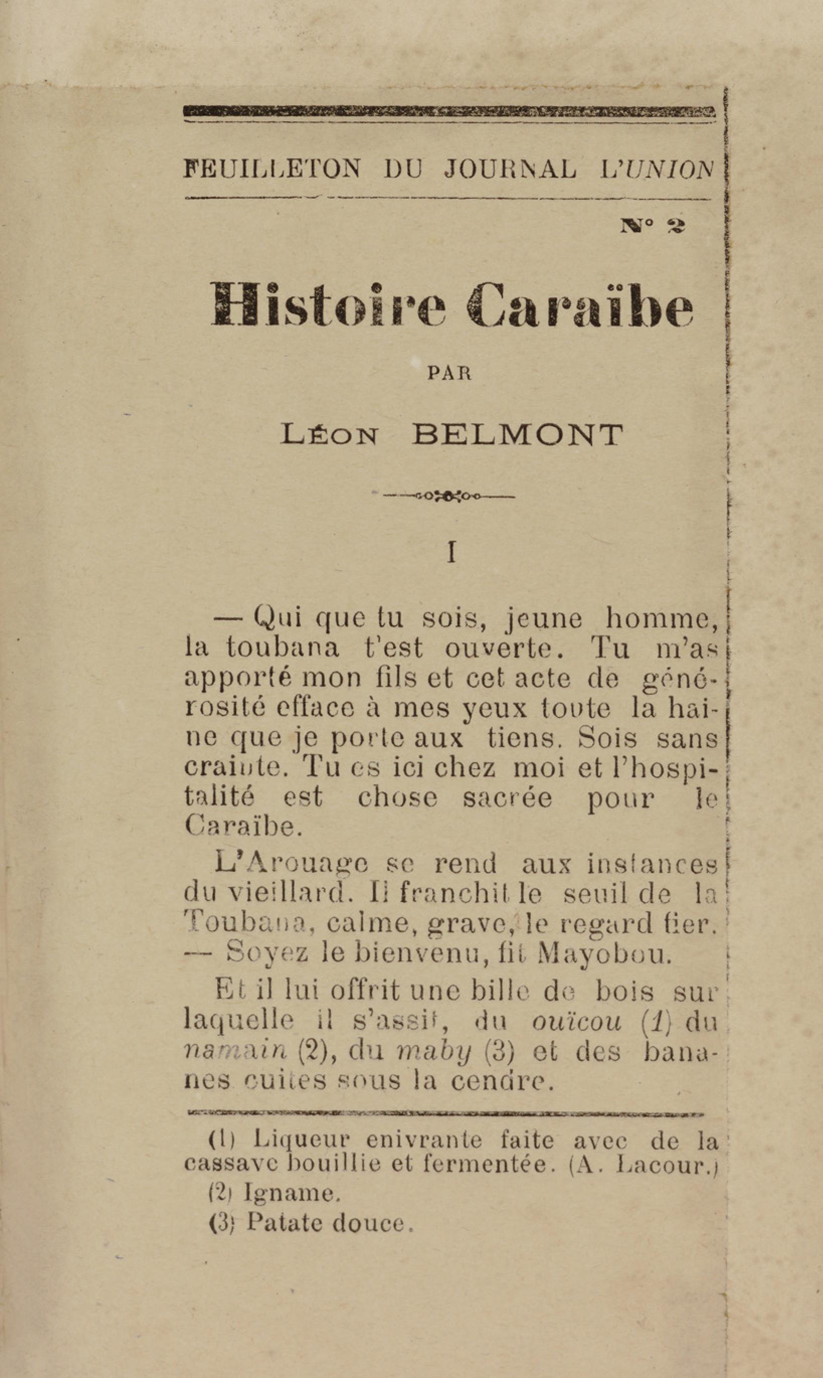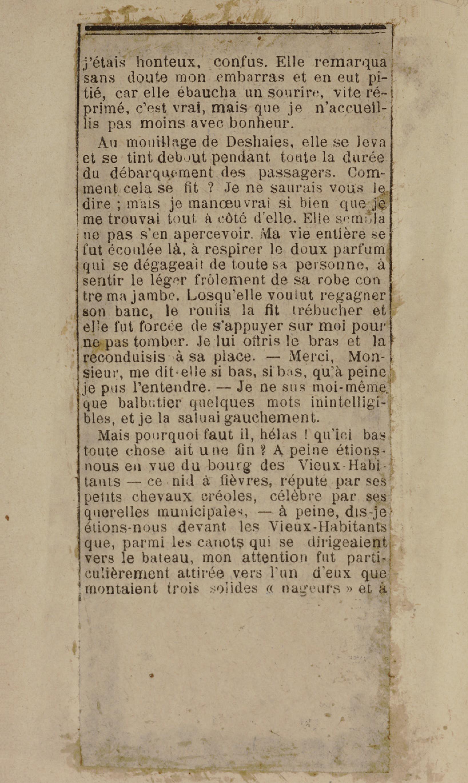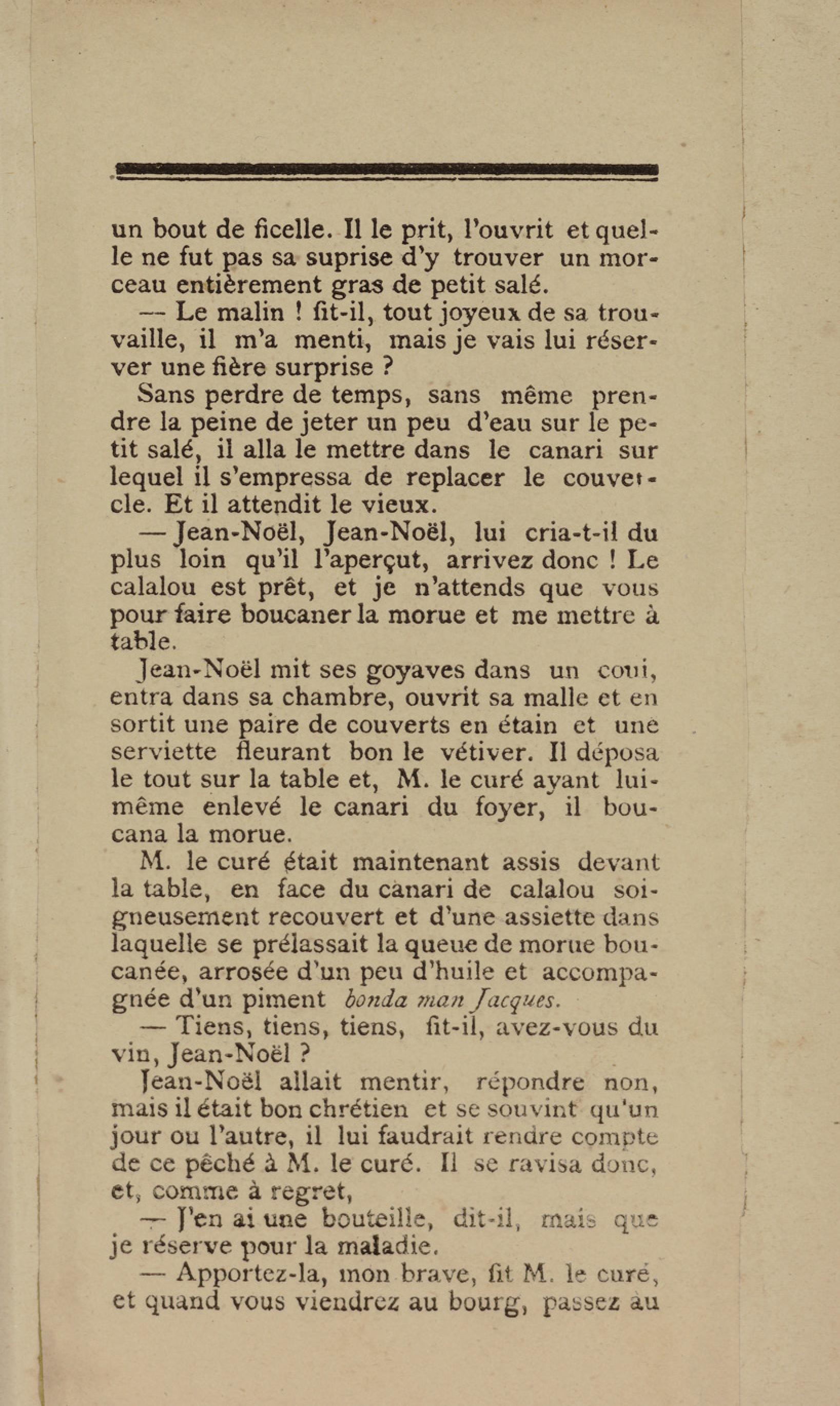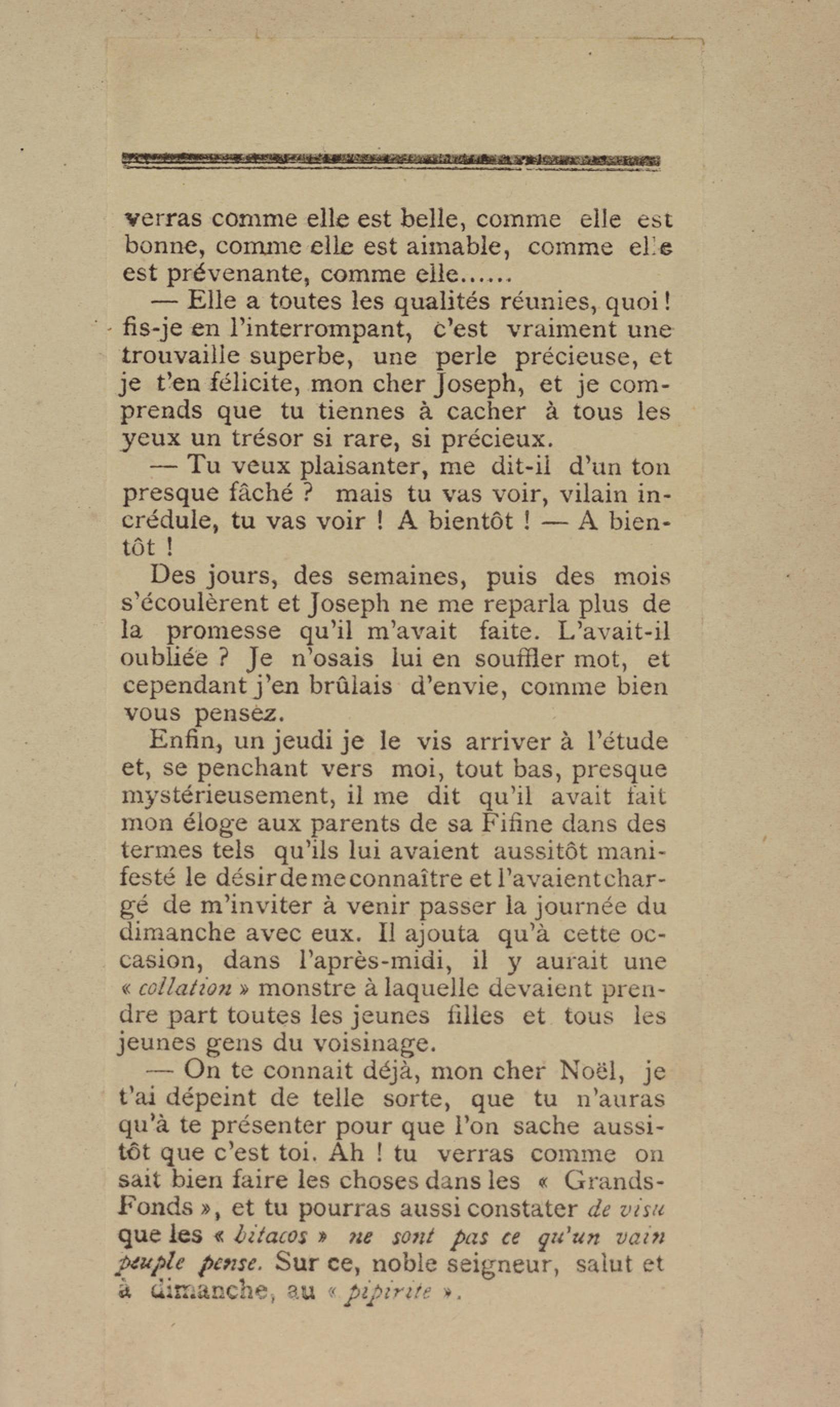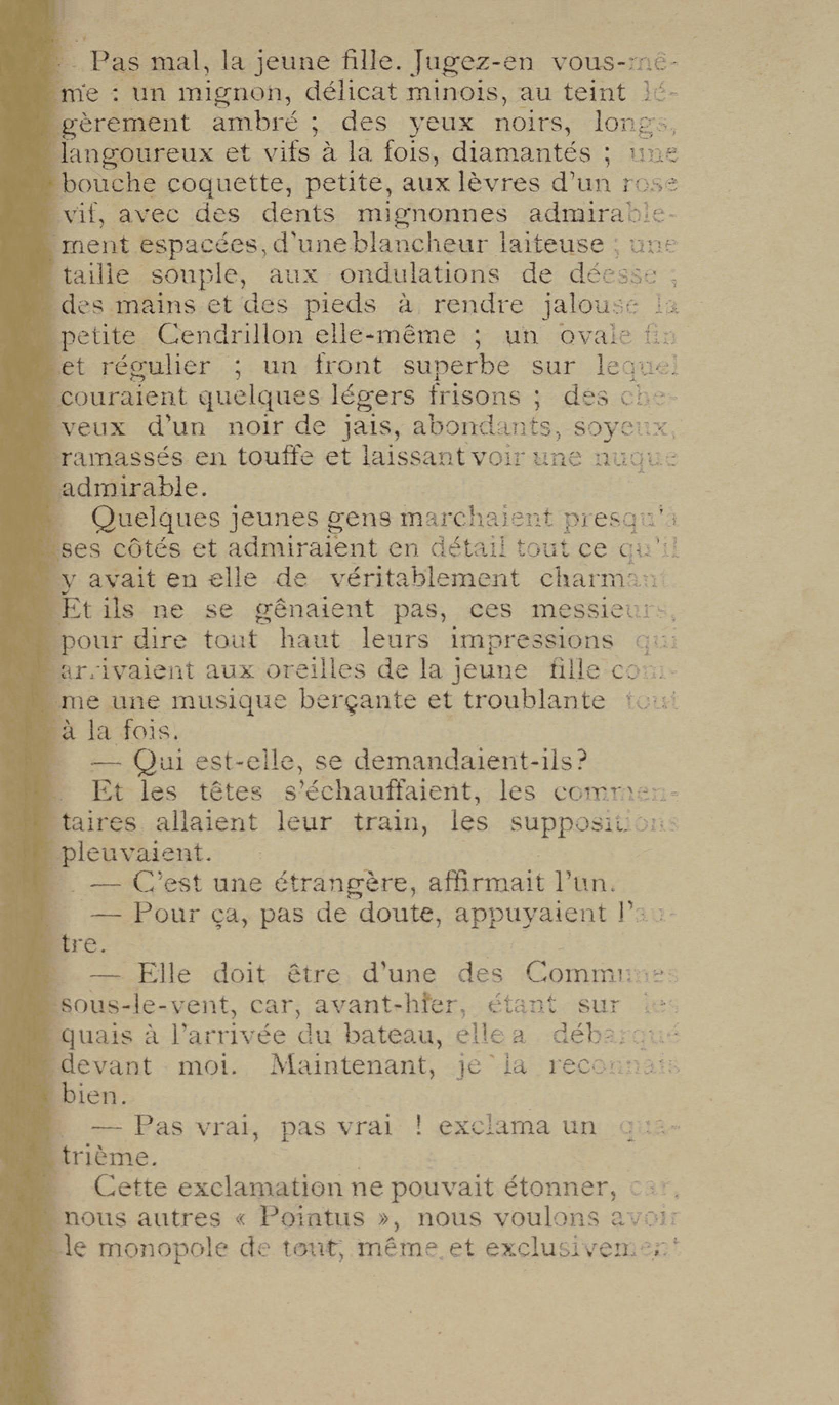 - Contient plusieurs nouvelles et romans-feuilletons publiés par épisodes dans la presse locale, notamment dans les journaux L'Avenir, Le Colonial et L'Union : Méloa. Histoire Caraïbe. Fleur de l’âme. Collation. A ma femme. Le calalou de monsieur le curé. Bonté d'enfant. Comment je me suis marié. Le mari de Latchimy. Le mariage de Jean-Paul Prineau. Nécessité n'a pas de loi. Les amours de voyage.