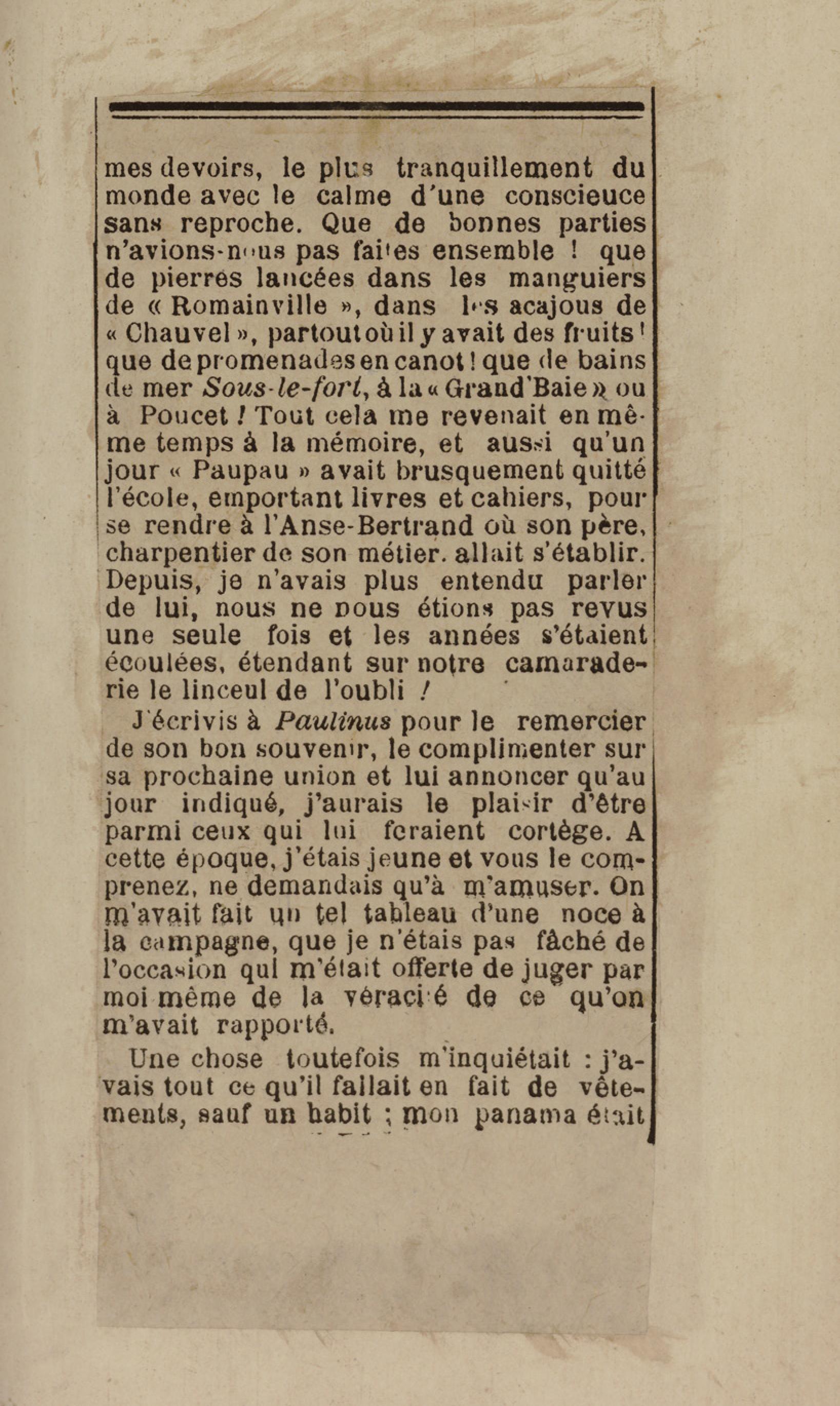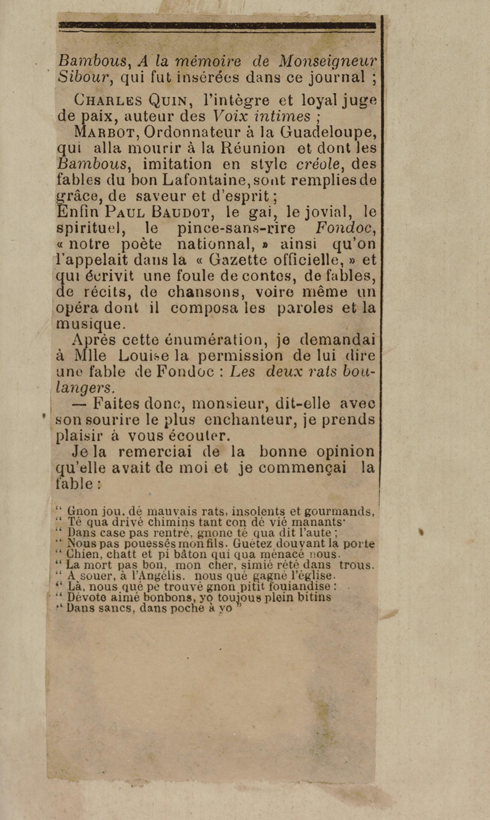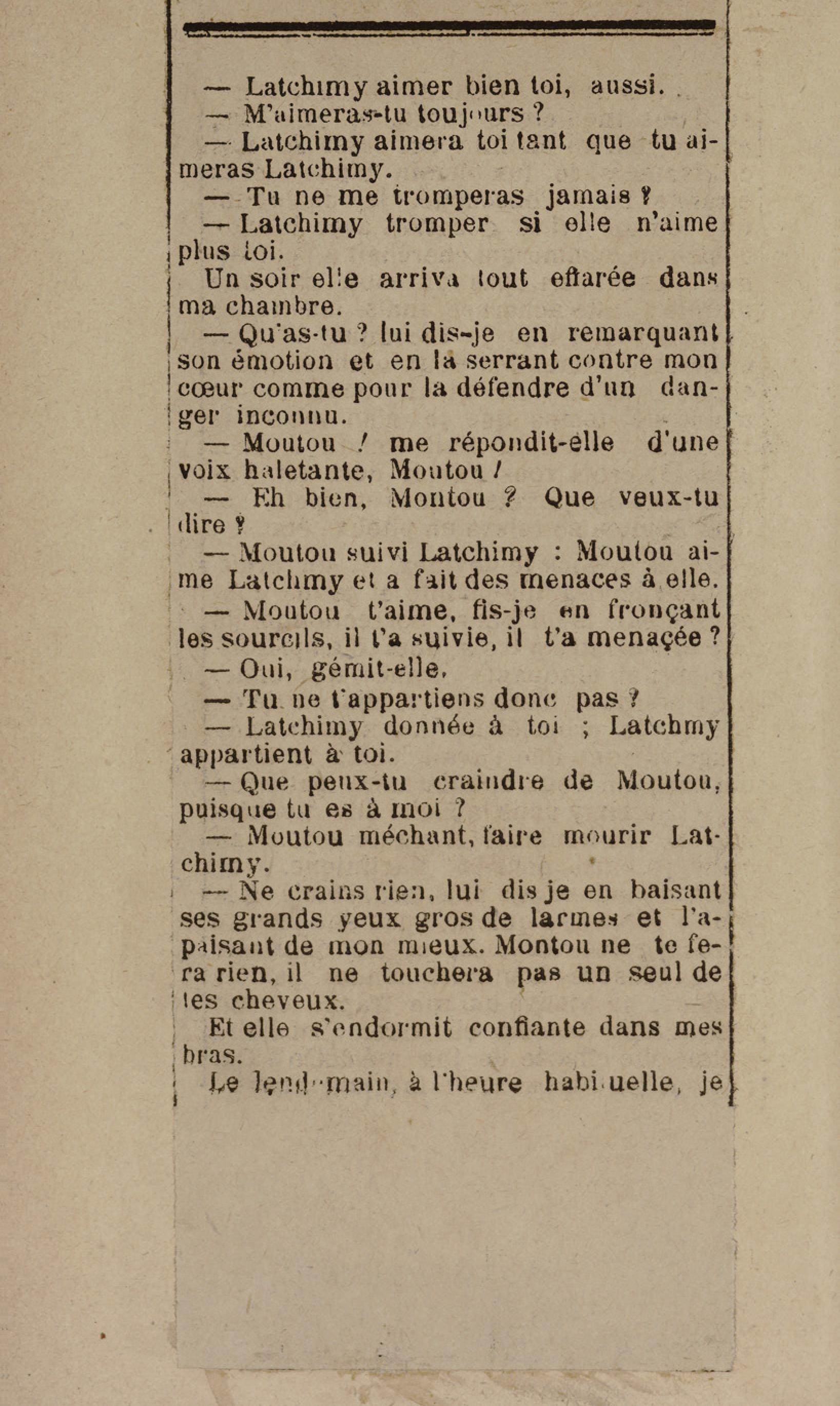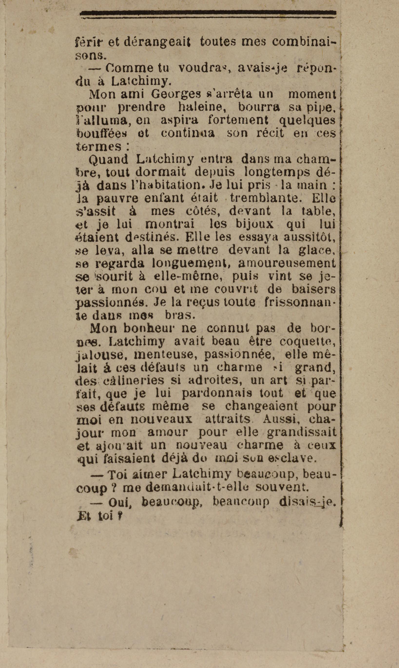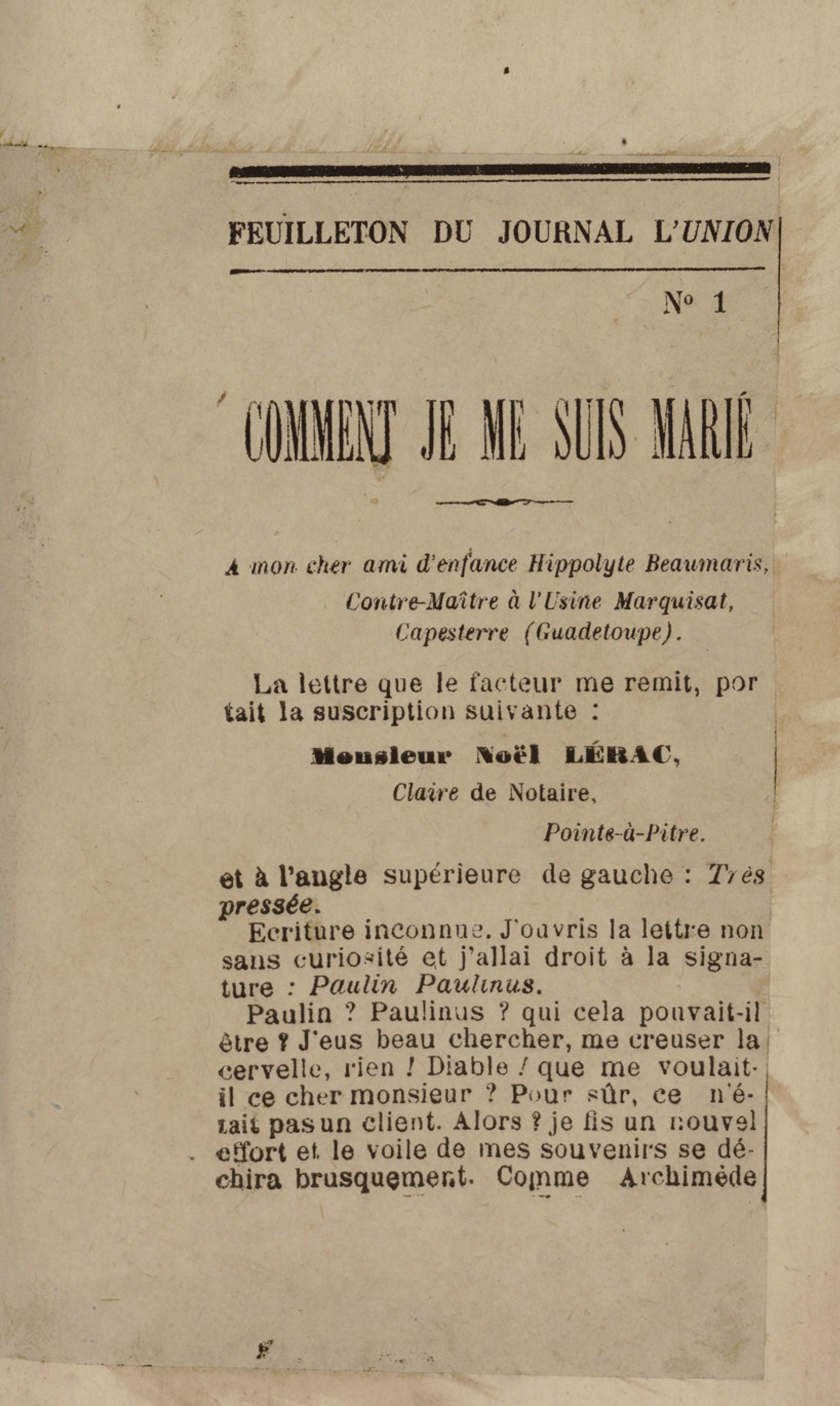 - Contient plusieurs nouvelles et romans-feuilletons publiés par épisodes dans la presse locale, notamment dans les journaux L'Avenir, Le Colonial et L'Union : Méloa. Histoire Caraïbe. Fleur de l’âme. Collation. A ma femme. Le calalou de monsieur le curé. Bonté d'enfant. Comment je me suis marié. Le mari de Latchimy. Le mariage de Jean-Paul Prineau. Nécessité n'a pas de loi. Les amours de voyage.