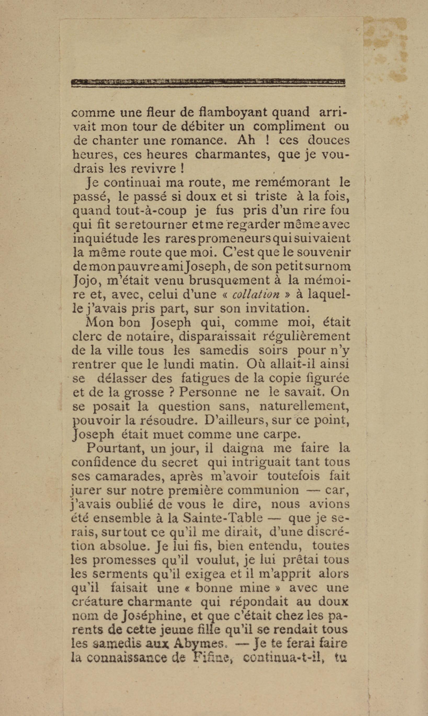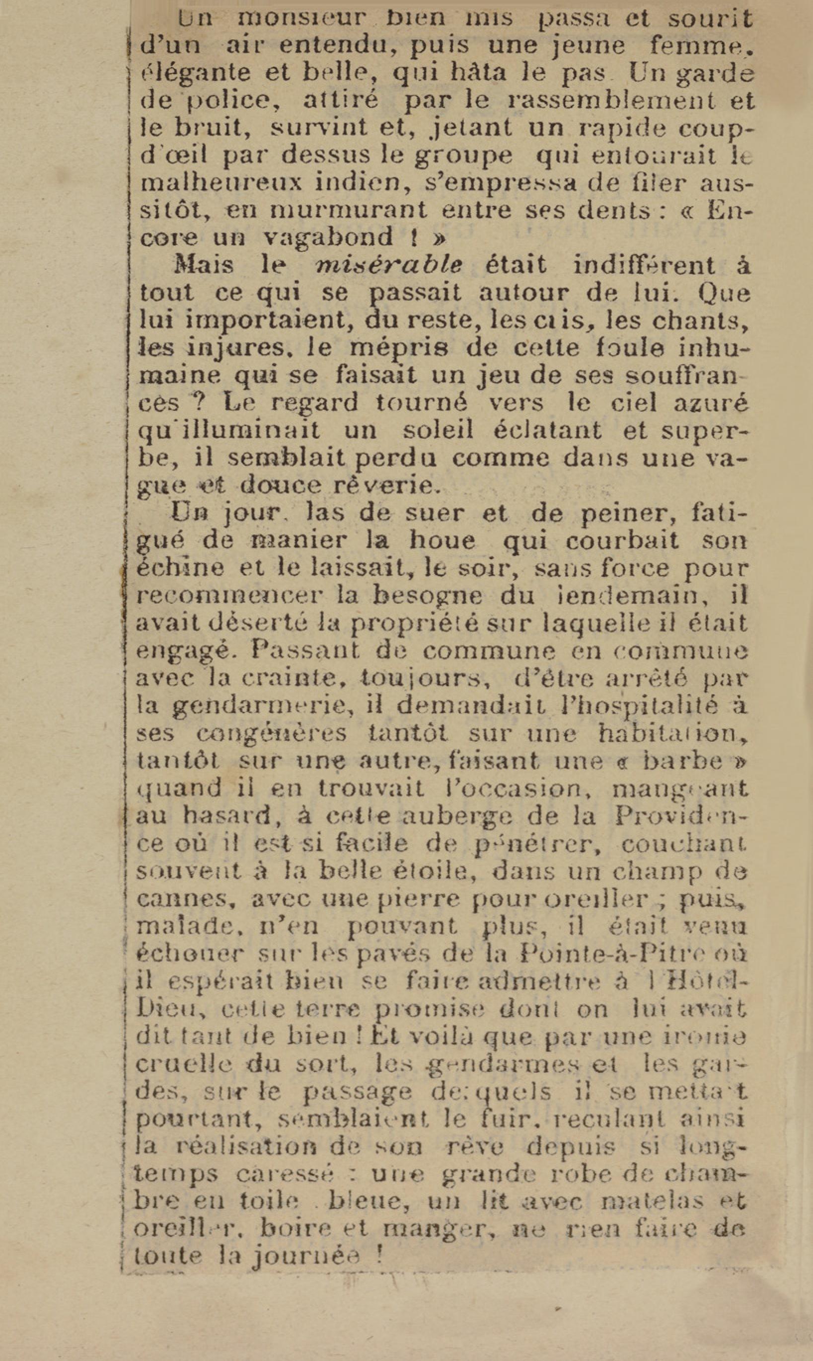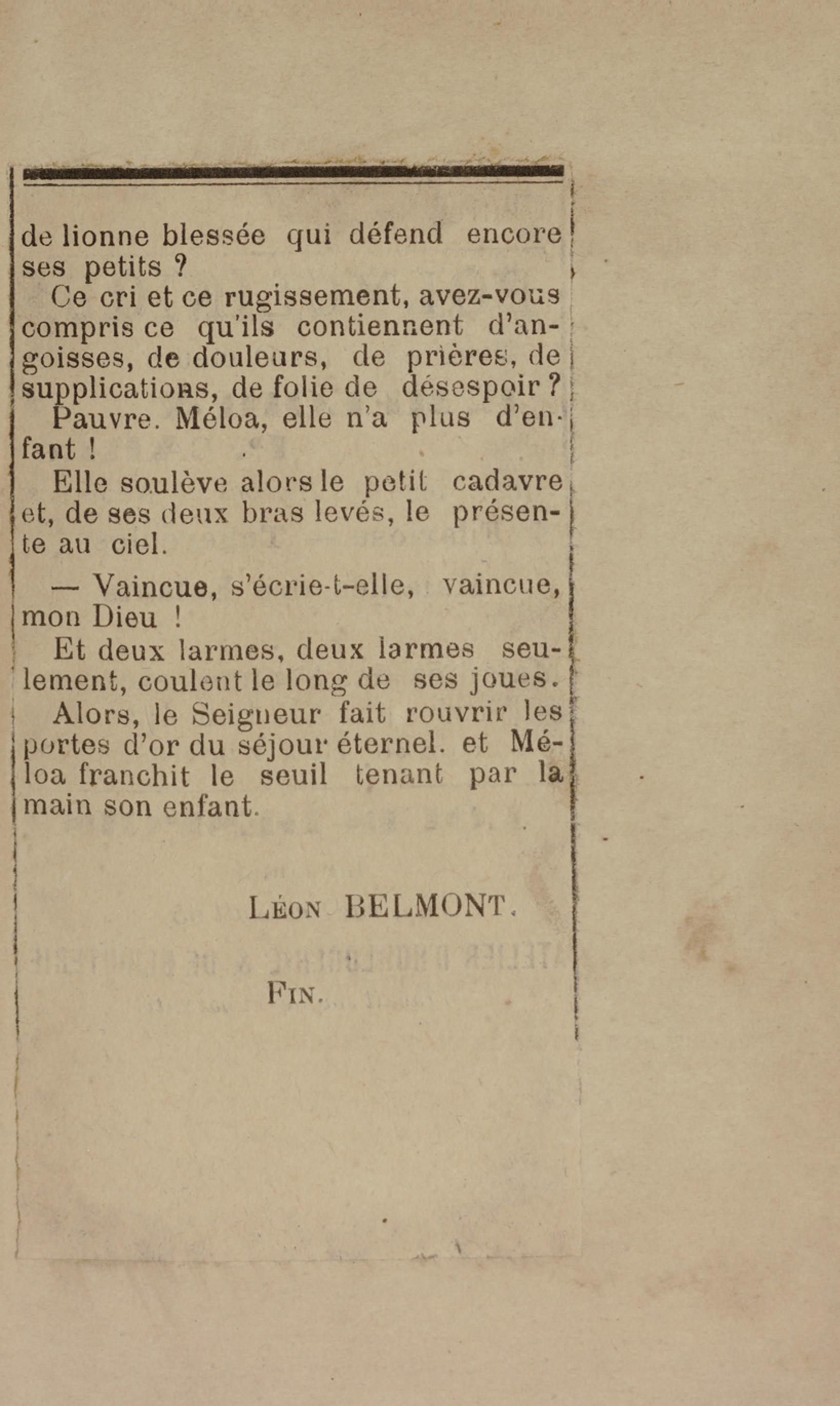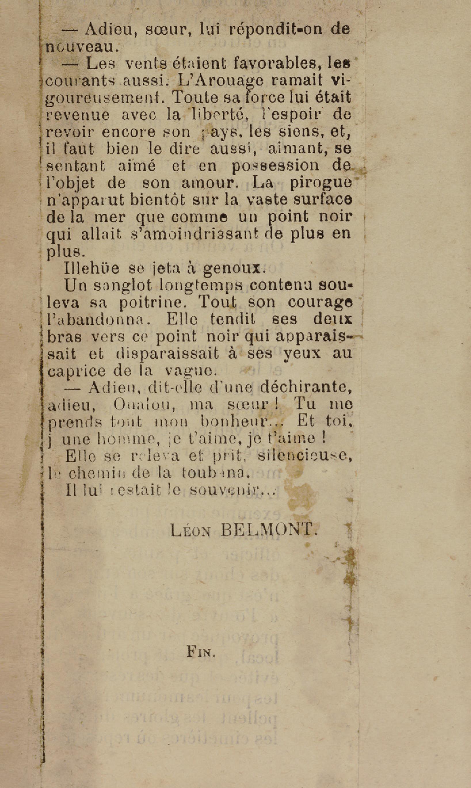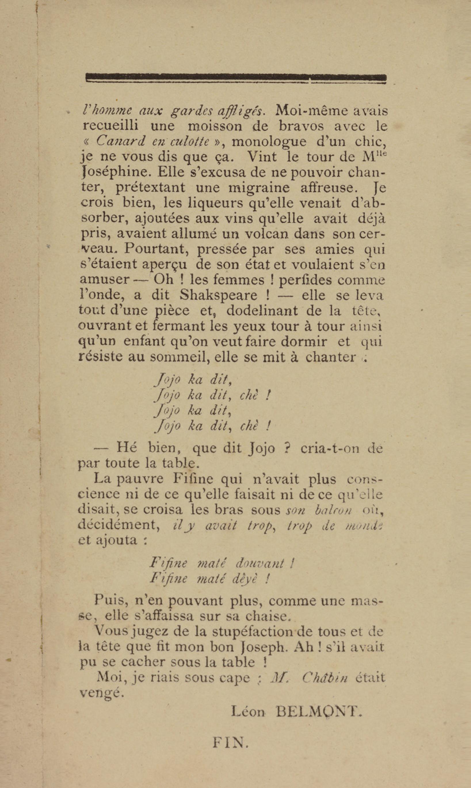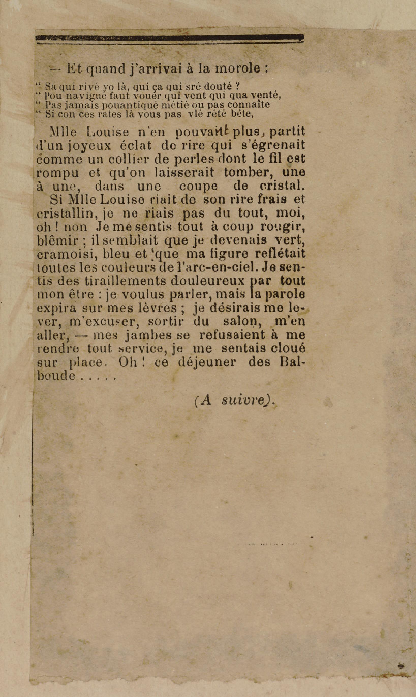 - Contient plusieurs nouvelles et romans-feuilletons publiés par épisodes dans la presse locale, notamment dans les journaux L'Avenir, Le Colonial et L'Union : Méloa. Histoire Caraïbe. Fleur de l’âme. Collation. A ma femme. Le calalou de monsieur le curé. Bonté d'enfant. Comment je me suis marié. Le mari de Latchimy. Le mariage de Jean-Paul Prineau. Nécessité n'a pas de loi. Les amours de voyage.
