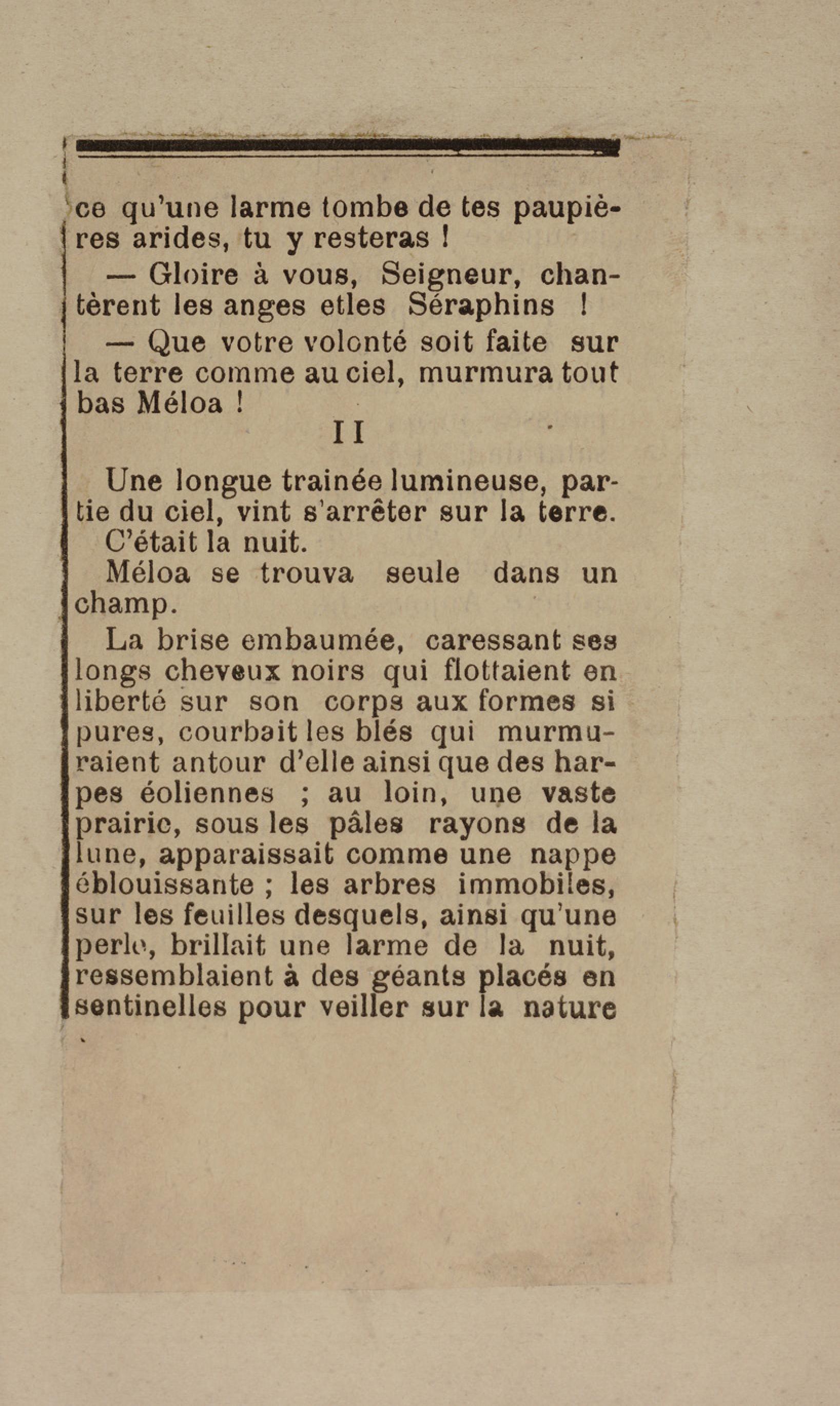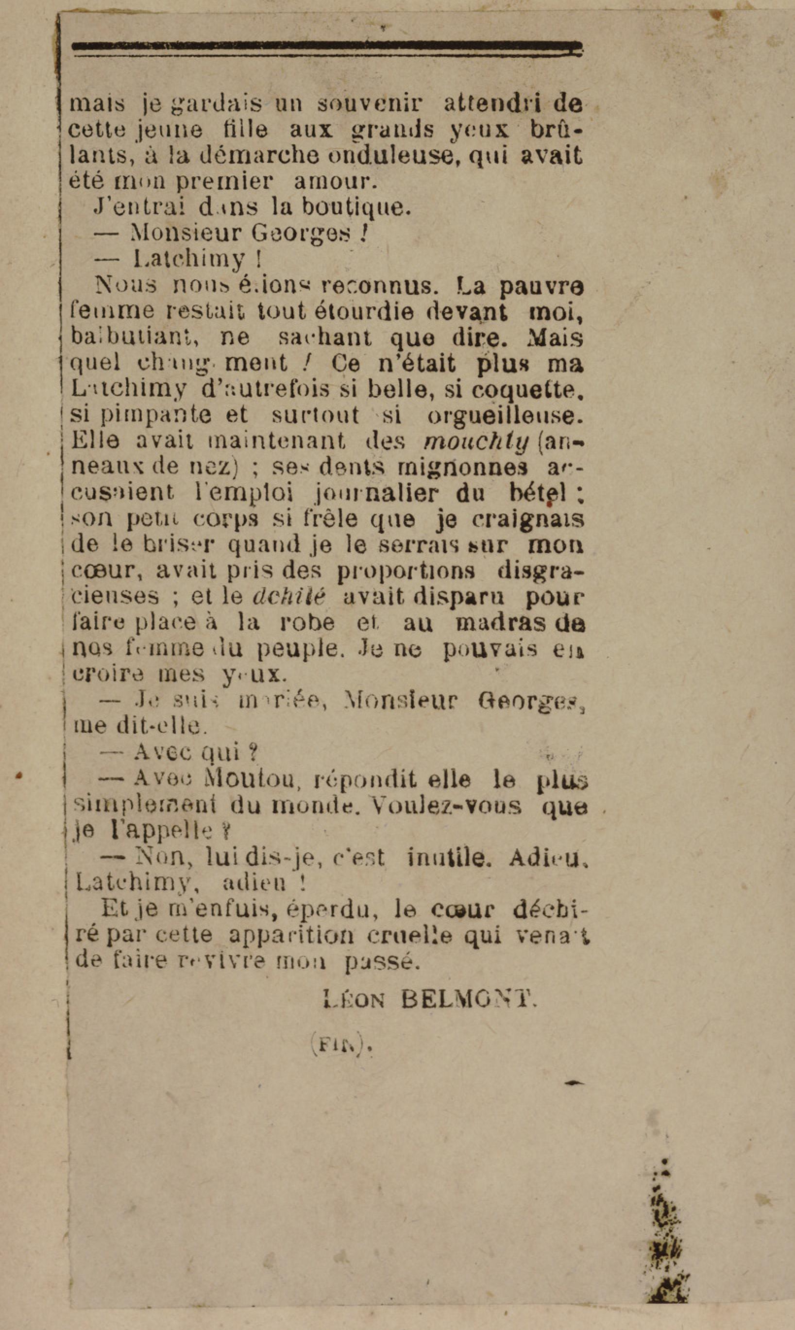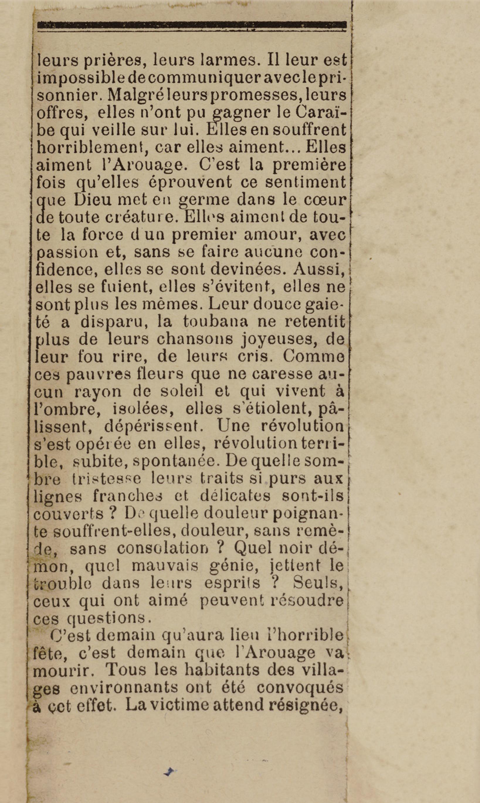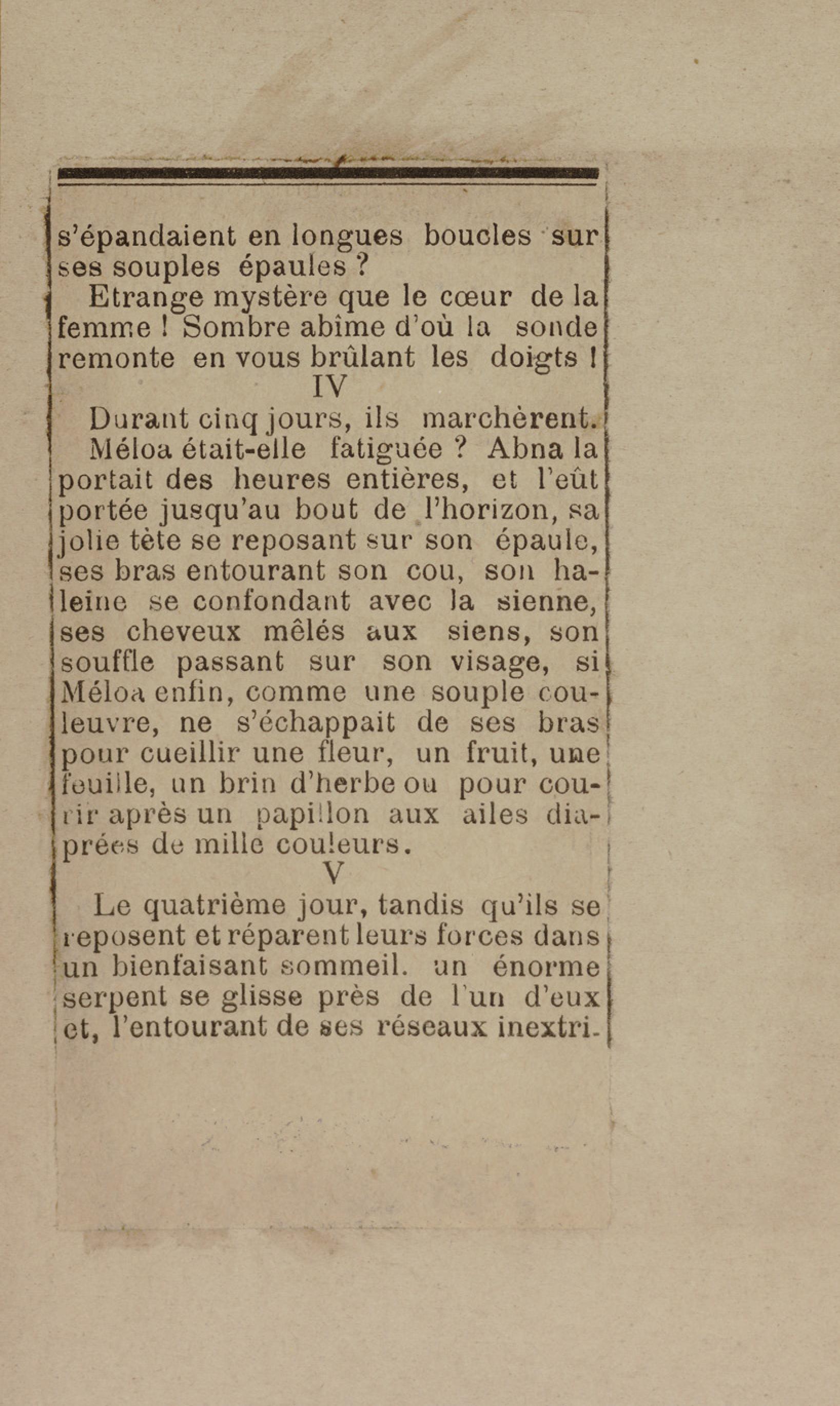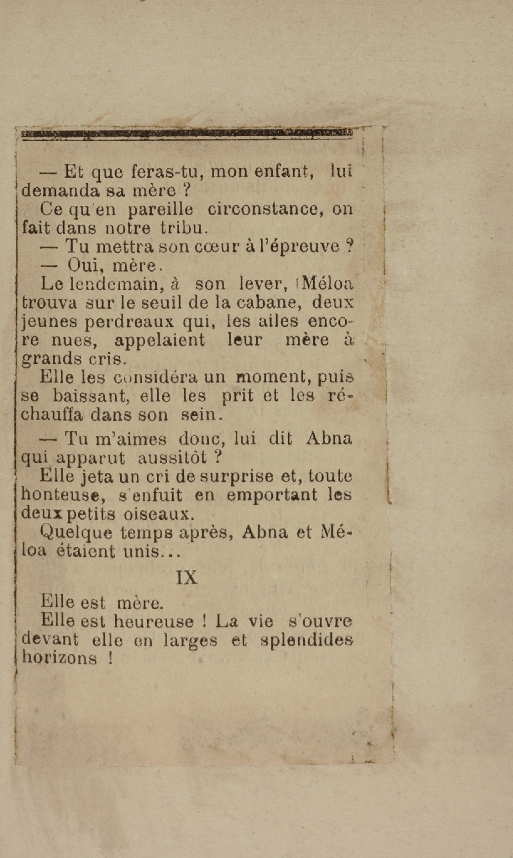 - Contient plusieurs nouvelles et romans-feuilletons publiés par épisodes dans la presse locale, notamment dans les journaux L'Avenir, Le Colonial et L'Union : Méloa. Histoire Caraïbe. Fleur de l’âme. Collation. A ma femme. Le calalou de monsieur le curé. Bonté d'enfant. Comment je me suis marié. Le mari de Latchimy. Le mariage de Jean-Paul Prineau. Nécessité n'a pas de loi. Les amours de voyage.