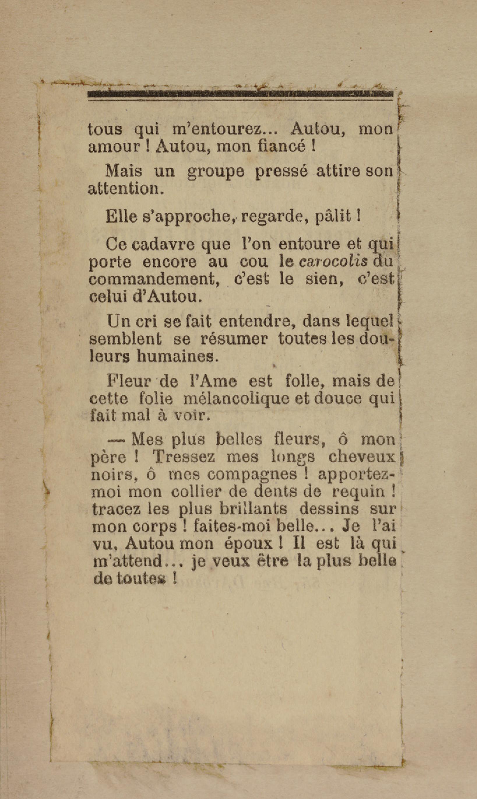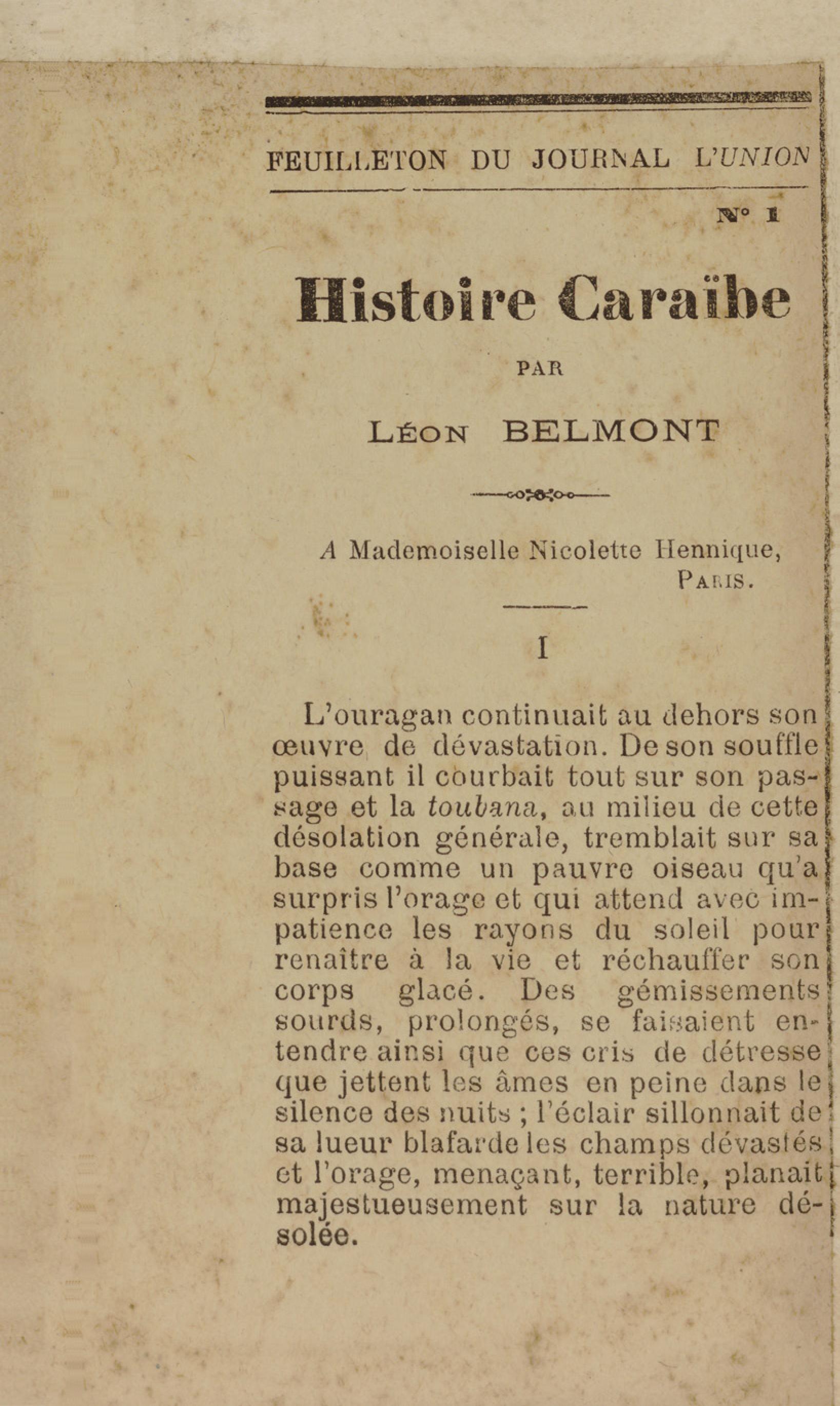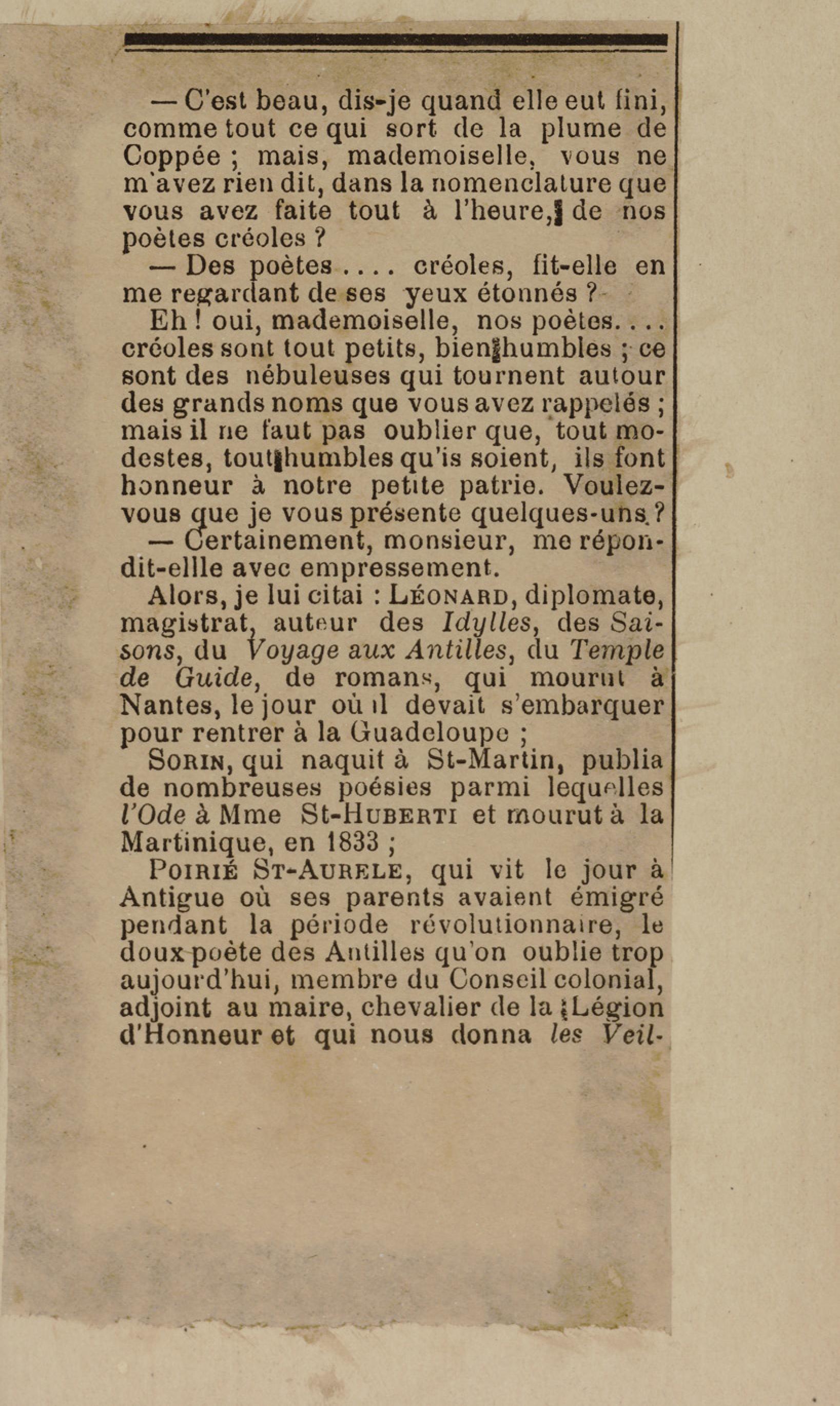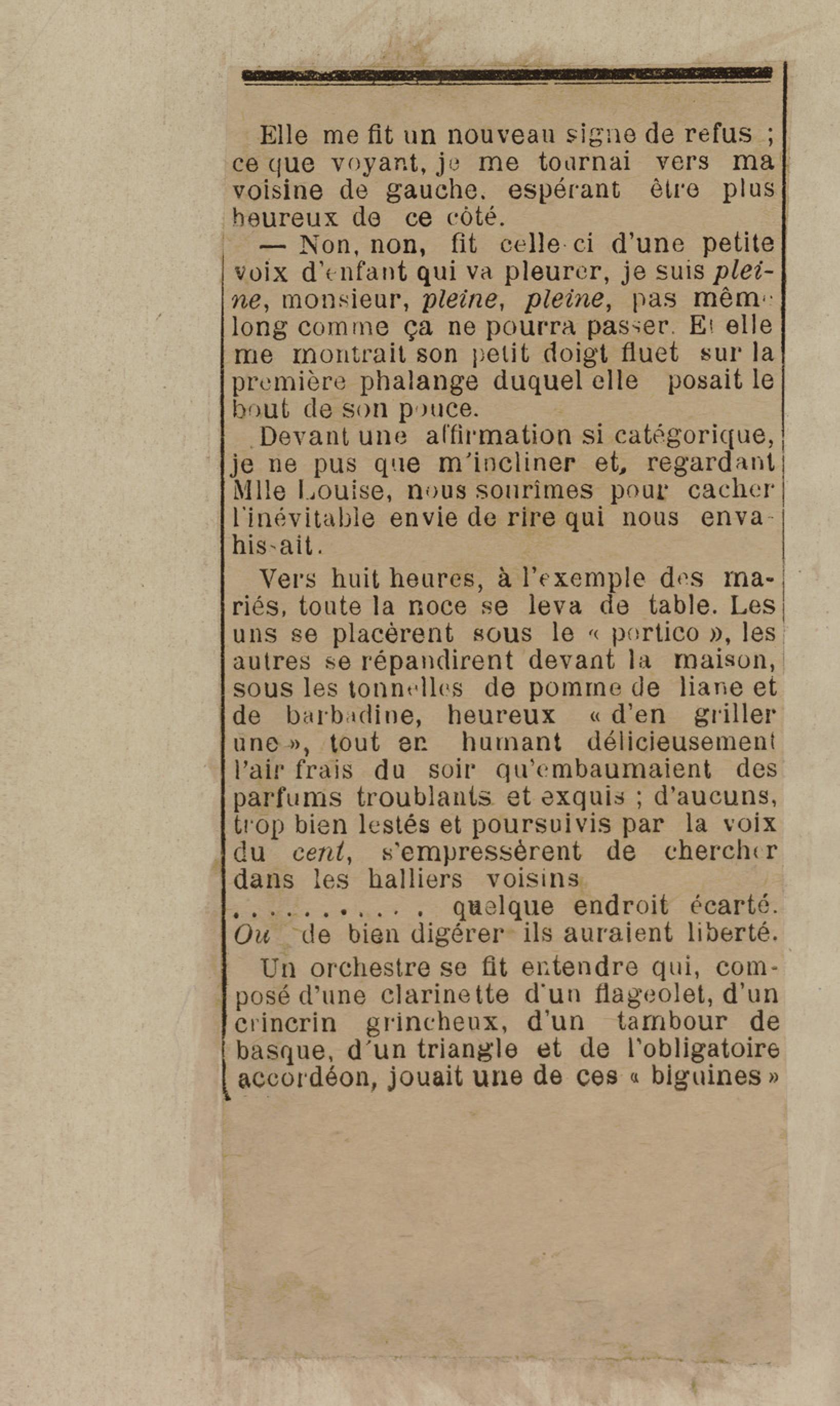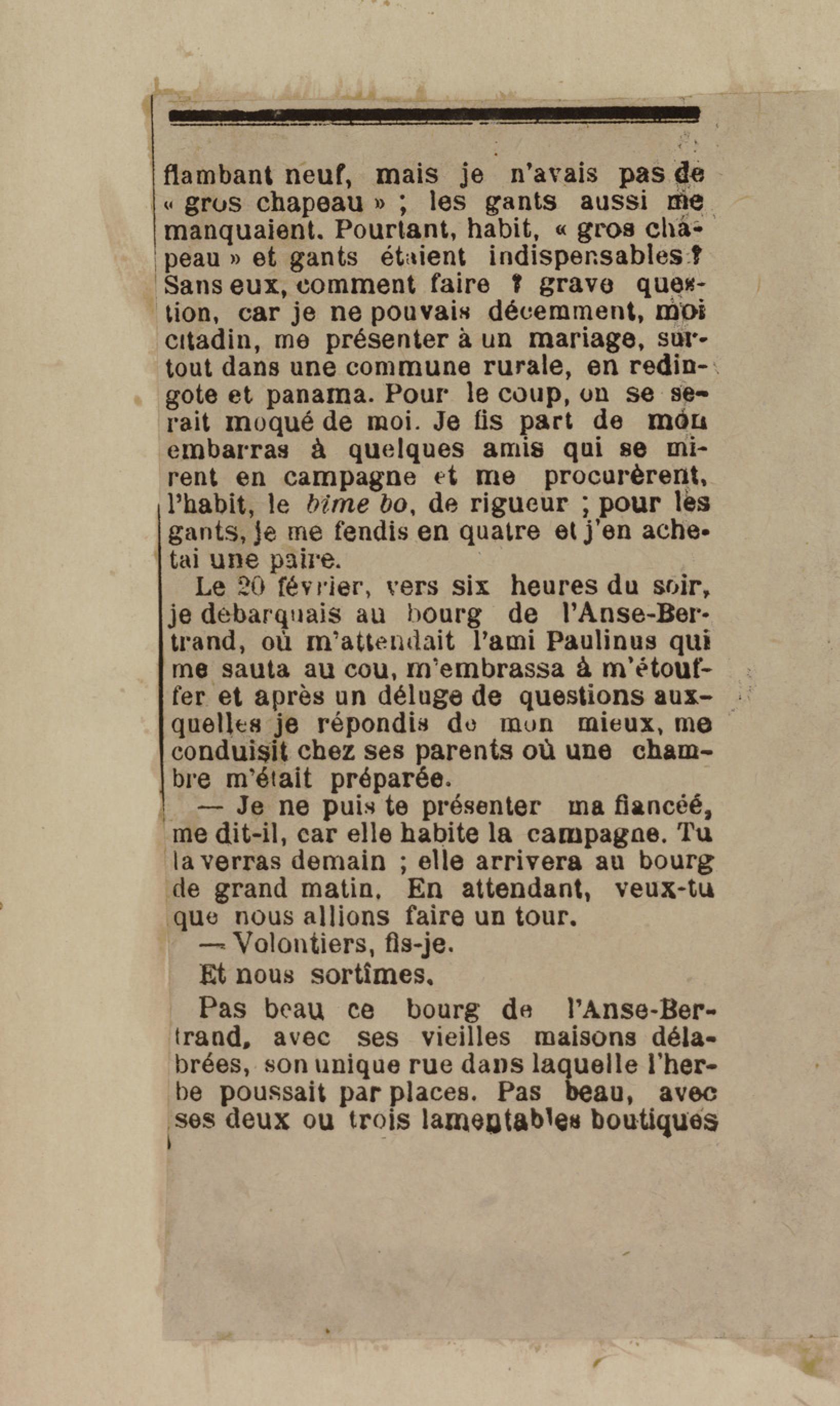 - Contient plusieurs nouvelles et romans-feuilletons publiés par épisodes dans la presse locale, notamment dans les journaux L'Avenir, Le Colonial et L'Union : Méloa. Histoire Caraïbe. Fleur de l’âme. Collation. A ma femme. Le calalou de monsieur le curé. Bonté d'enfant. Comment je me suis marié. Le mari de Latchimy. Le mariage de Jean-Paul Prineau. Nécessité n'a pas de loi. Les amours de voyage.