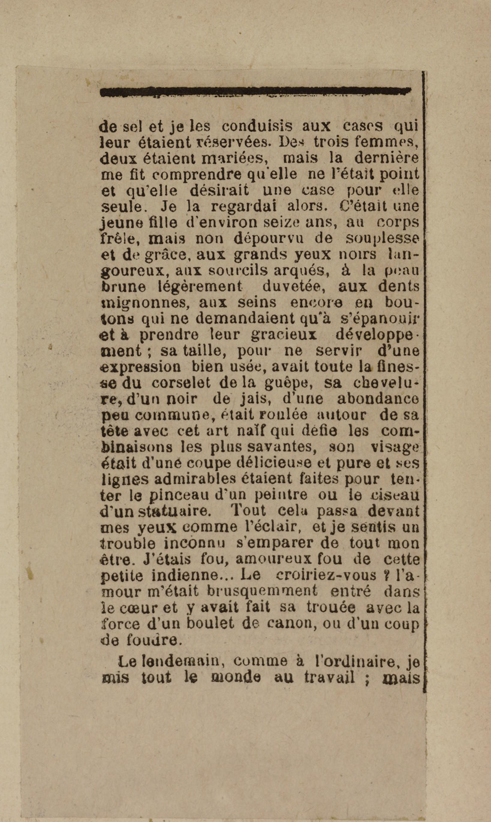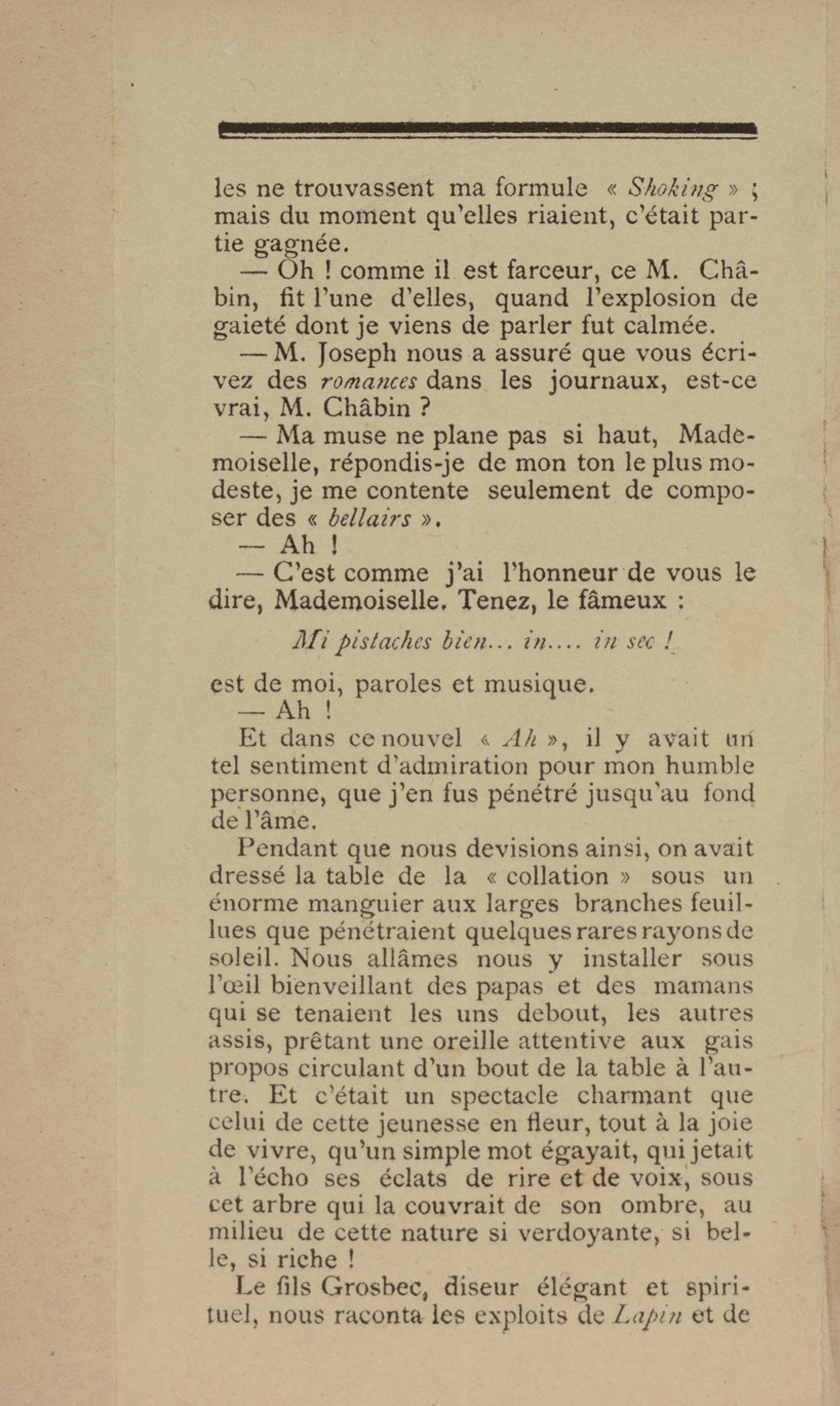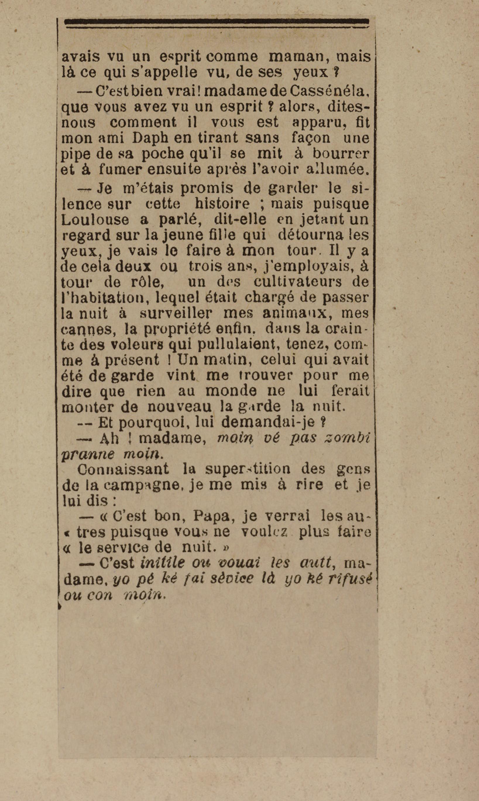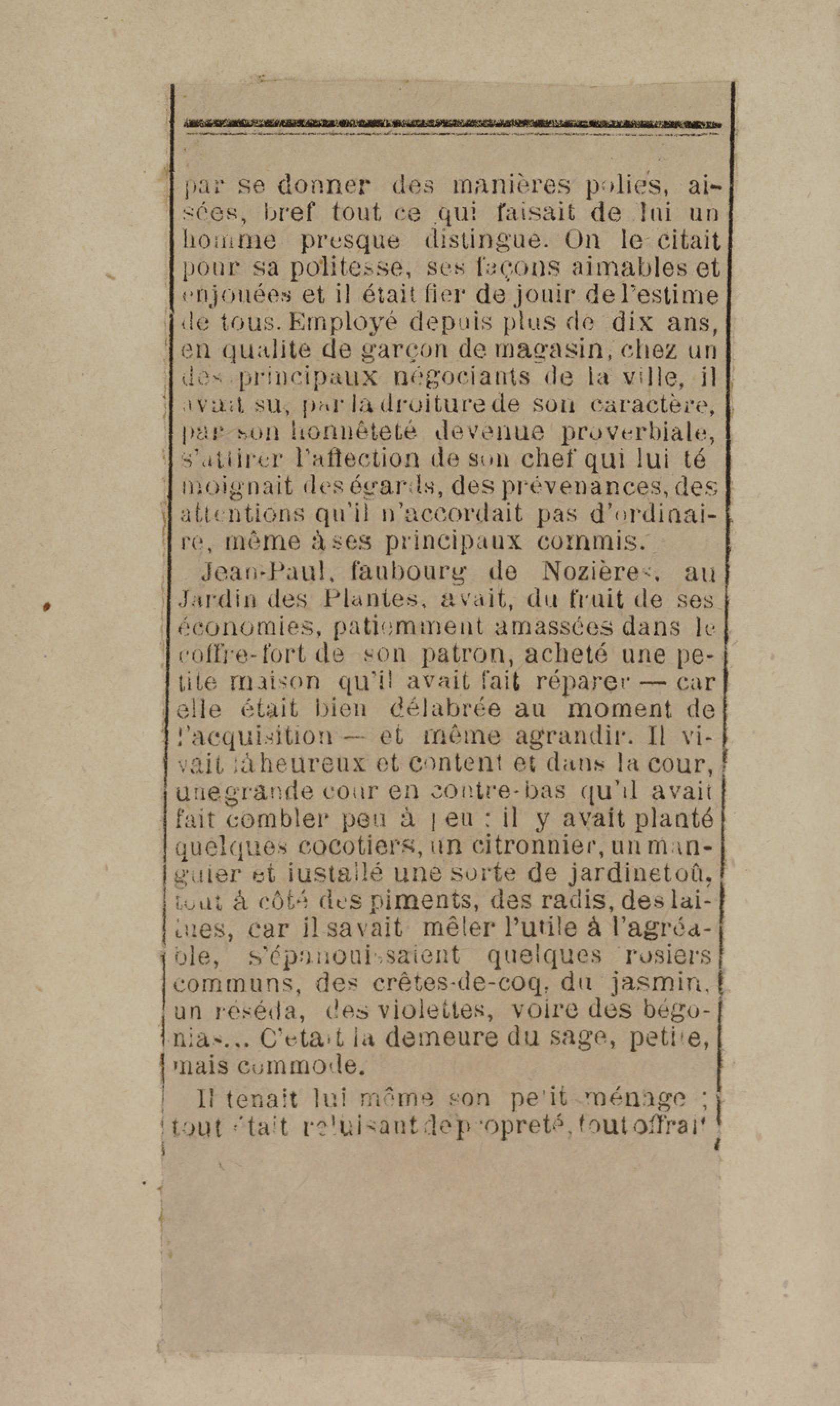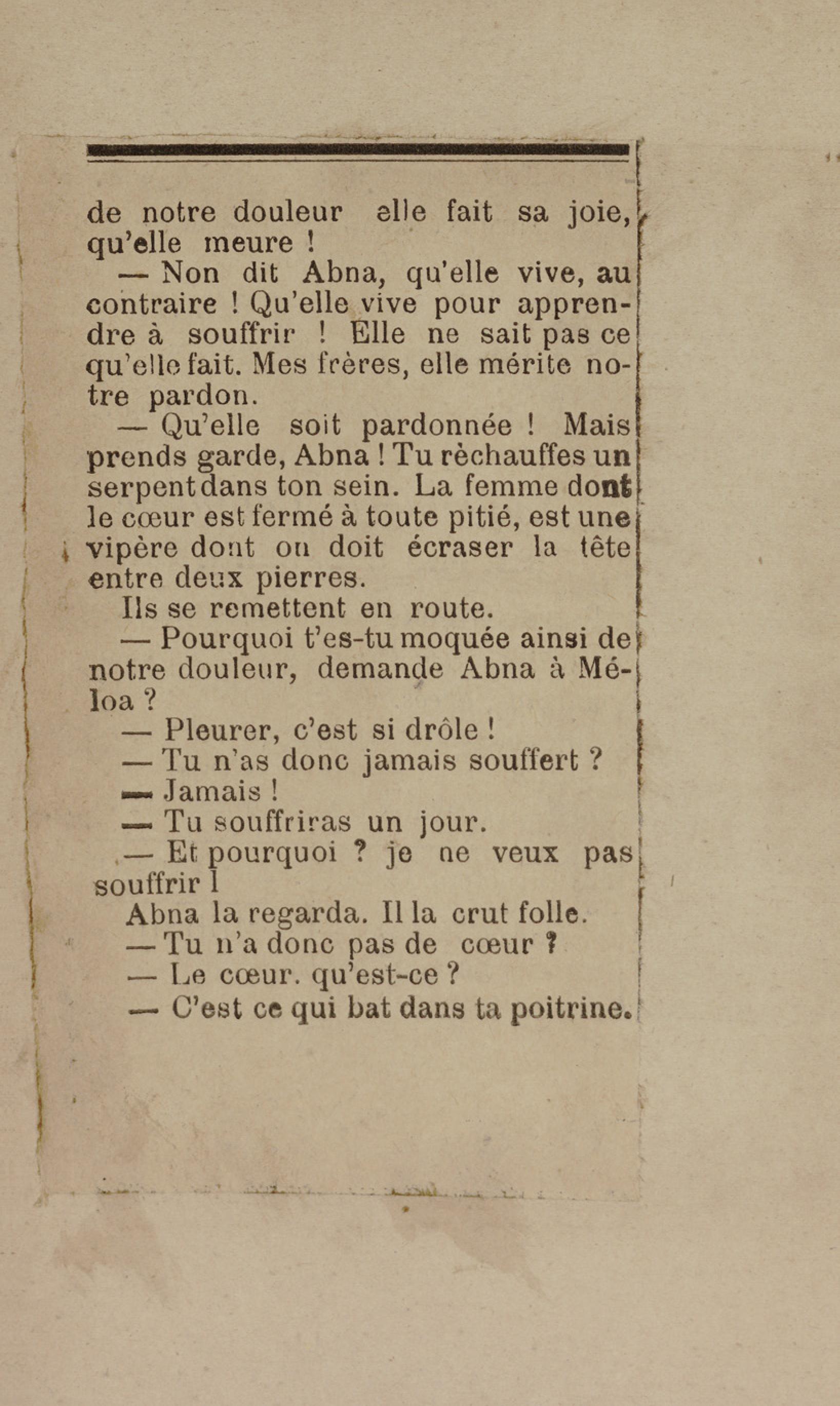 - Contient plusieurs nouvelles et romans-feuilletons publiés par épisodes dans la presse locale, notamment dans les journaux L'Avenir, Le Colonial et L'Union : Méloa. Histoire Caraïbe. Fleur de l’âme. Collation. A ma femme. Le calalou de monsieur le curé. Bonté d'enfant. Comment je me suis marié. Le mari de Latchimy. Le mariage de Jean-Paul Prineau. Nécessité n'a pas de loi. Les amours de voyage.