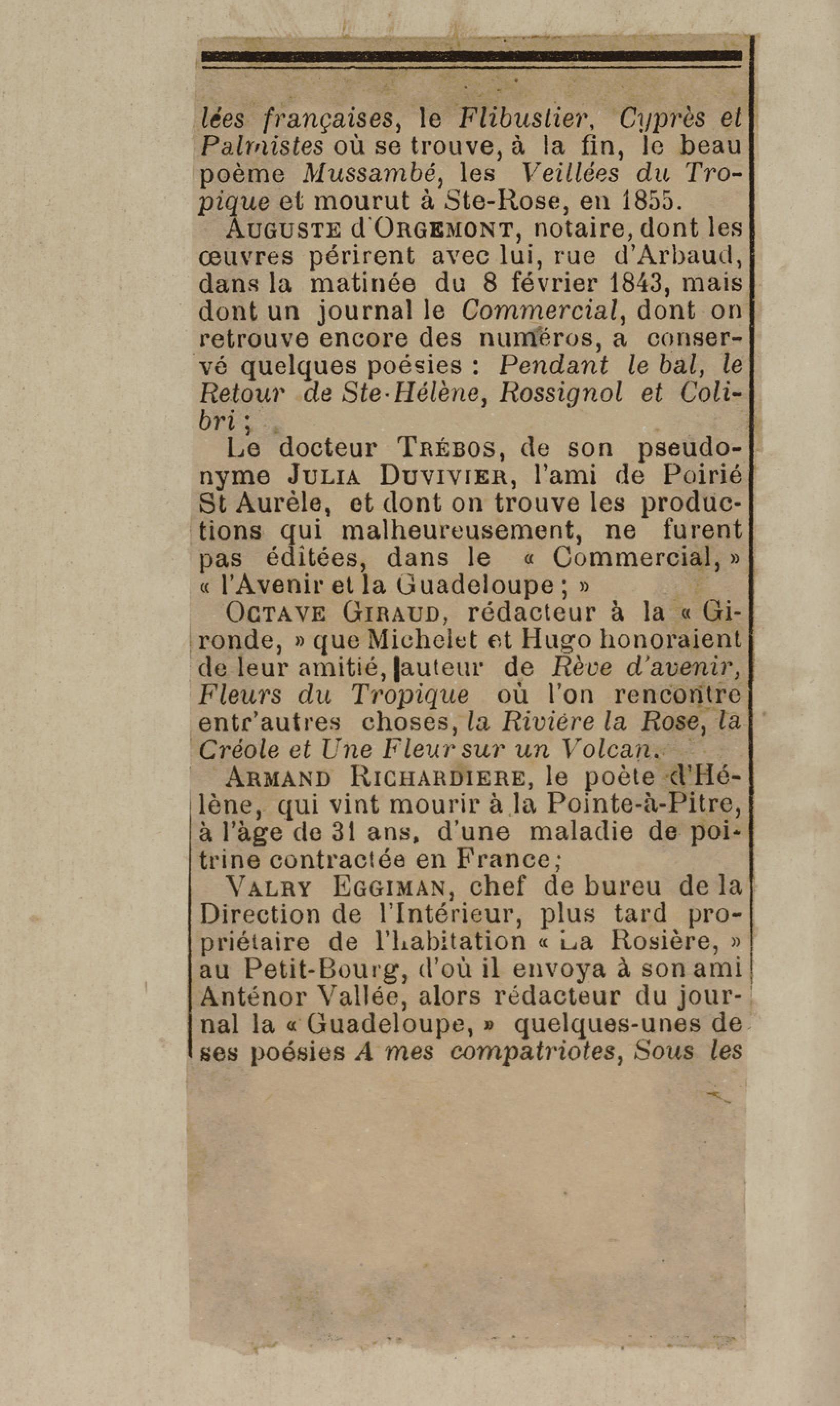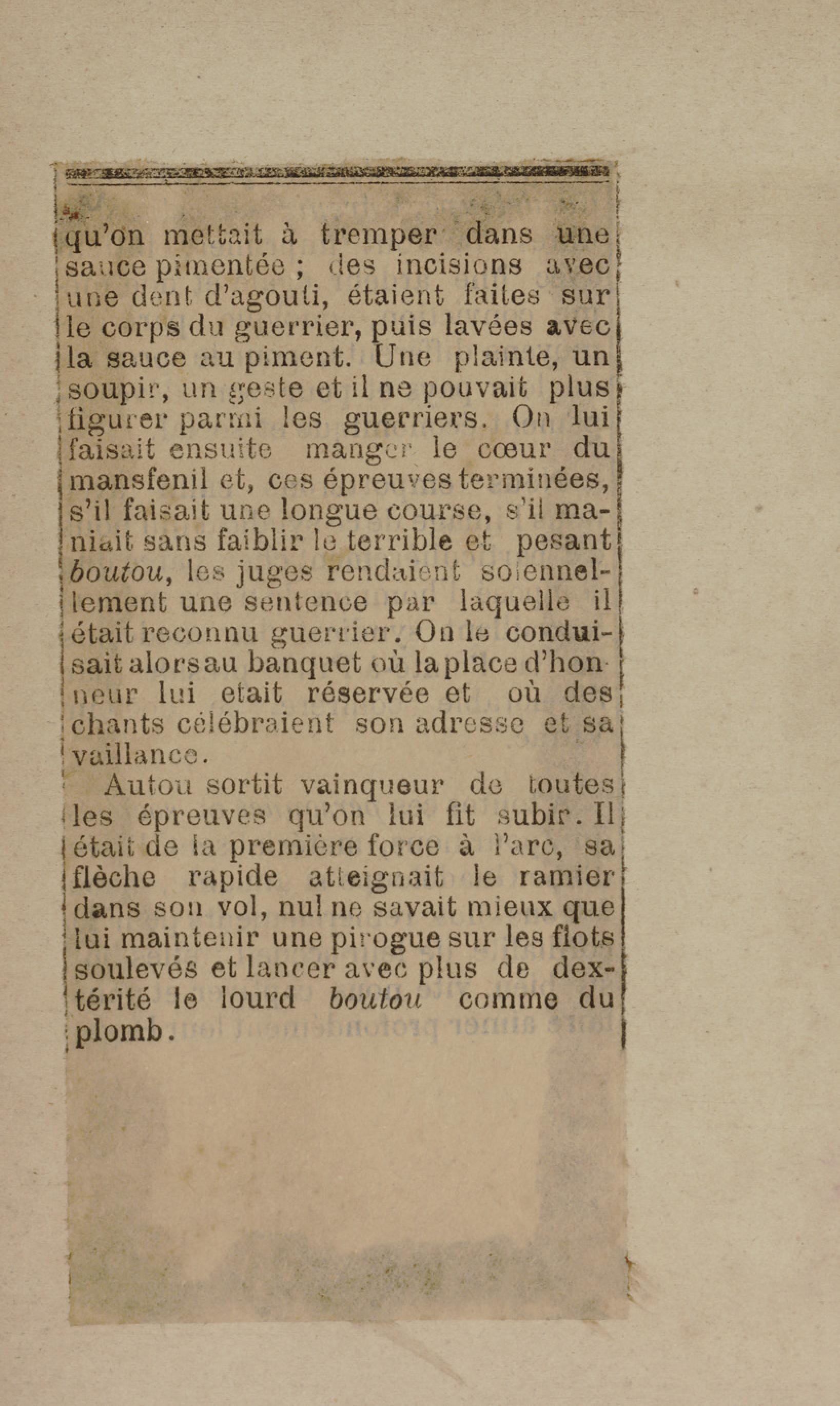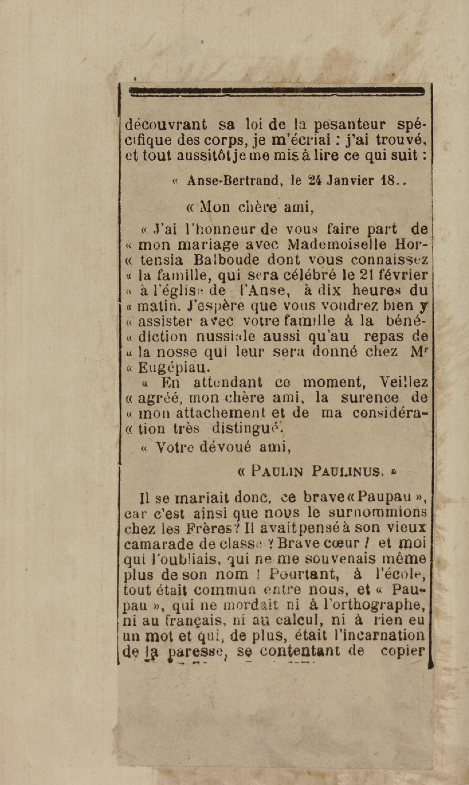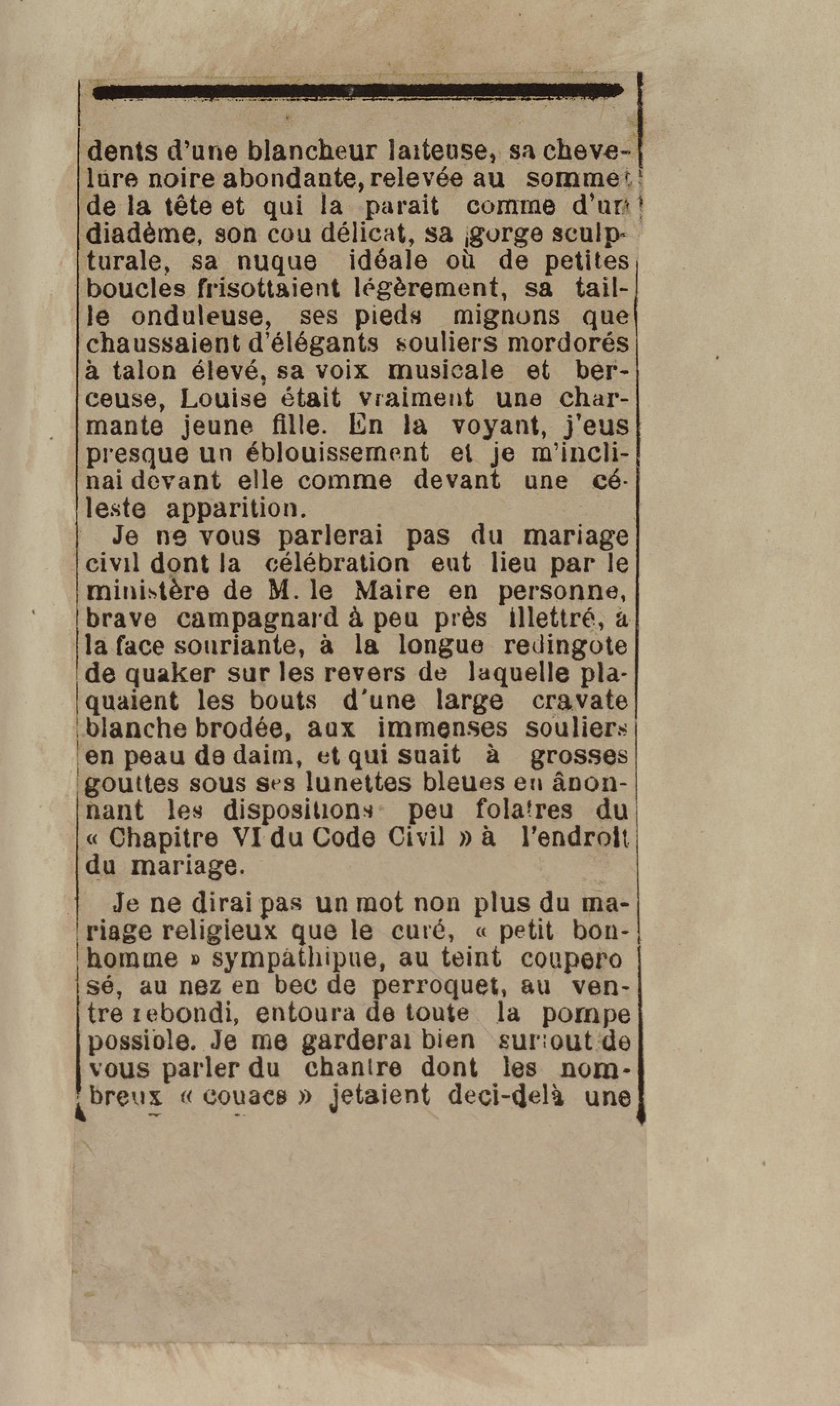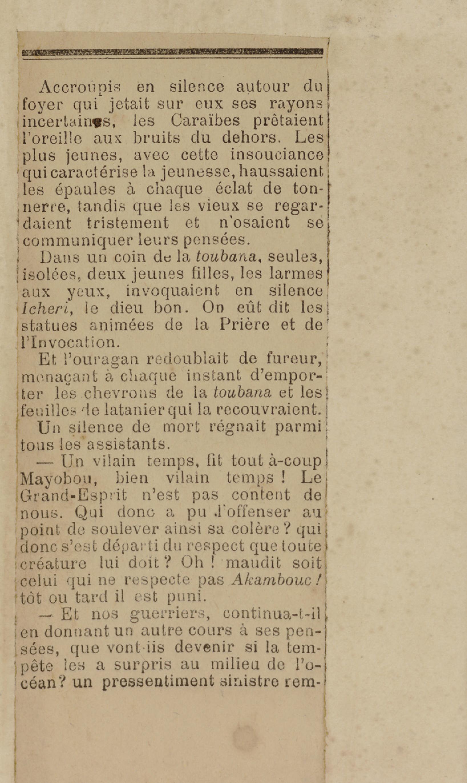 - Contient plusieurs nouvelles et romans-feuilletons publiés par épisodes dans la presse locale, notamment dans les journaux L'Avenir, Le Colonial et L'Union : Méloa. Histoire Caraïbe. Fleur de l’âme. Collation. A ma femme. Le calalou de monsieur le curé. Bonté d'enfant. Comment je me suis marié. Le mari de Latchimy. Le mariage de Jean-Paul Prineau. Nécessité n'a pas de loi. Les amours de voyage.