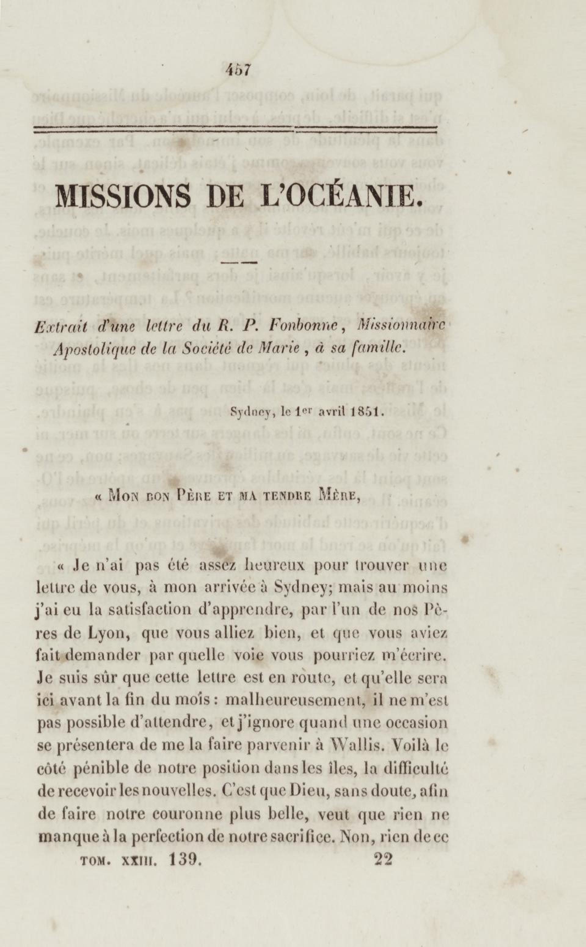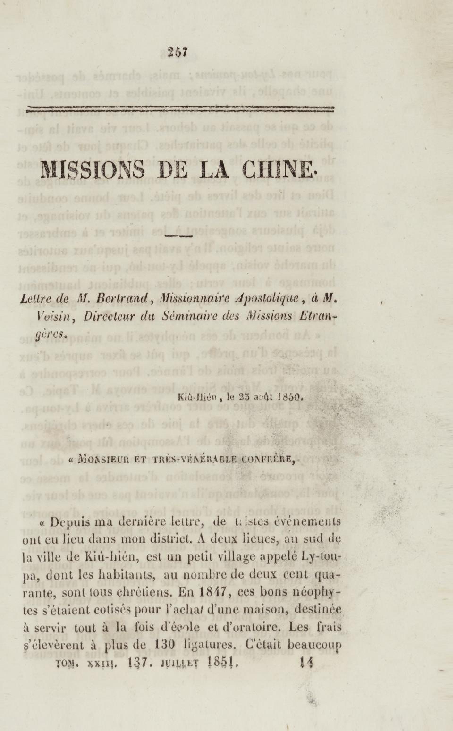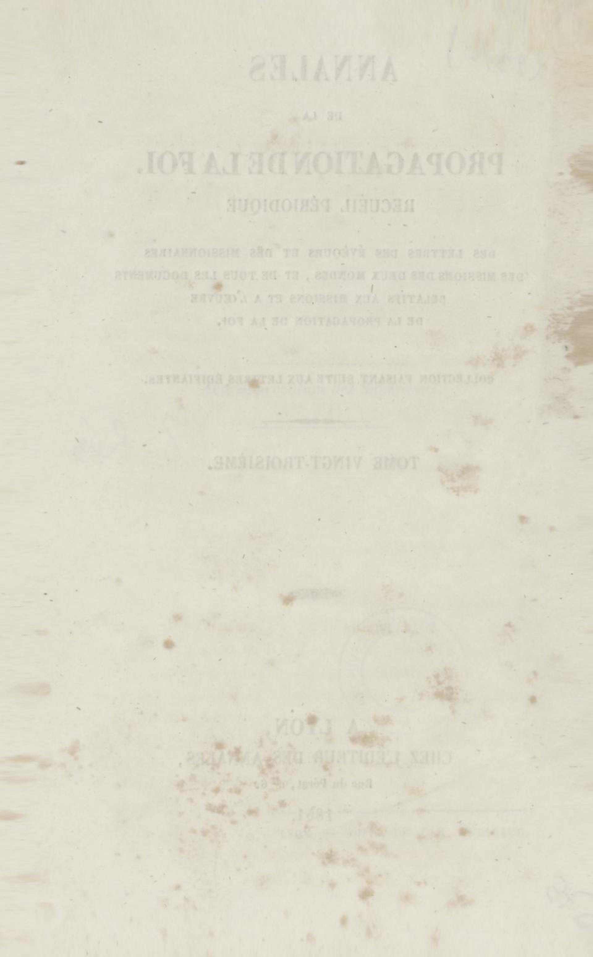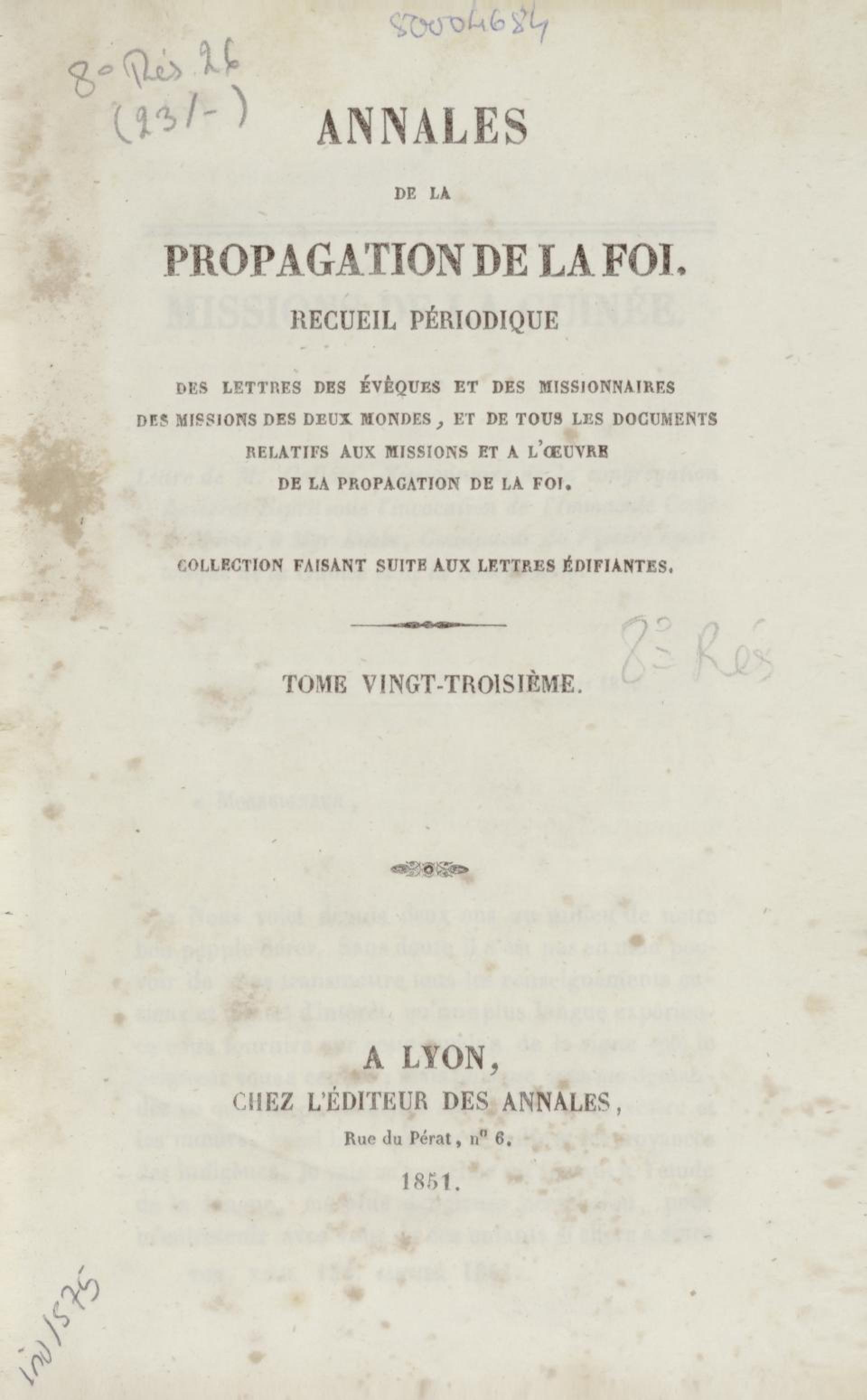- Annales de la propagation de la foi. recueil périodique. Des lettres des évêques et des missionnaires des missions des deux mondes, et de tous les documents relatifs aux missions et à l'œuvre de la propagation de la foi. Tome vingt-troisième