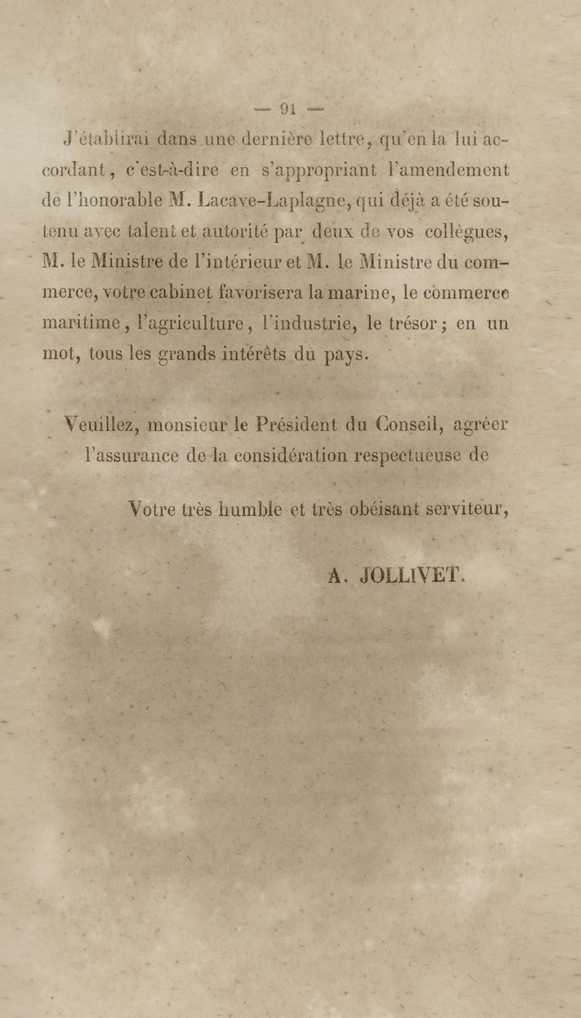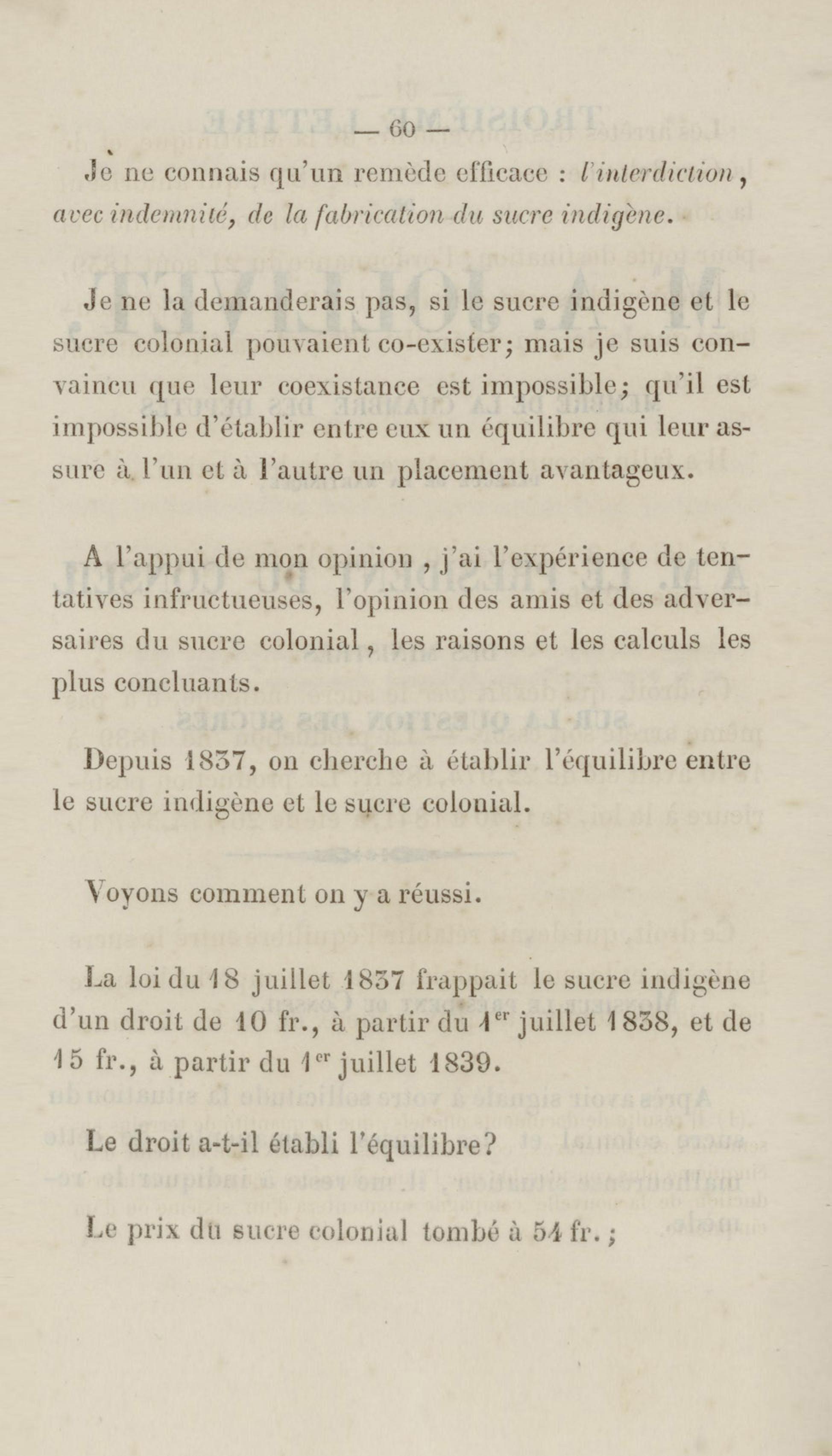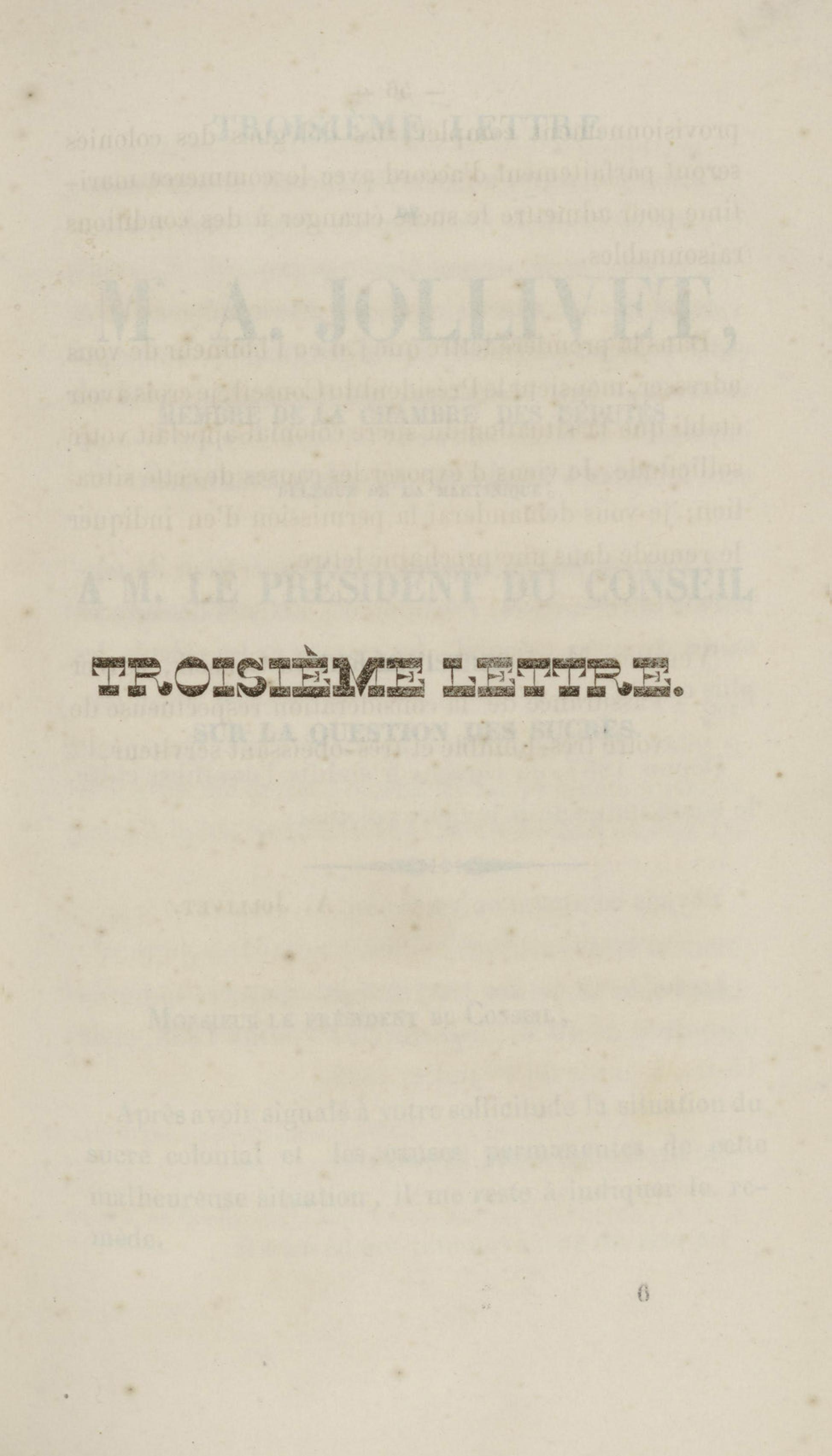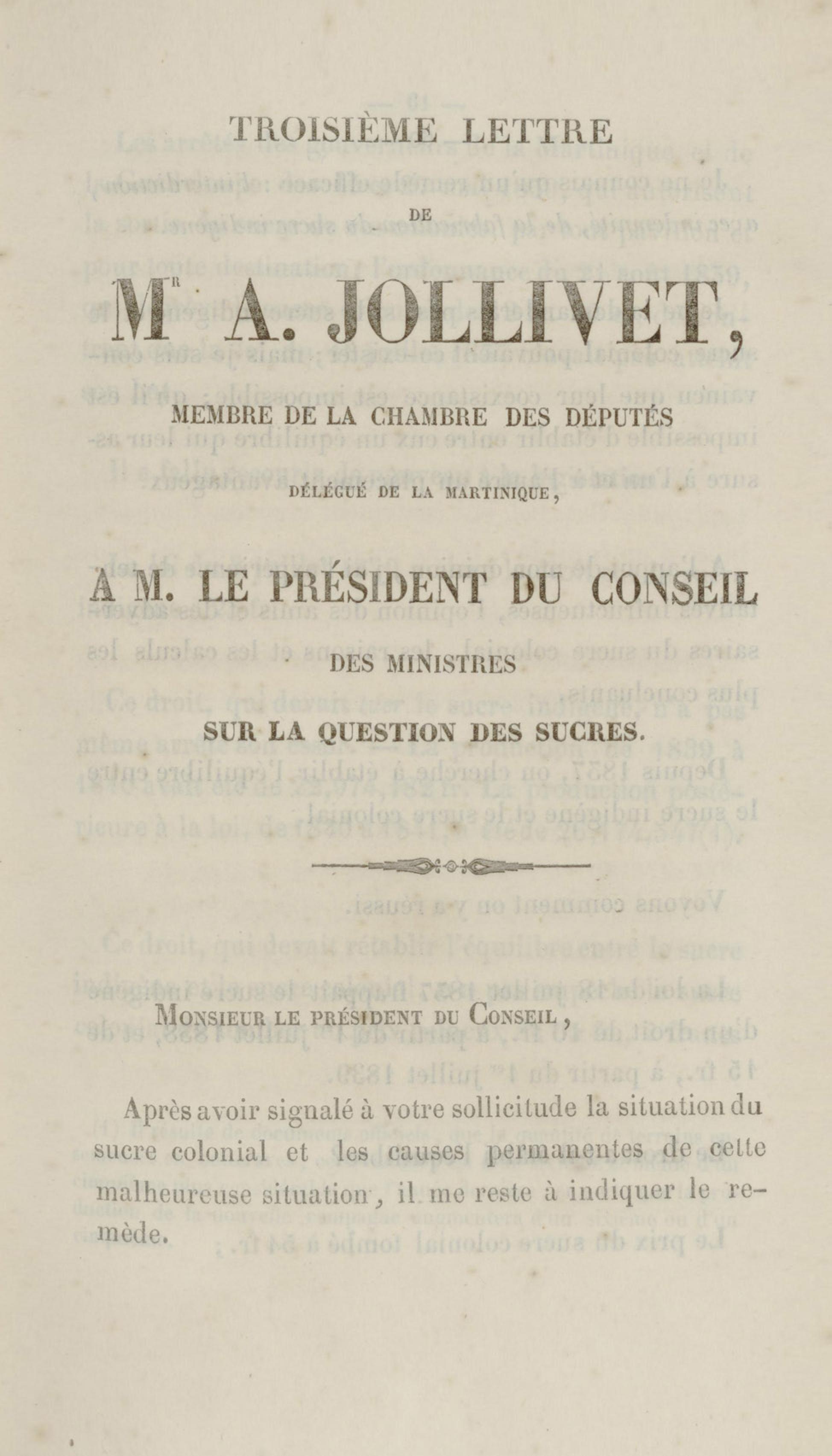 Troisième lettre de Mr A. Jollivet, membre de la chambre des députés, délégué de la Martinique, à M. le président du conseil des ministres sur la question des sucres