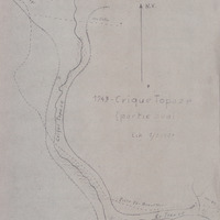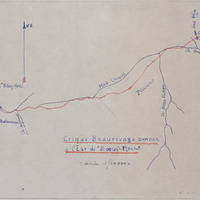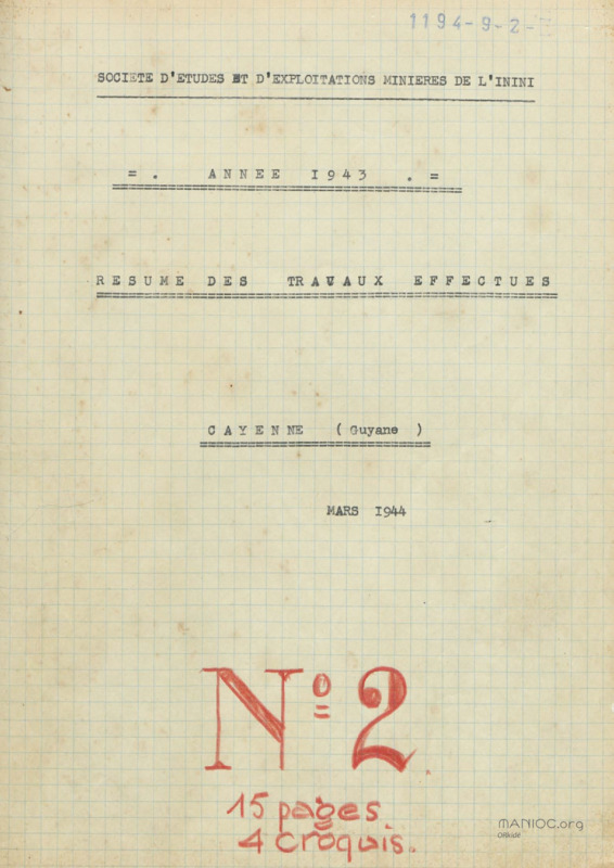 - Synthèse des travaux effectués en 1943 par la Société d'études et d'exploitations minières de l'Inini sur ses permis généraux, notamment dans les régions de P.I. et Bœuf Mort : poursuite des reconnaissances et travaux topographiques, amélioration des installations et des liaisons. Version finale dactylographiée et annotée, avec croquis.