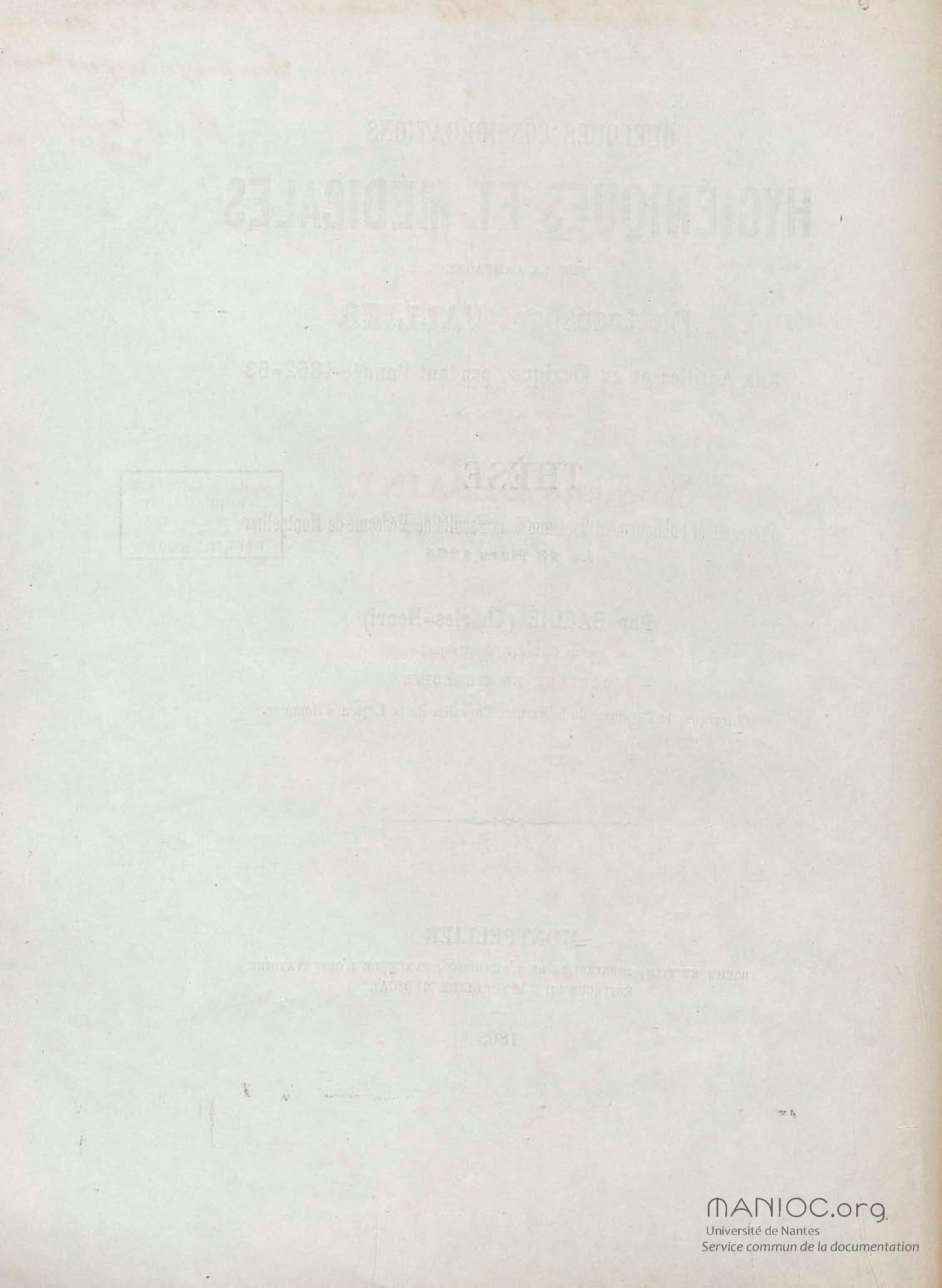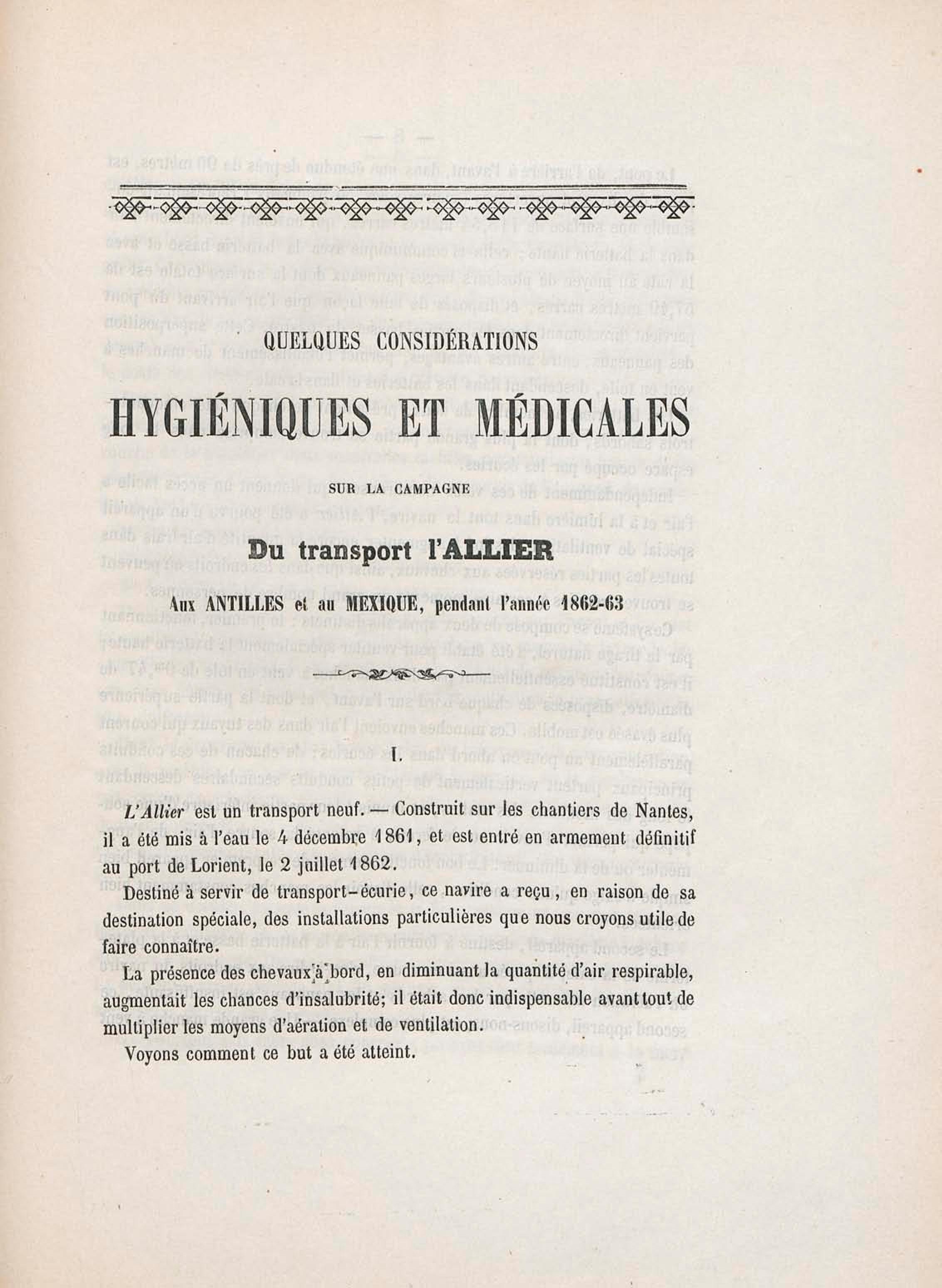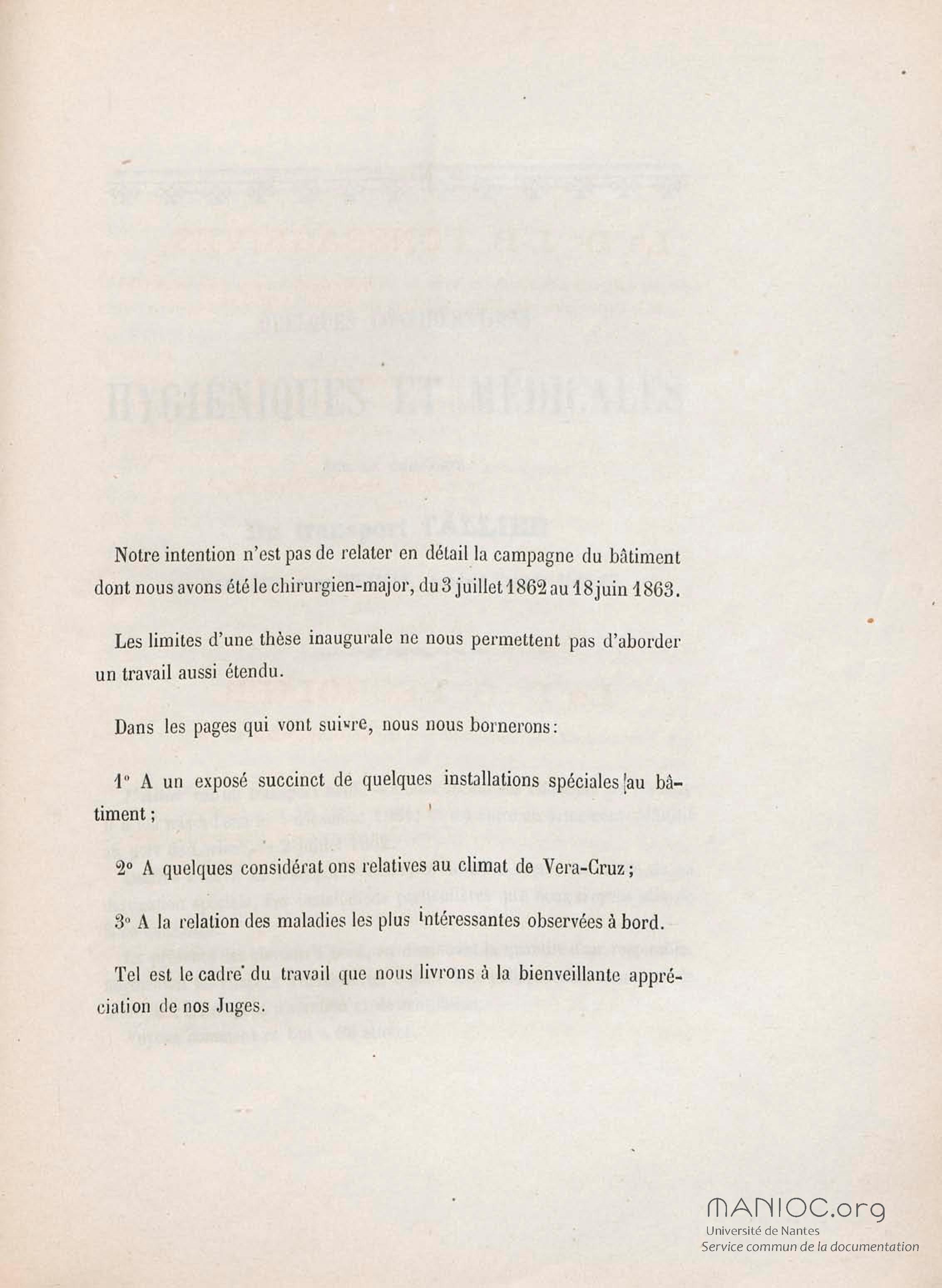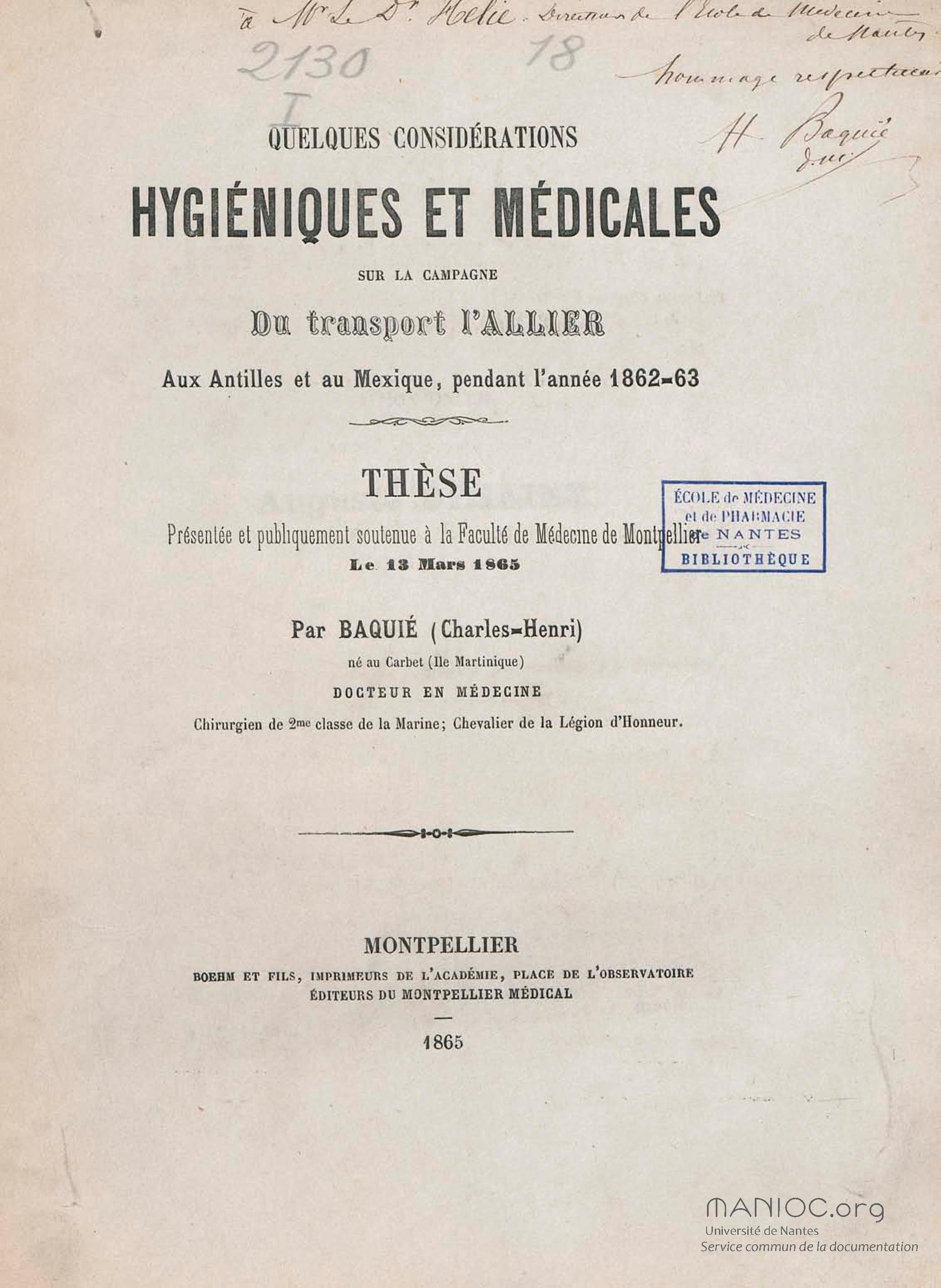 Quelques considérations hygiéniques et médicales sur la campagne du transport L'Allier aux Antilles et au Mexique pendant l'année 1862-63 : thèse présentée et publiquement soutenue à la Faculté de médecine de Montpellier le 13 mars 1865