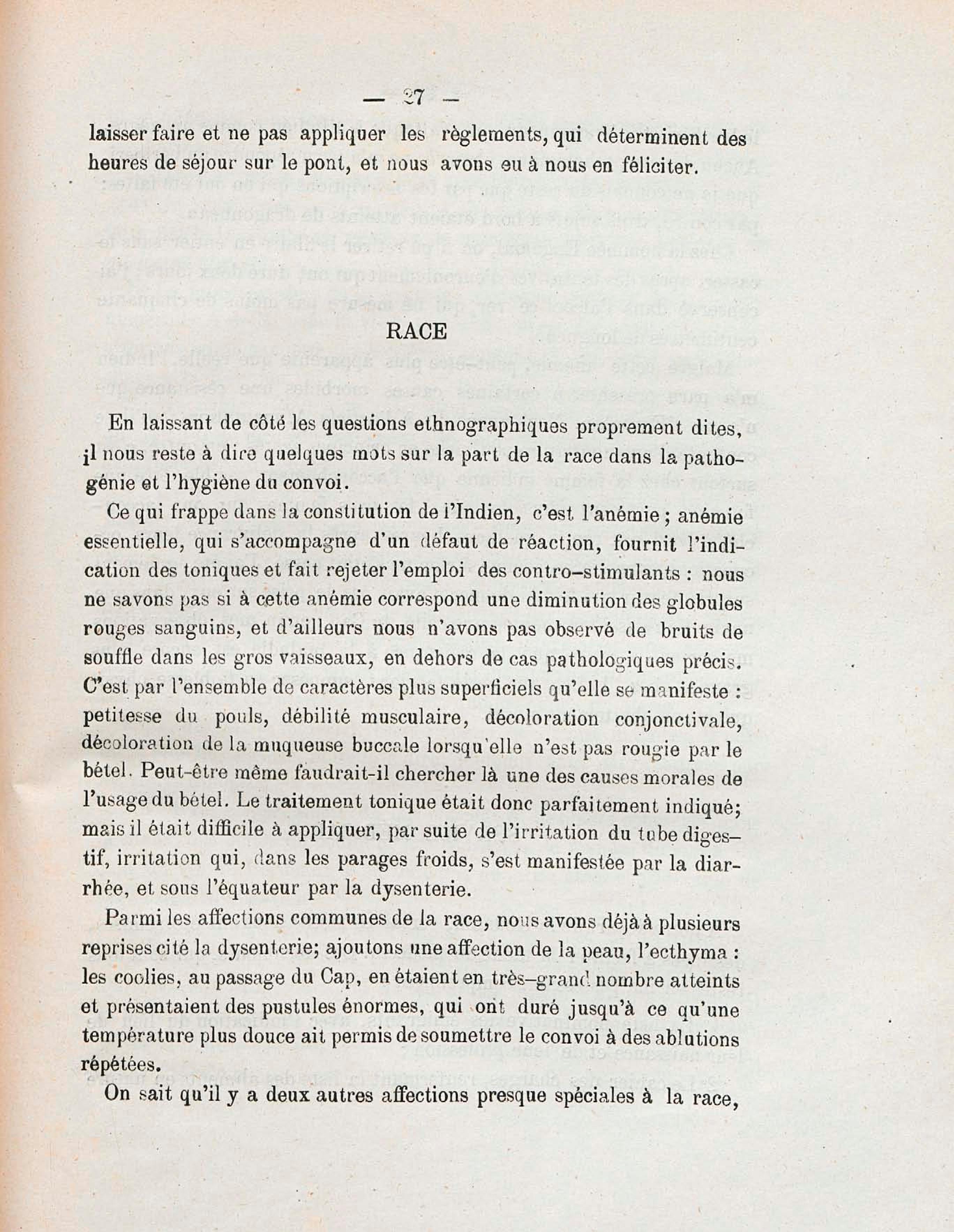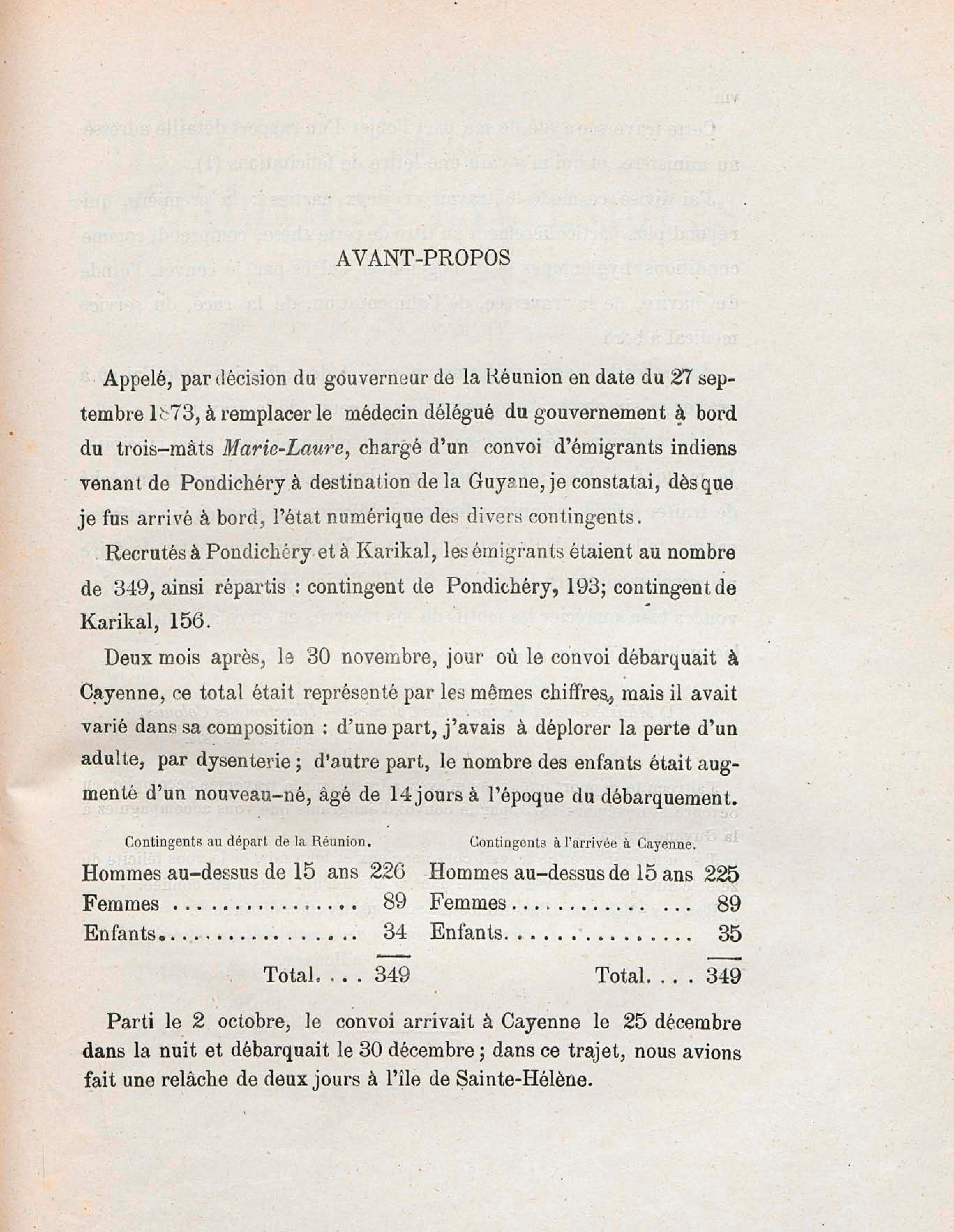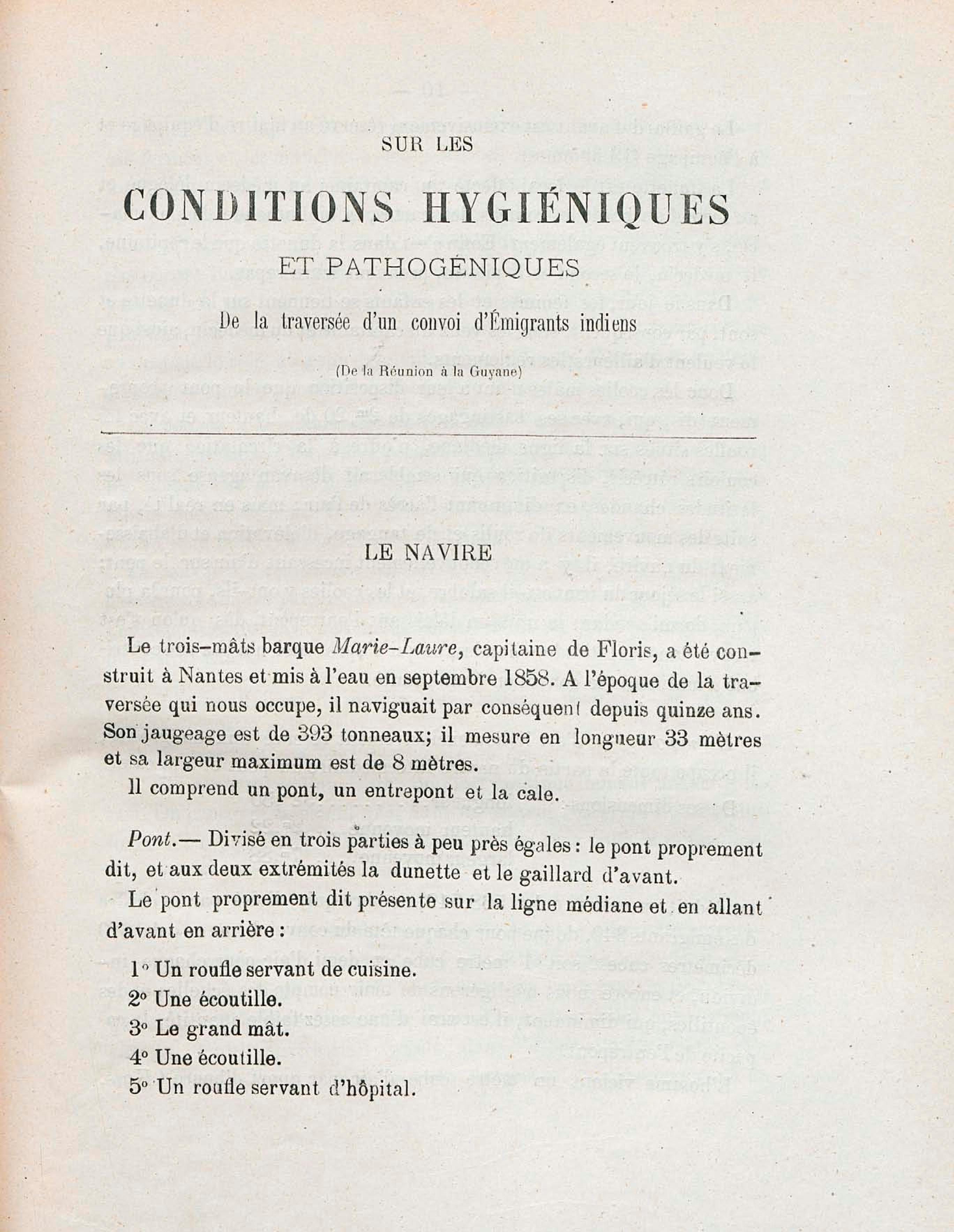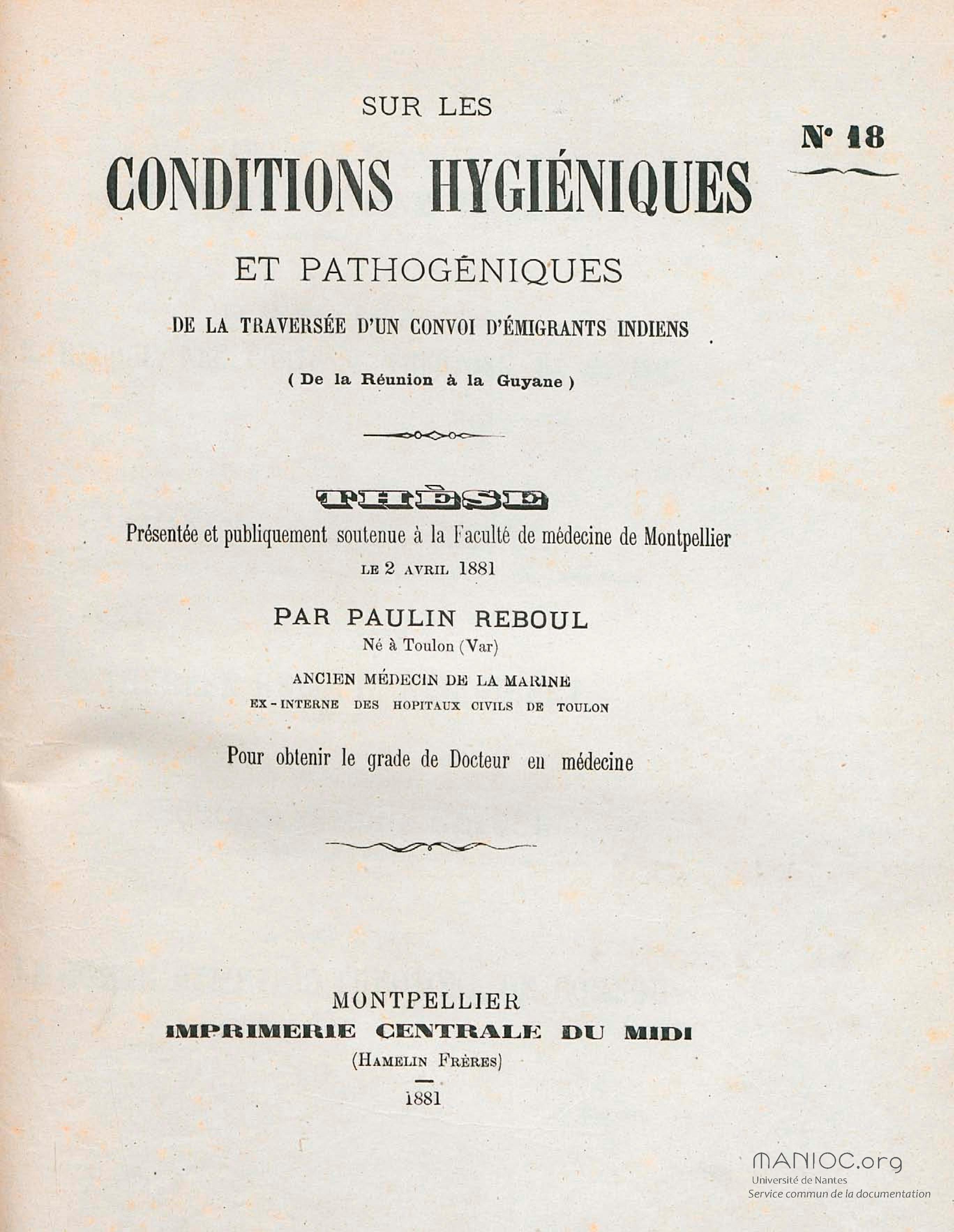 Sur les conditions hygiéniques et pathogéniques de la traversée d'un convoi d'émigrants indiens, de la Réunion à la Guyane : thèse présentée et publiquement soutenue à la Faculté de médecine de Montpellier le 2 avril 1881
