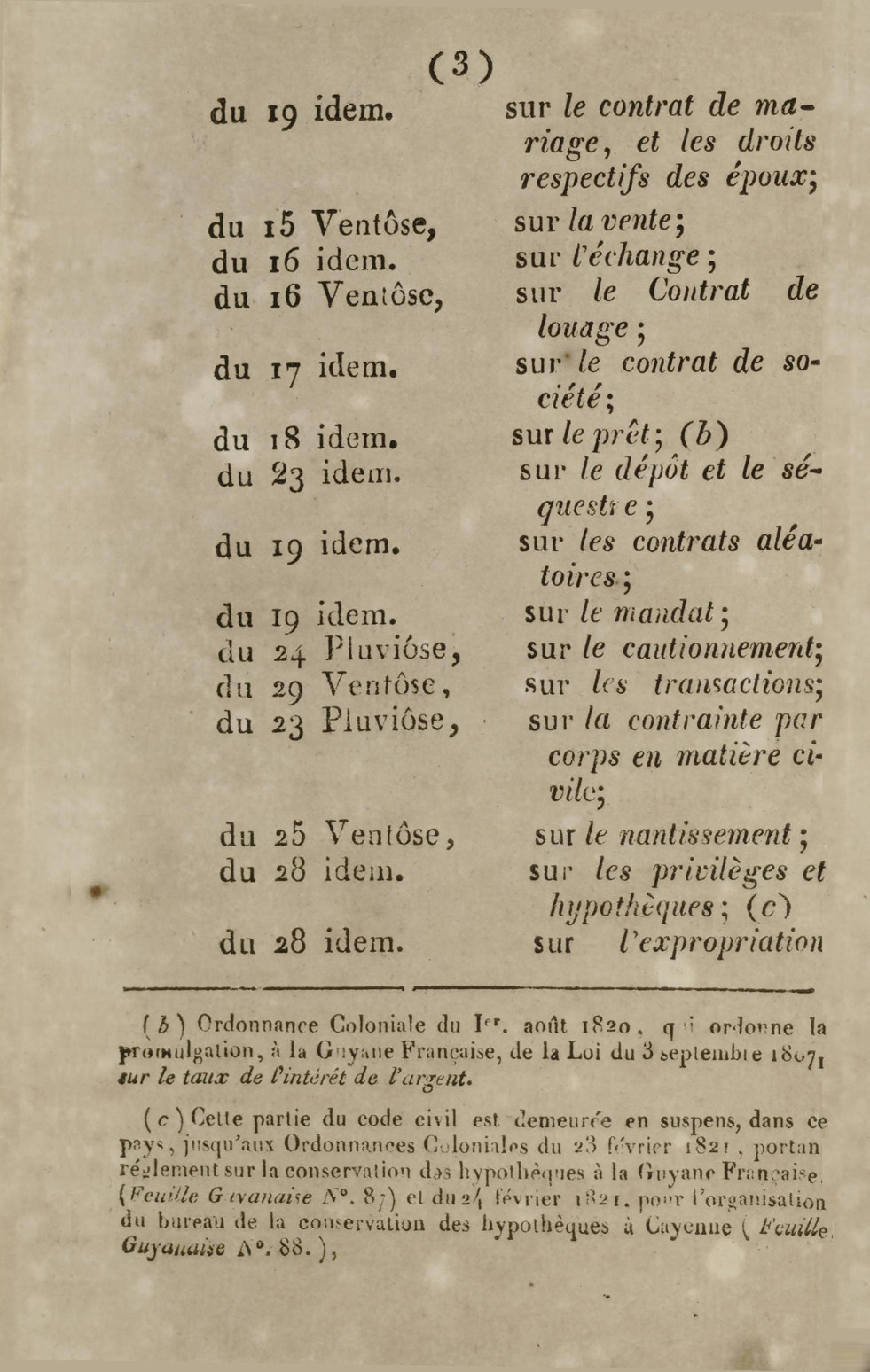 Fait partie de Guyane française : Code civil avec modifications : ordonnance coloniale du 1er vendémiaire an XIV (23 septembre 1805) pour son introduction dans cette colonie