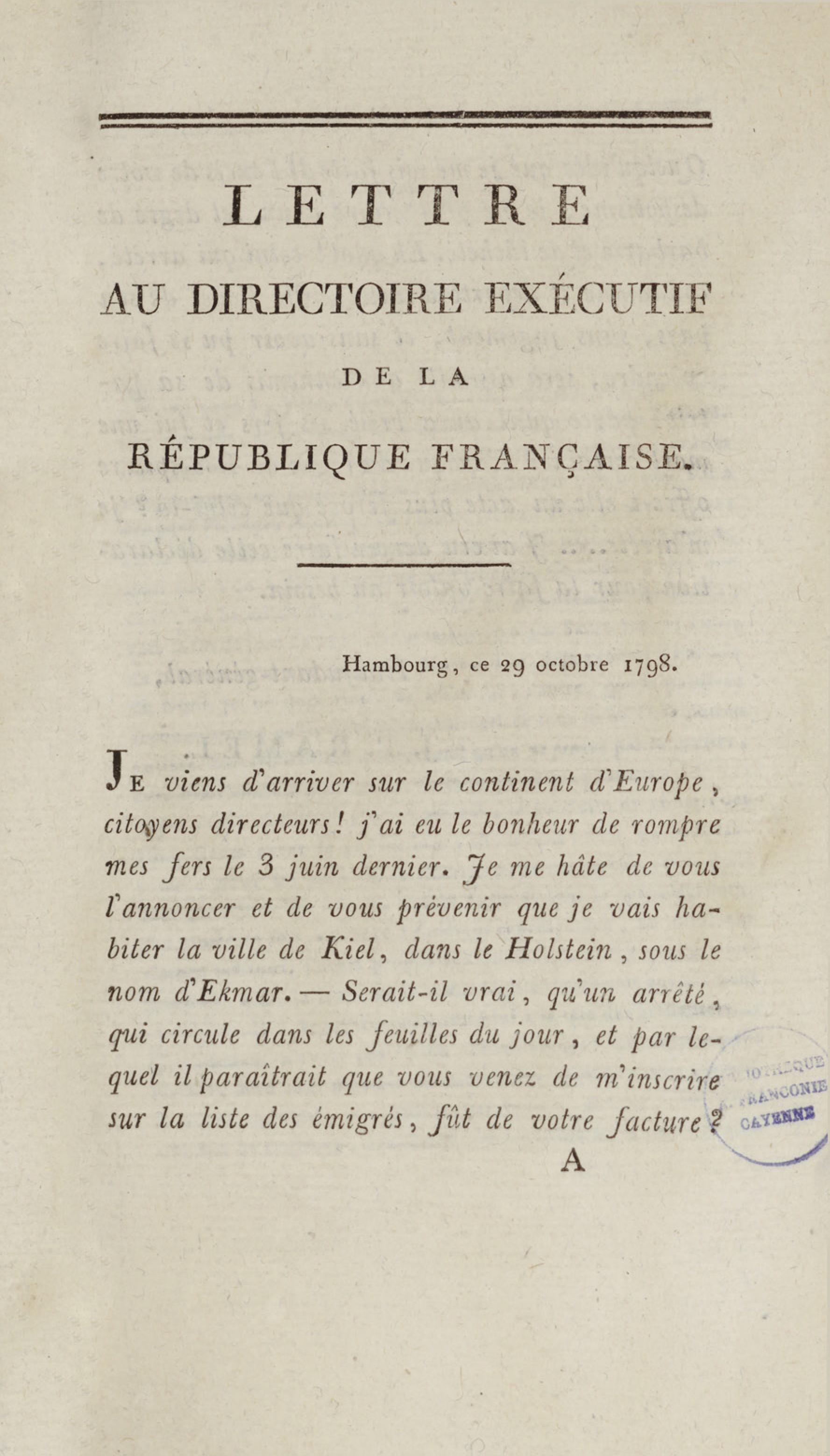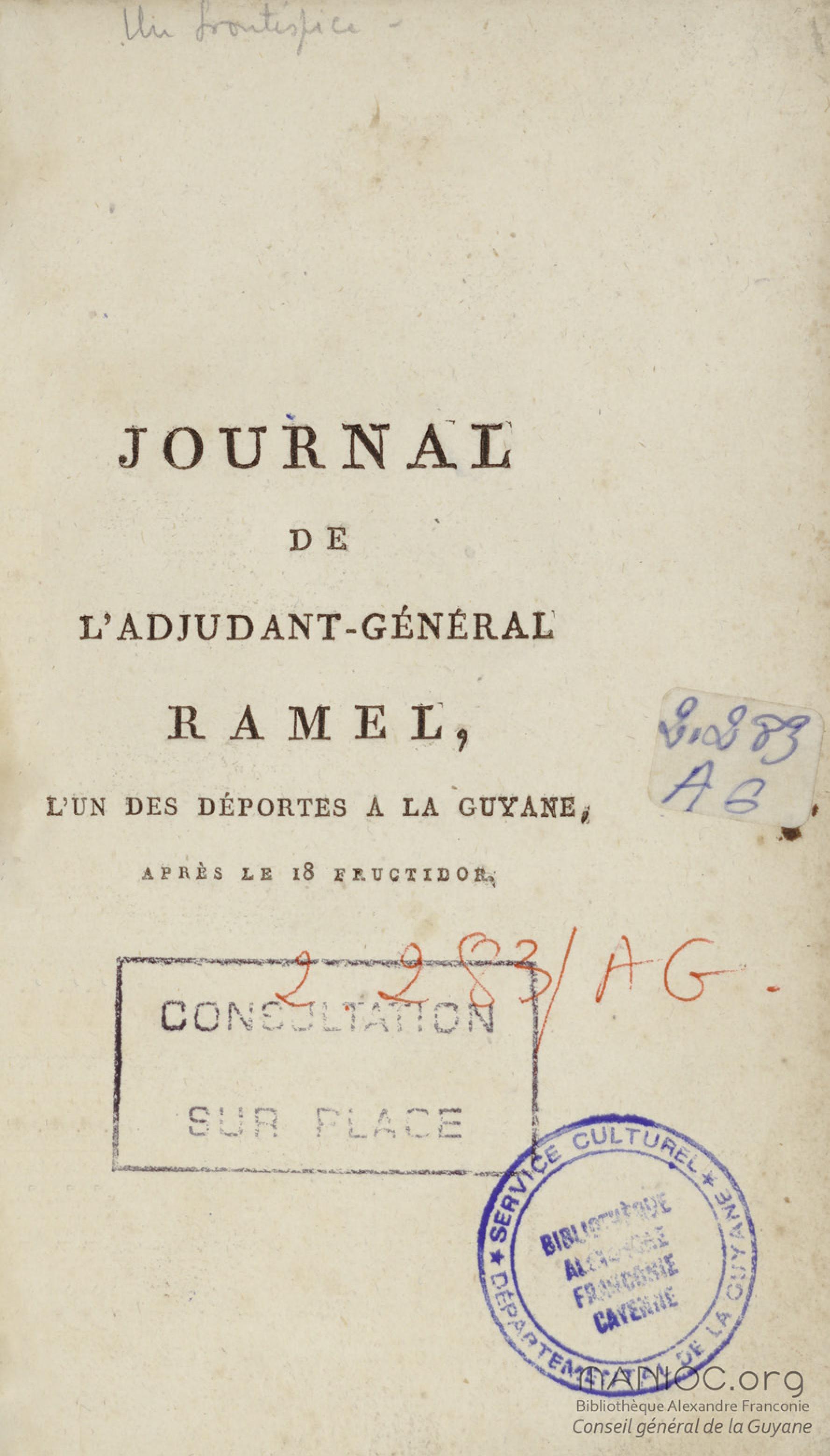 - Journal de l'adjudant-général Ramel, commandant de la garde du corps législatif de la République française, l'un des déportés à la Guyane après le 18 fructidor : sur les faits relatifs à cette journée, sur le transport, le séjour et l'évasion de quelques uns des déportés : avec des détails circonstanciés de la fin terrible du général Murinais, de Tronçon-Ducoudray, Lafond-Ladebat, etc., etc.