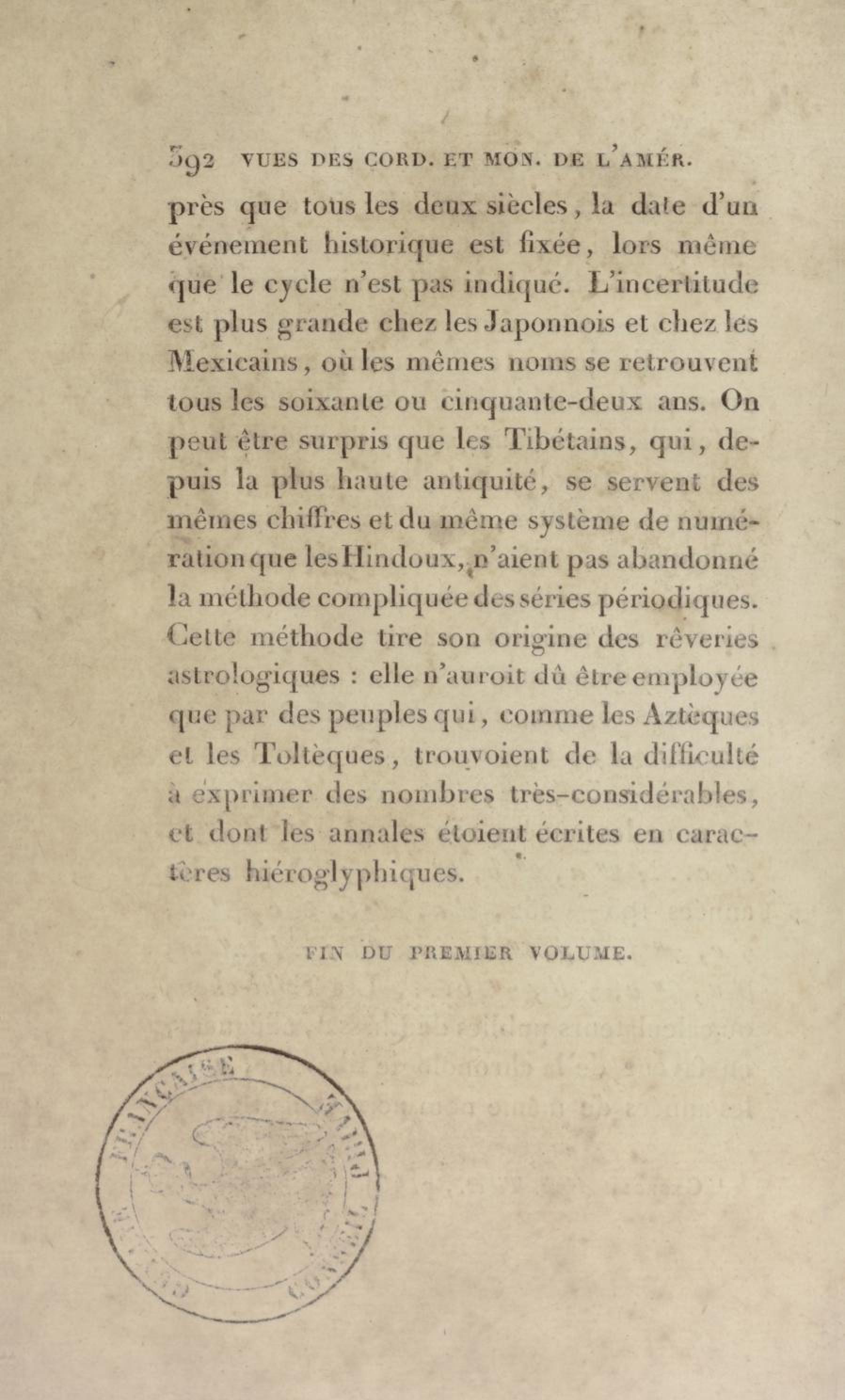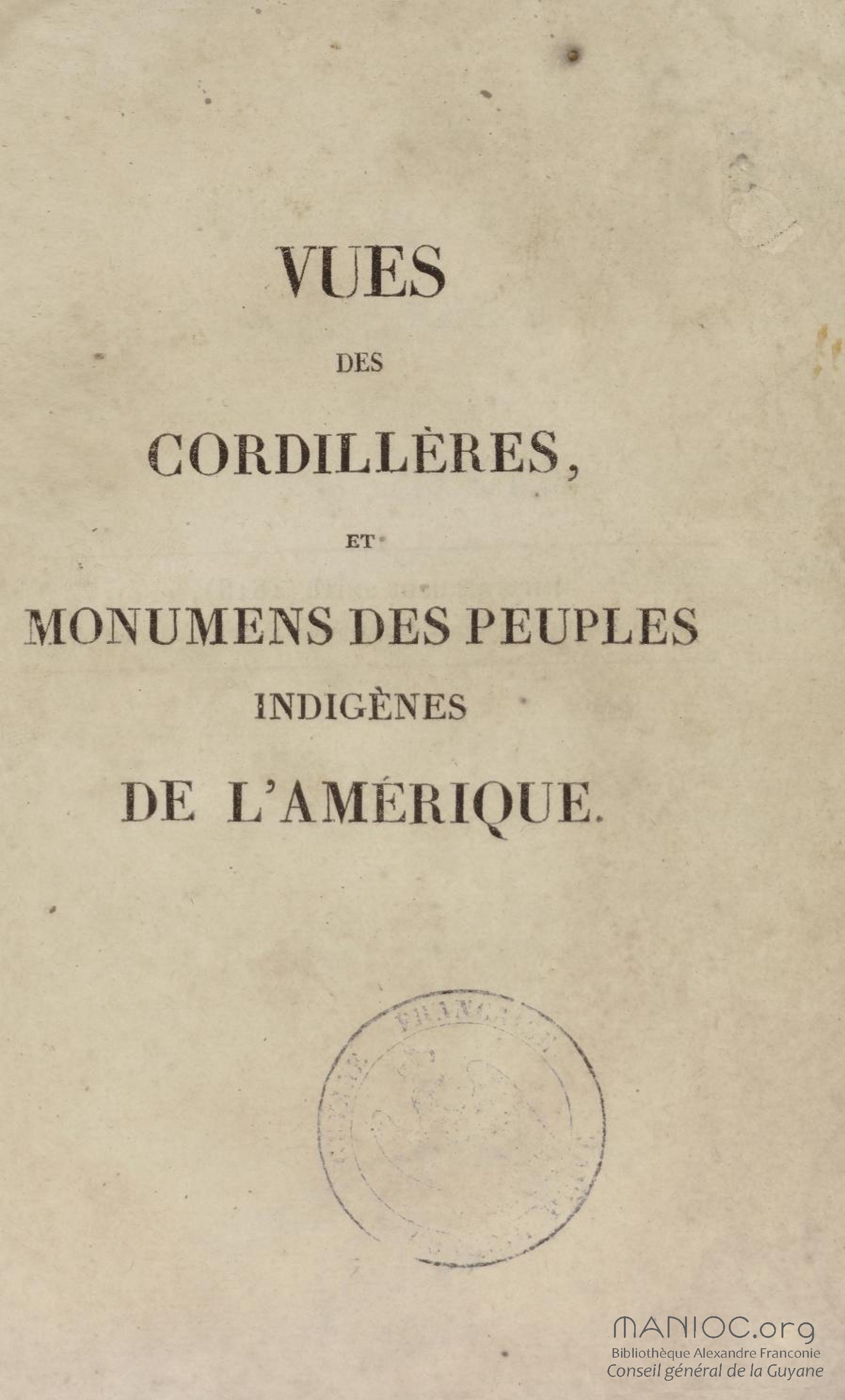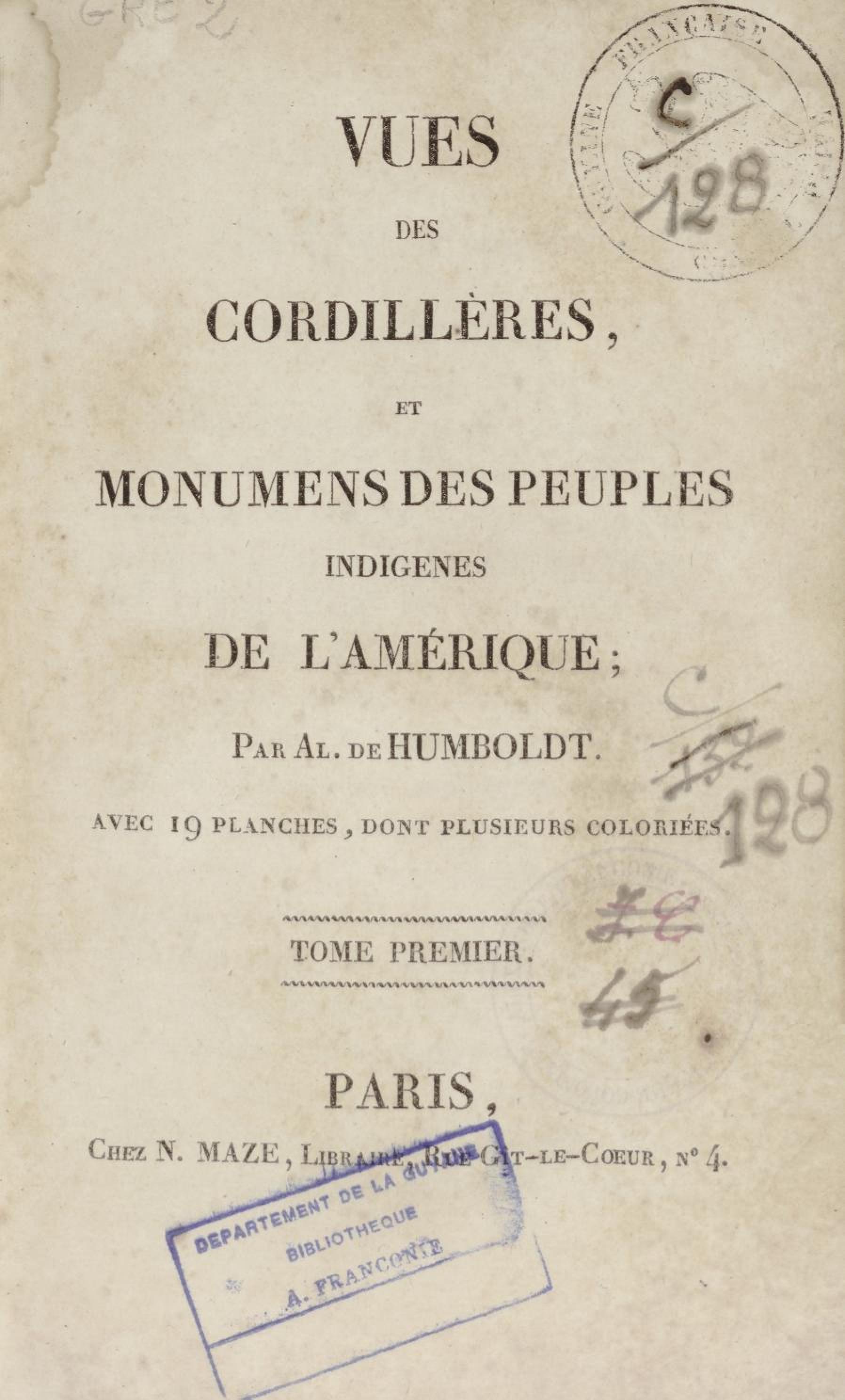 - Vues des Cordillères et monumens des peuples indigènes de l'Amérique : avec 19 planches, dont plusieurs coloriées. Tome premier