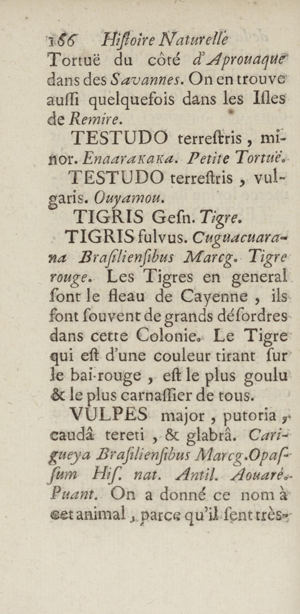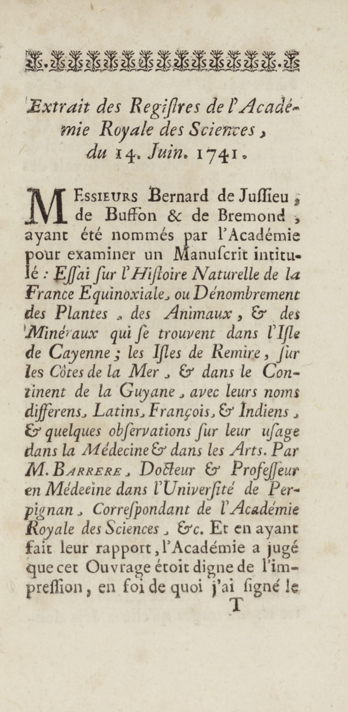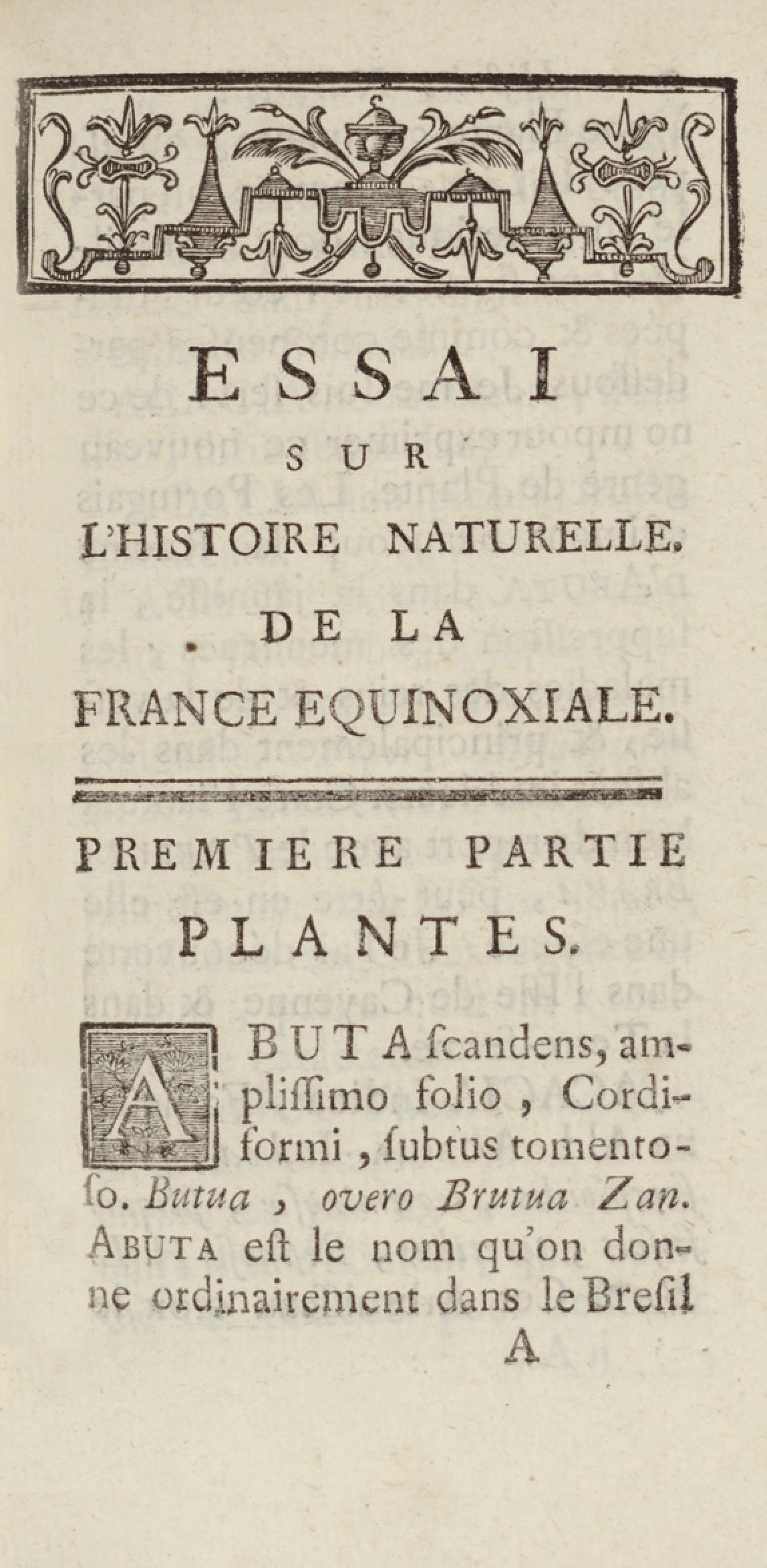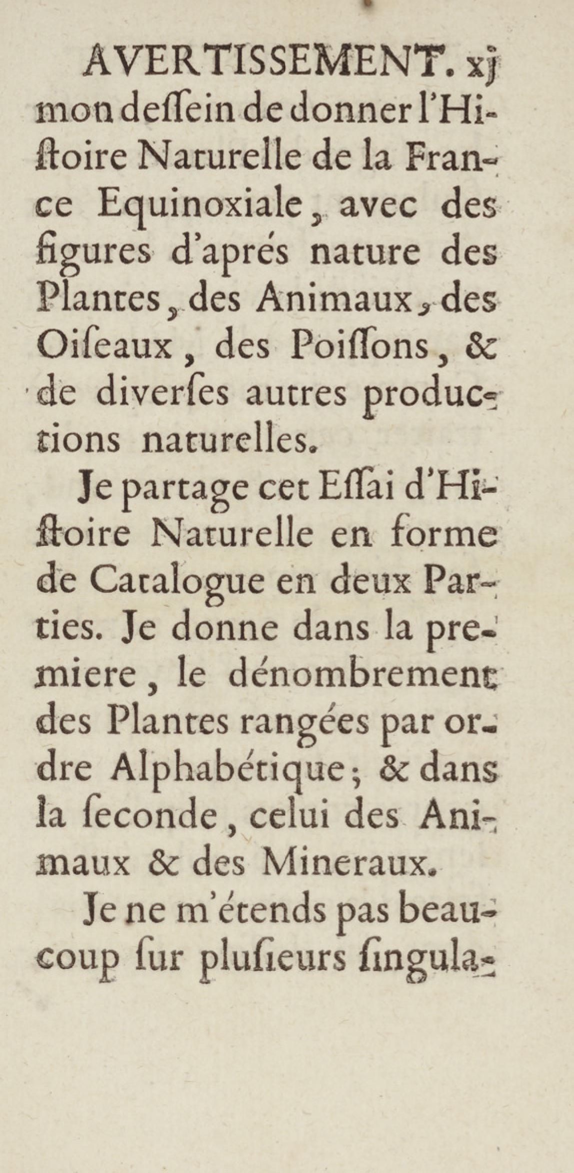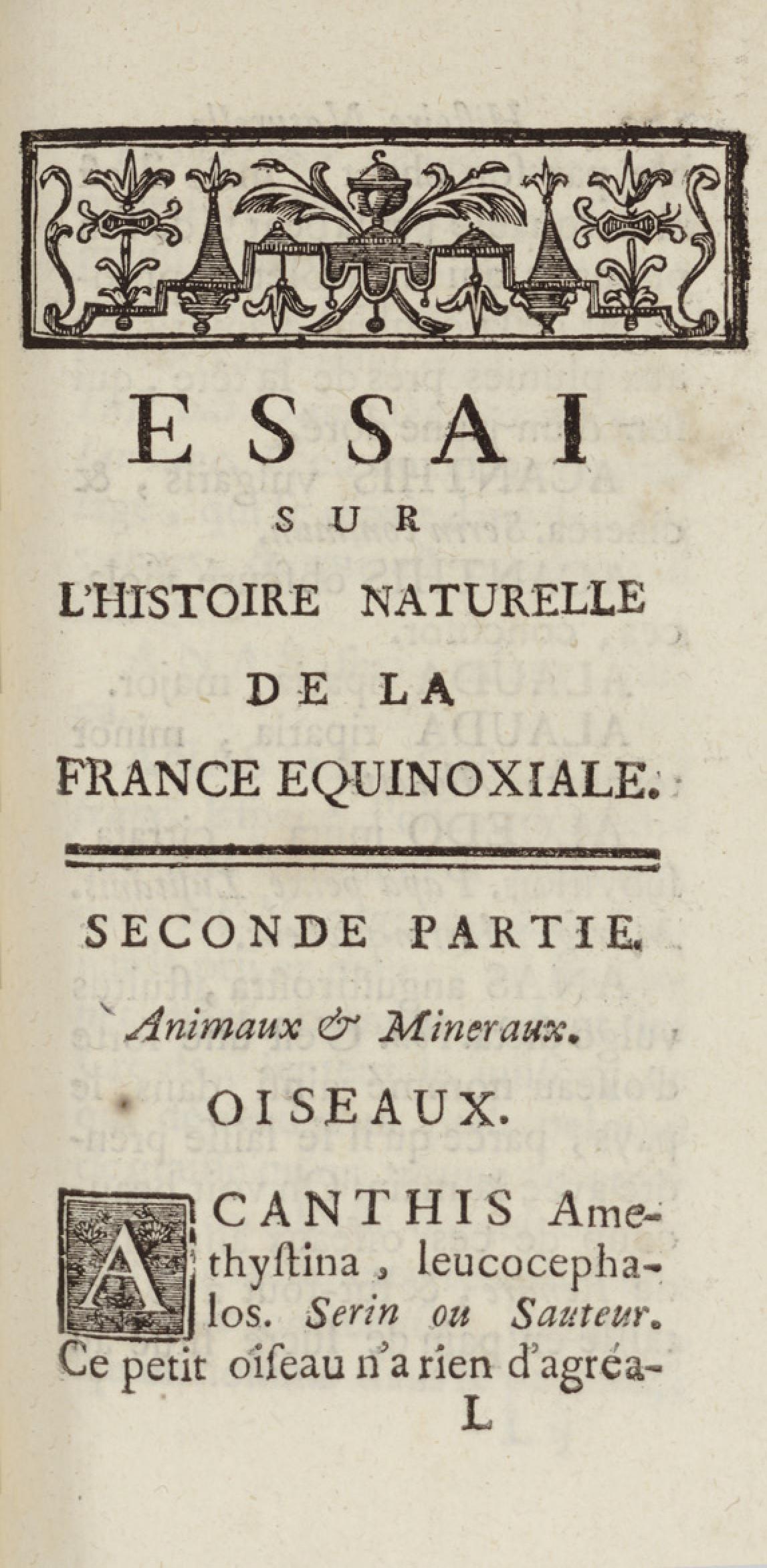 Essai sur l'histoire naturelle de la France équinoxiale, ou Dénombrement des plantes, des animaux, & des minéraux, qui se trouvent dans l'isle de Cayenne, les isles de Remire, sur les côtes de la mer, & dans le continent de la Guyane : avec leurs noms différens, latins, françois, et indiens, et quelques observations sur leur usage dans la médecine & dans les arts