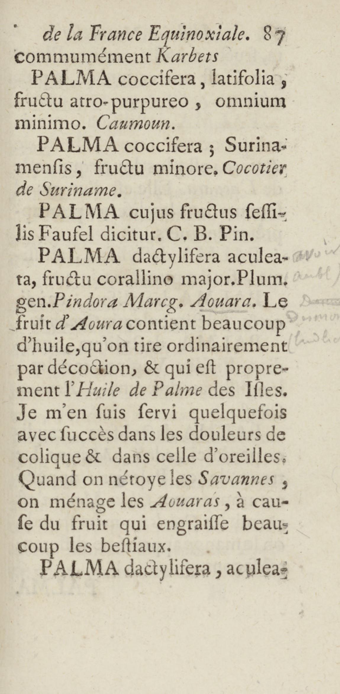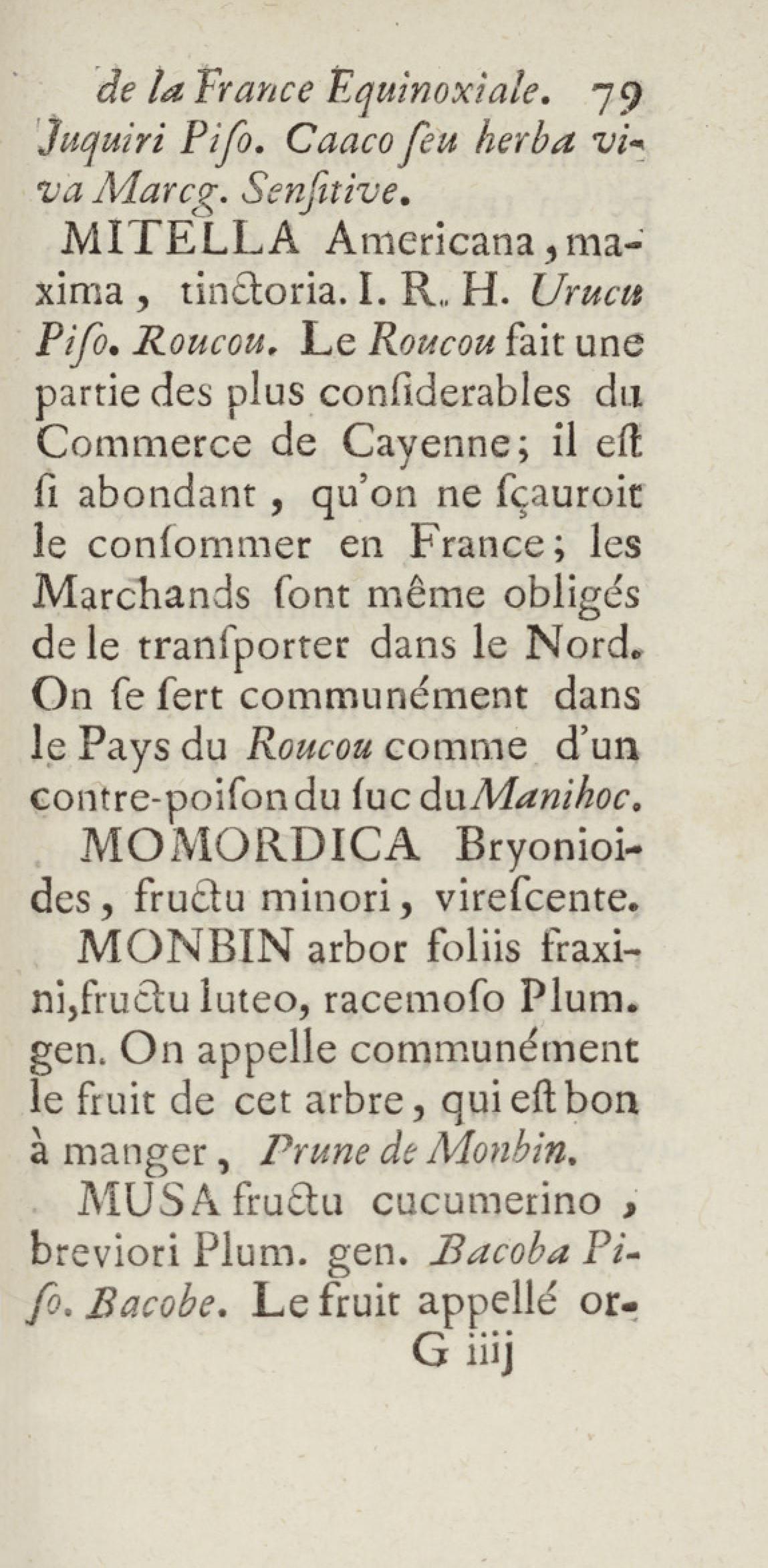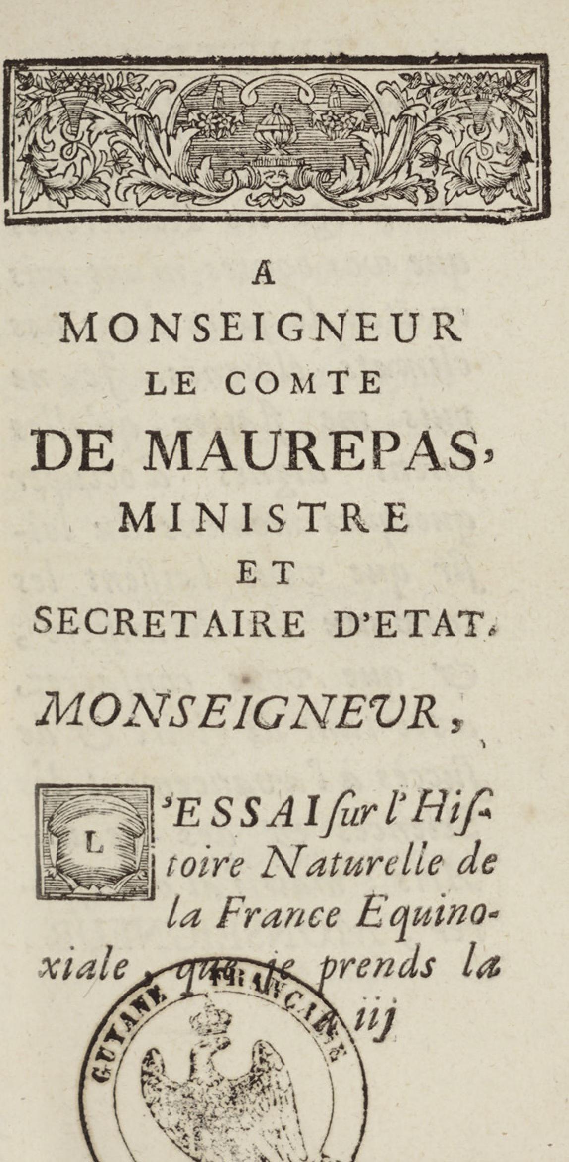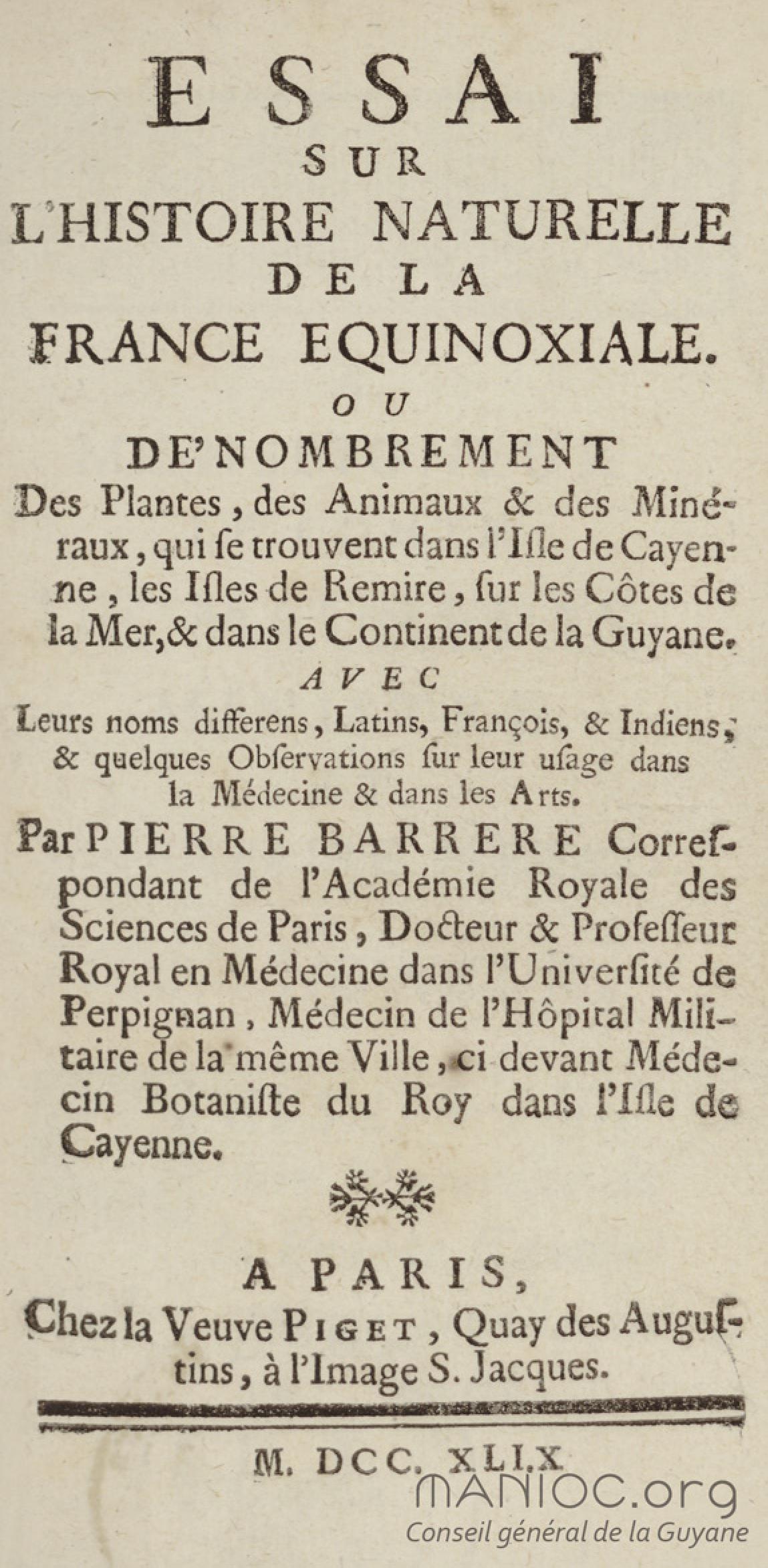- Essai sur l'histoire naturelle de la France équinoxiale, ou Dénombrement des plantes, des animaux, & des minéraux, qui se trouvent dans l'isle de Cayenne, les isles de Remire, sur les côtes de la mer, & dans le continent de la Guyane : avec leurs noms différens, latins, françois, et indiens, et quelques observations sur leur usage dans la médecine & dans les arts